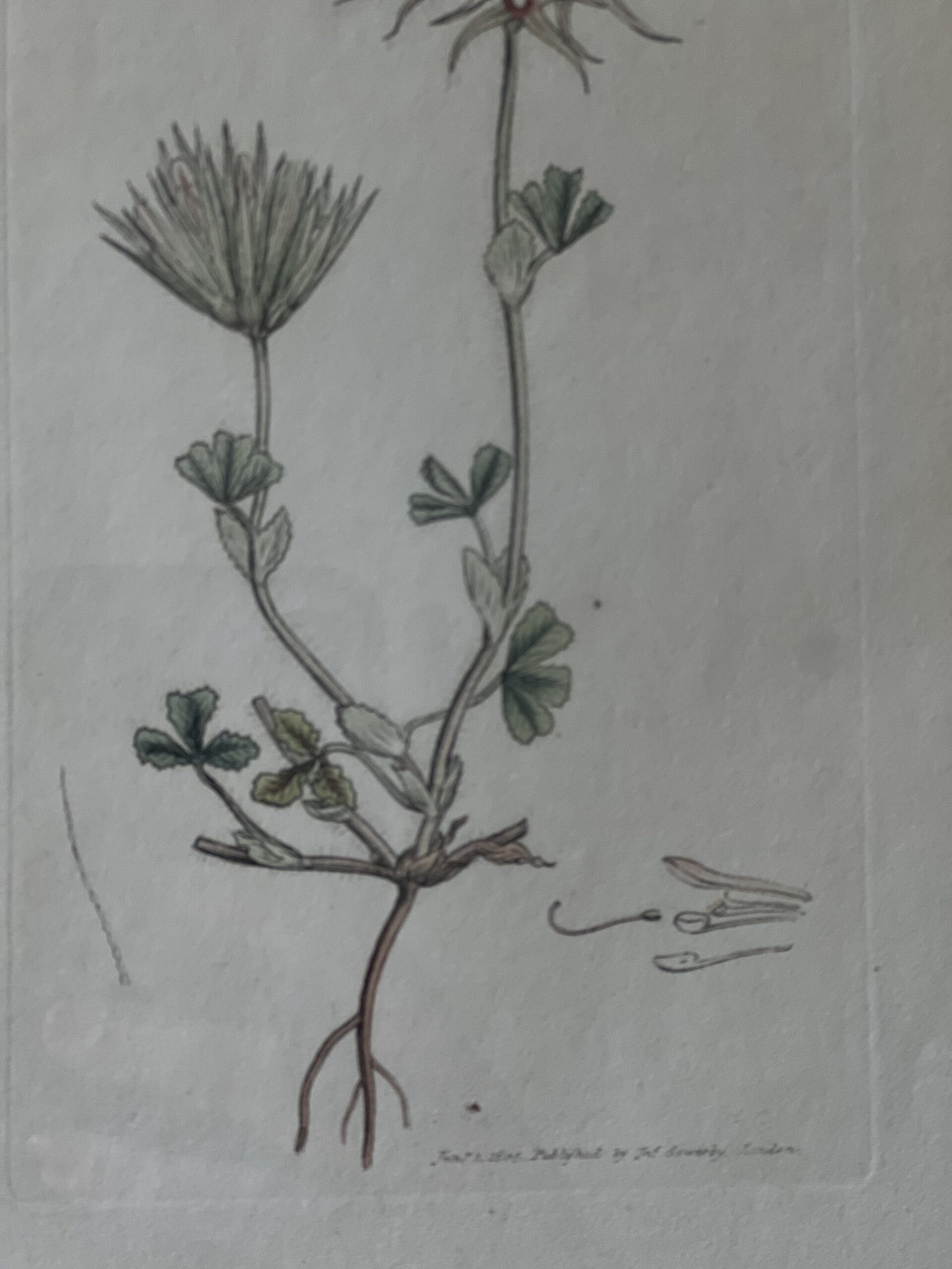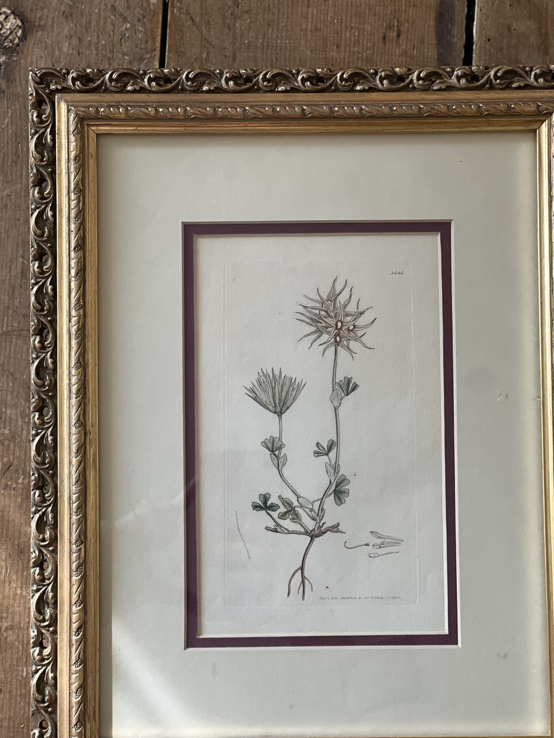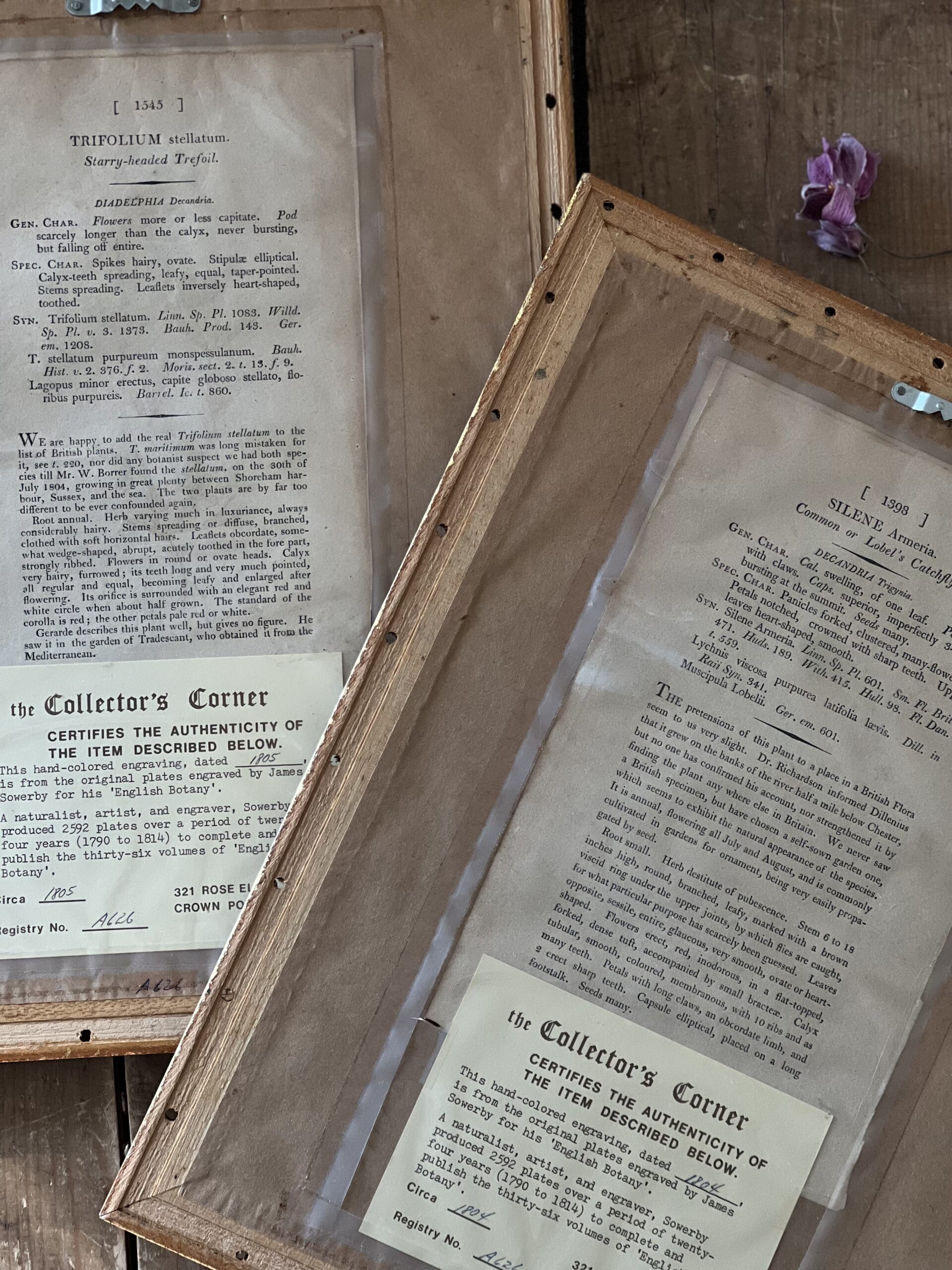 Beautiful pair of hand-colored engravings done by James Sowerby. Dating 1804 and 1805. Common or Lobel’s Catchfly and Starry-Headed Trefoil. A naturalist, artist, and engraver, Sowerby produced 2592 plates over a period of 24 years (1790-1814) to complete and publish the 36 volumes of ‘English Botany.