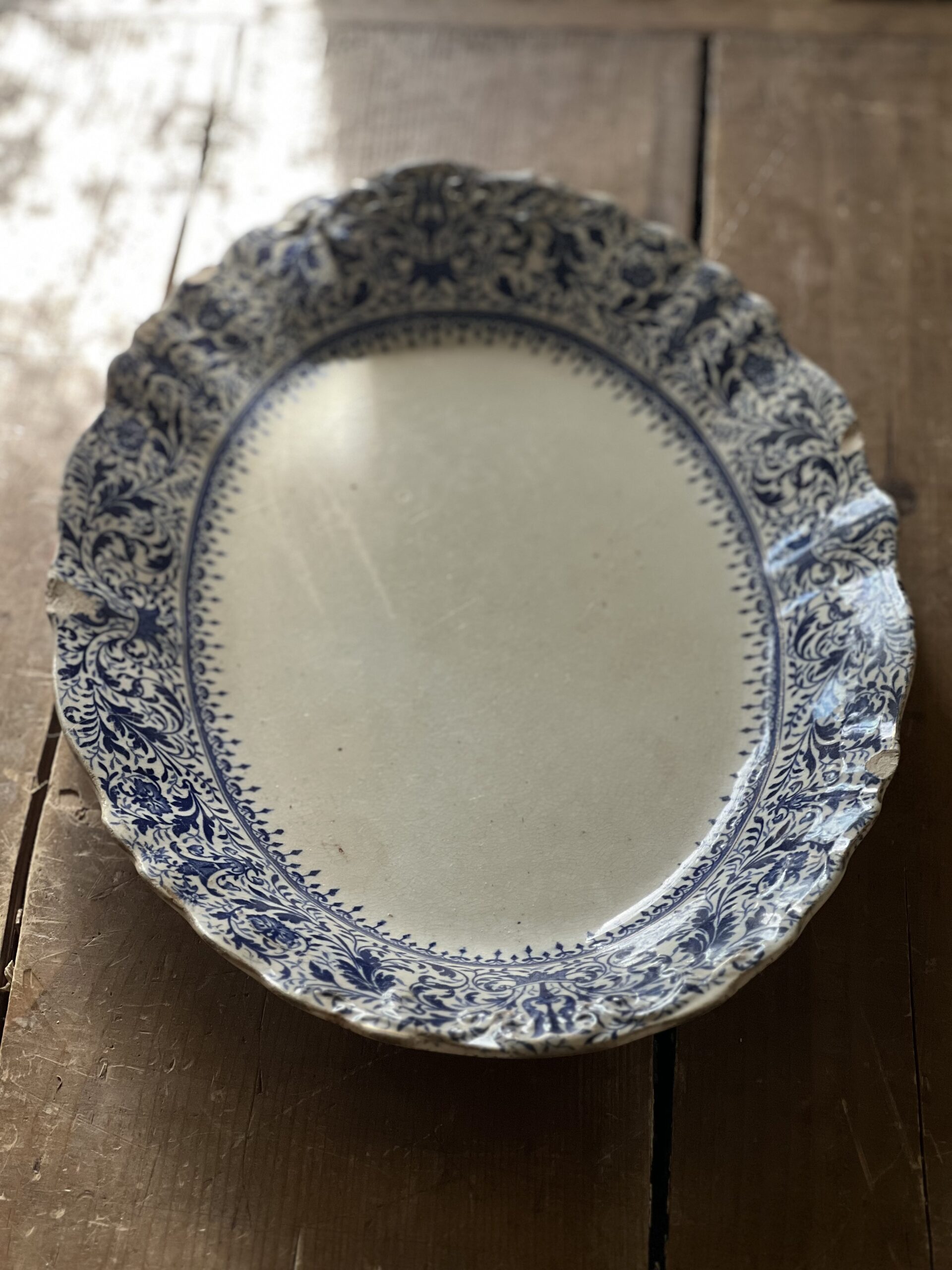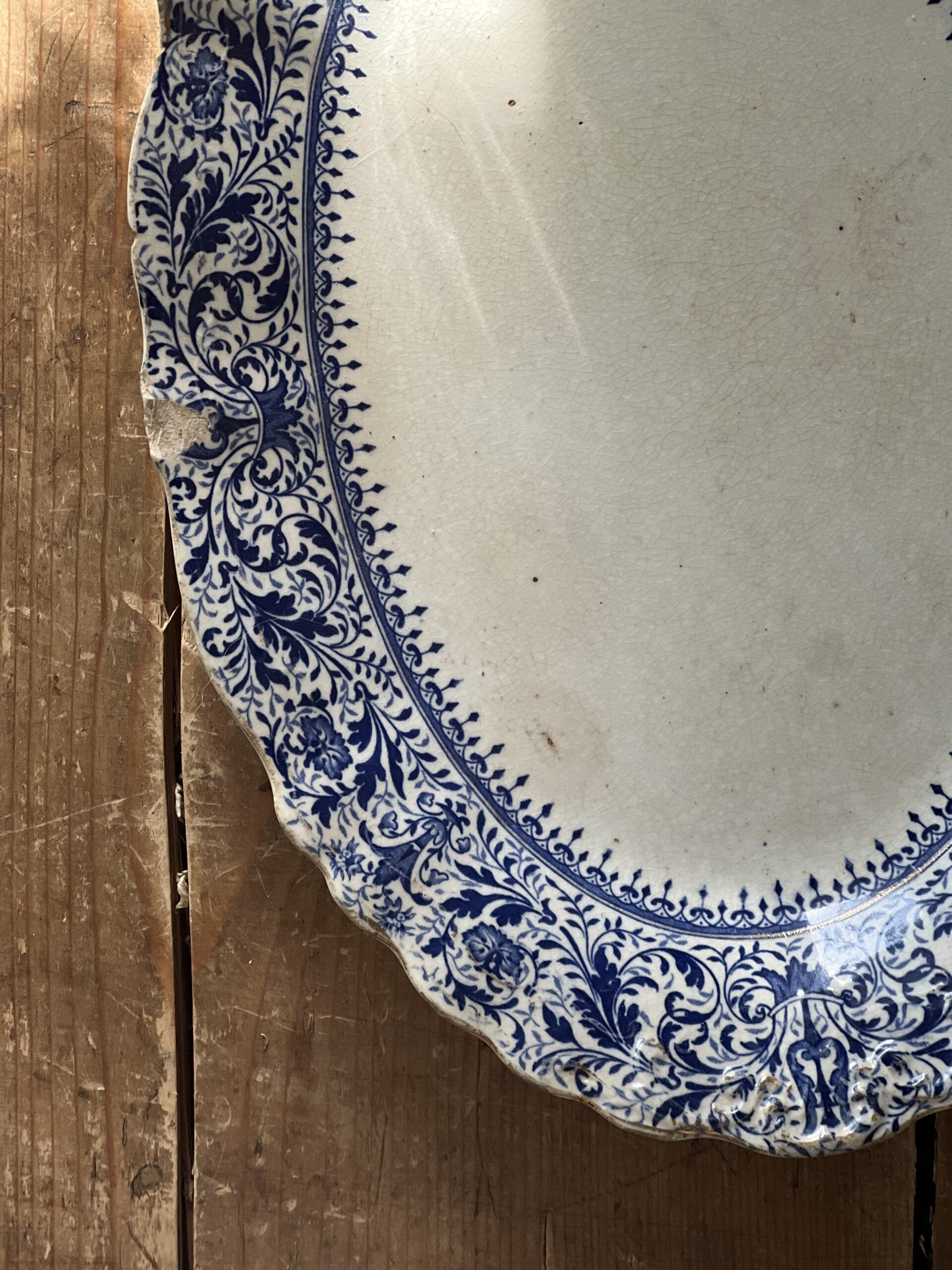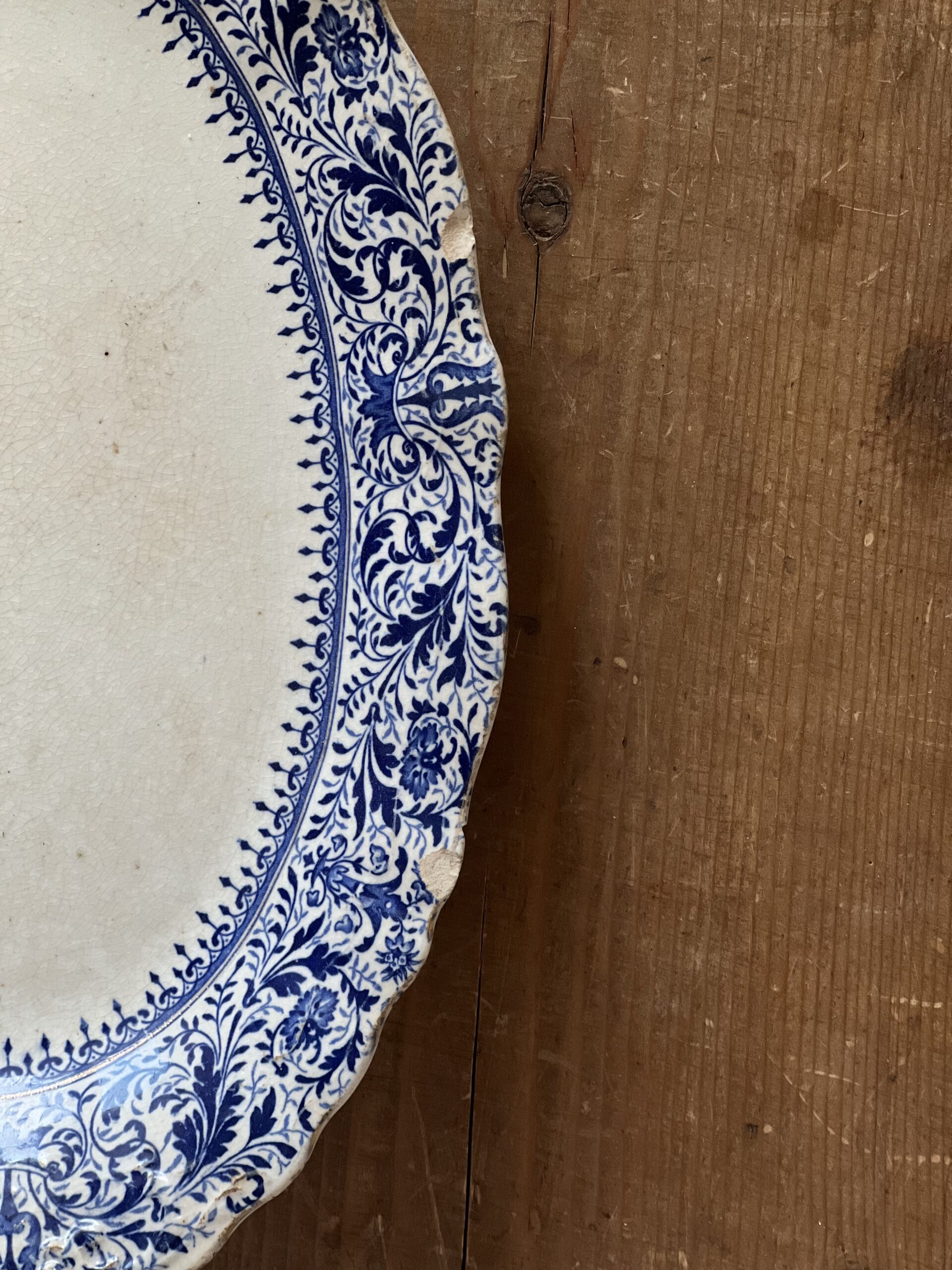 Victorian Henry Alcock semi-porcelain platter with a blue and white Burmese pattern of scrolls and flowers. Oval serving dish with a lovely scalloped rim. Dish has a few chips along the rim. Staining and crazing are present.