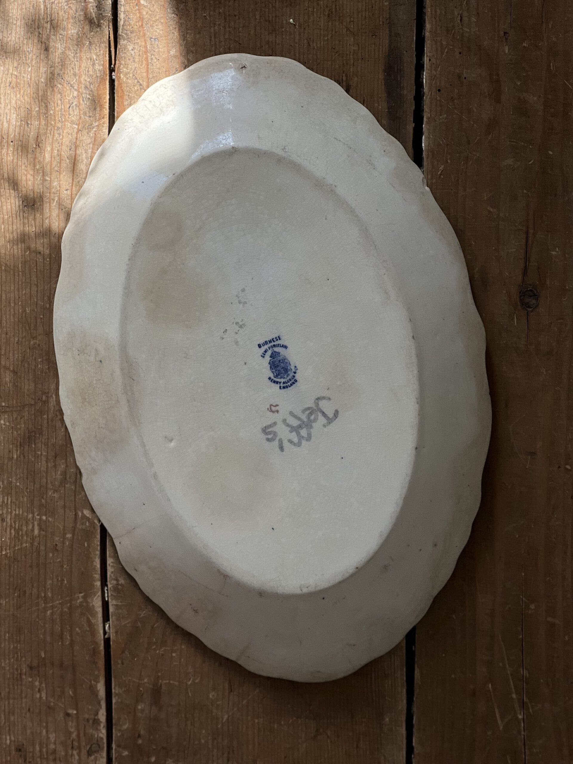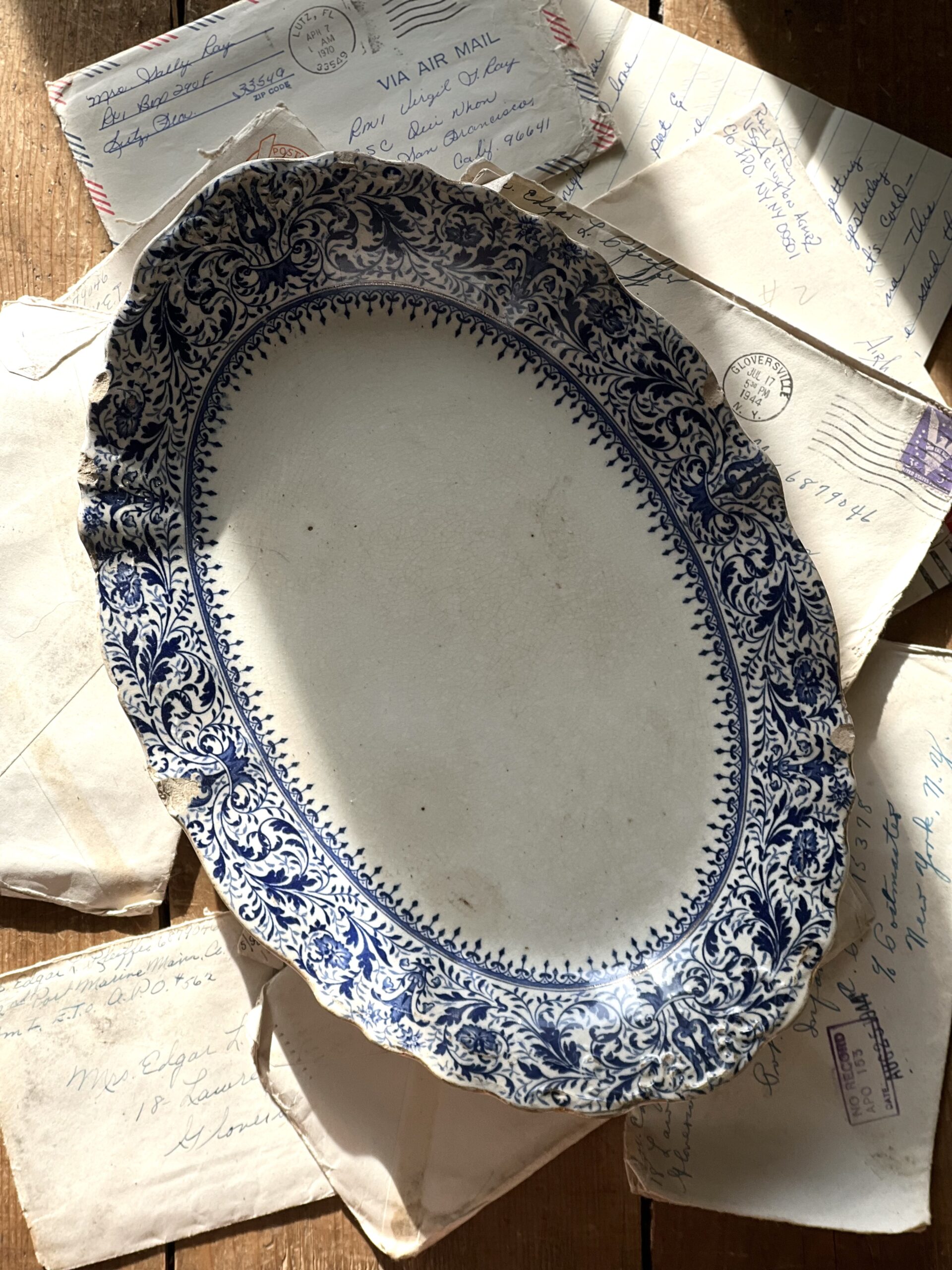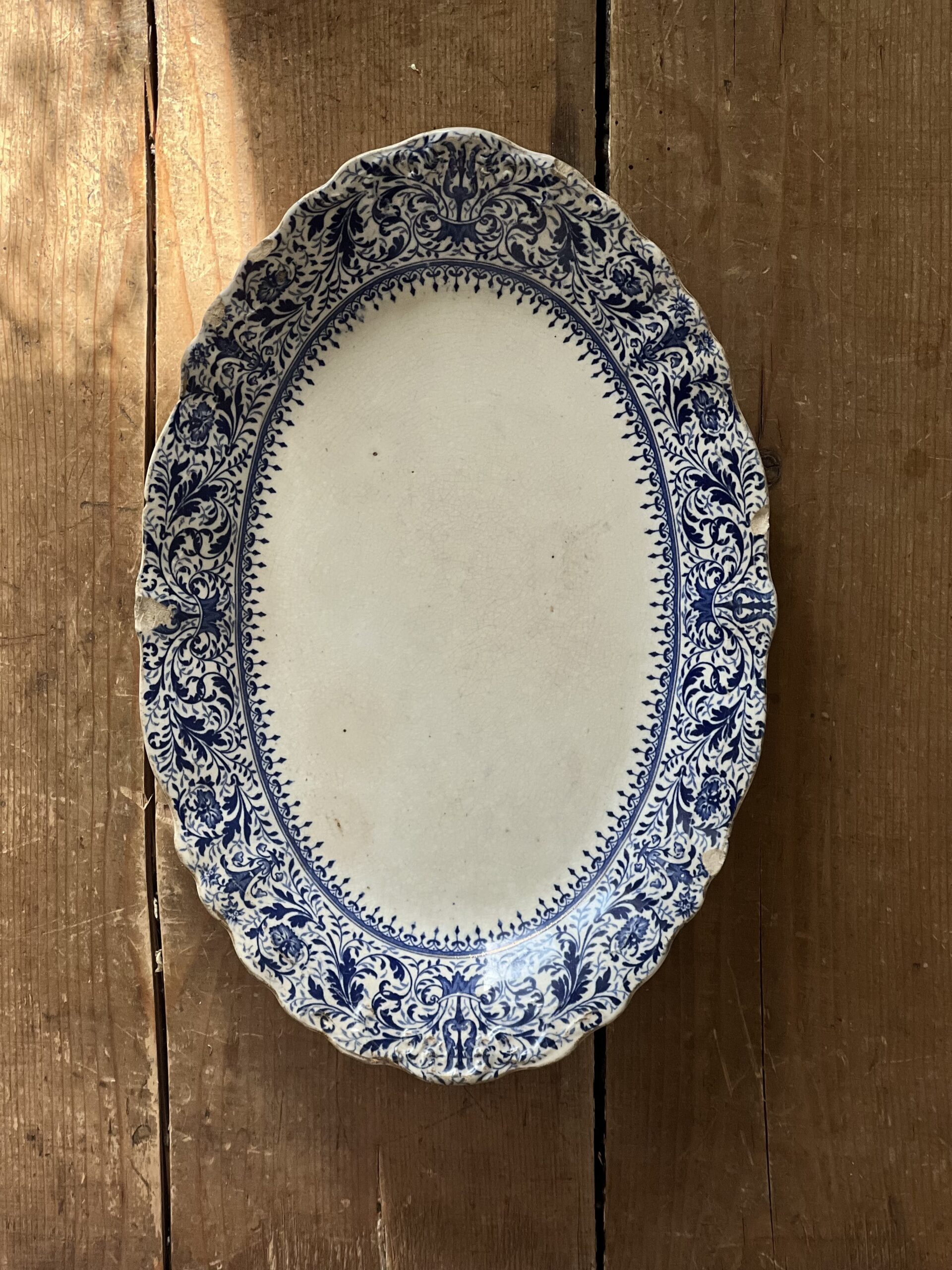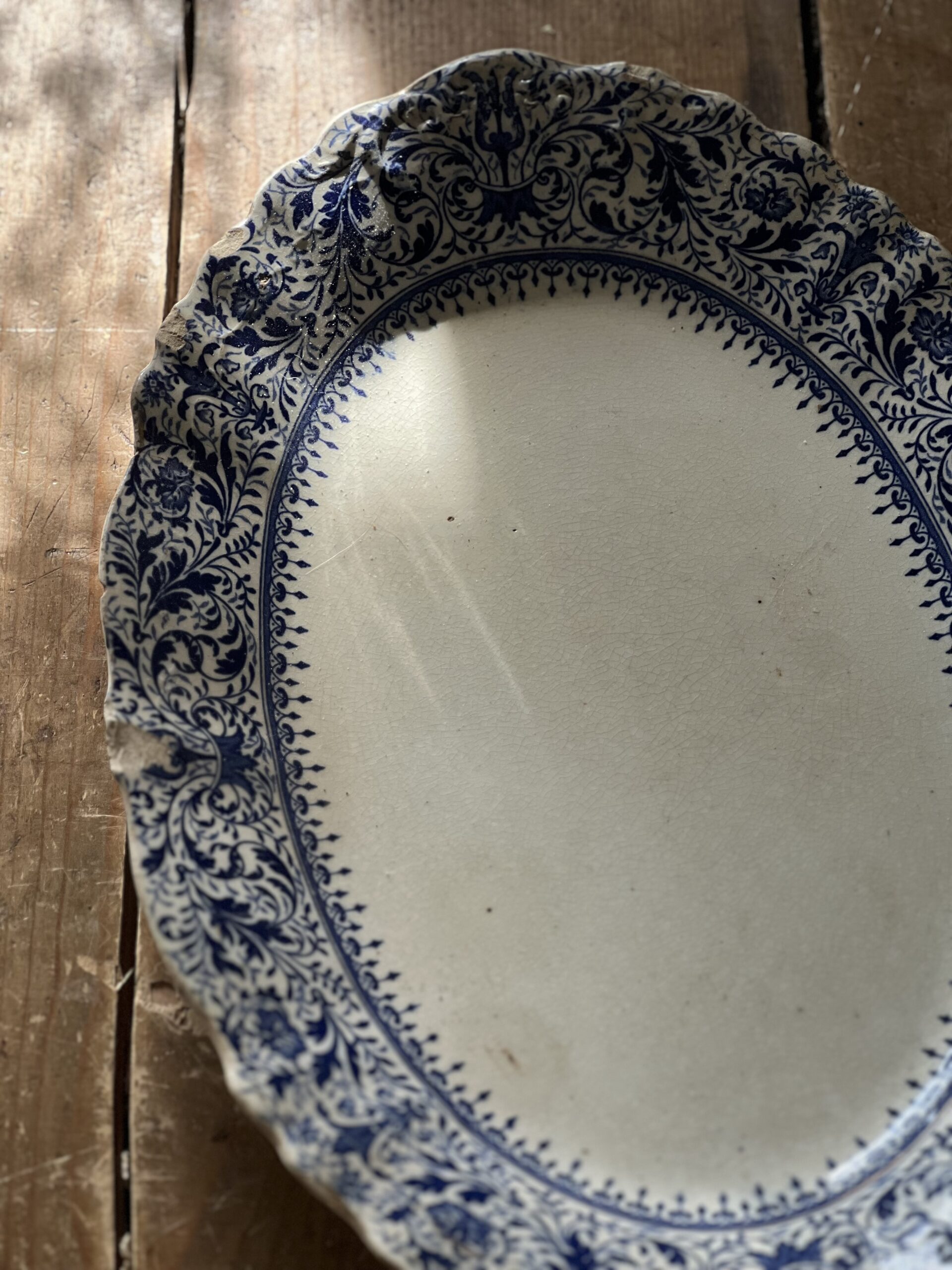 Victorian Henry Alcock semi-porcelain platter with a blue and white Burmese pattern of scrolls and flowers. Oval serving dish with a lovely scalloped rim. Dish has a few chips along the rim. Staining and crazing are present.