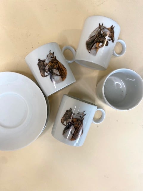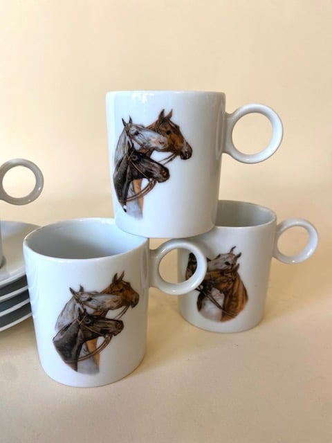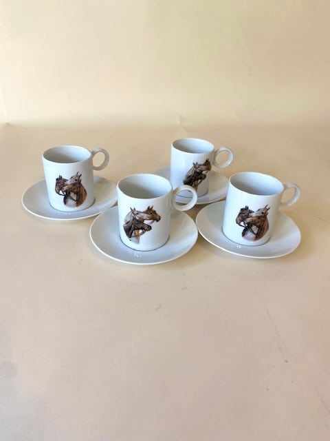 Set of four horse espresso set. Includes 4 cups and 4 saucers. Would look beautiful styled on kitchen shelves, very English style