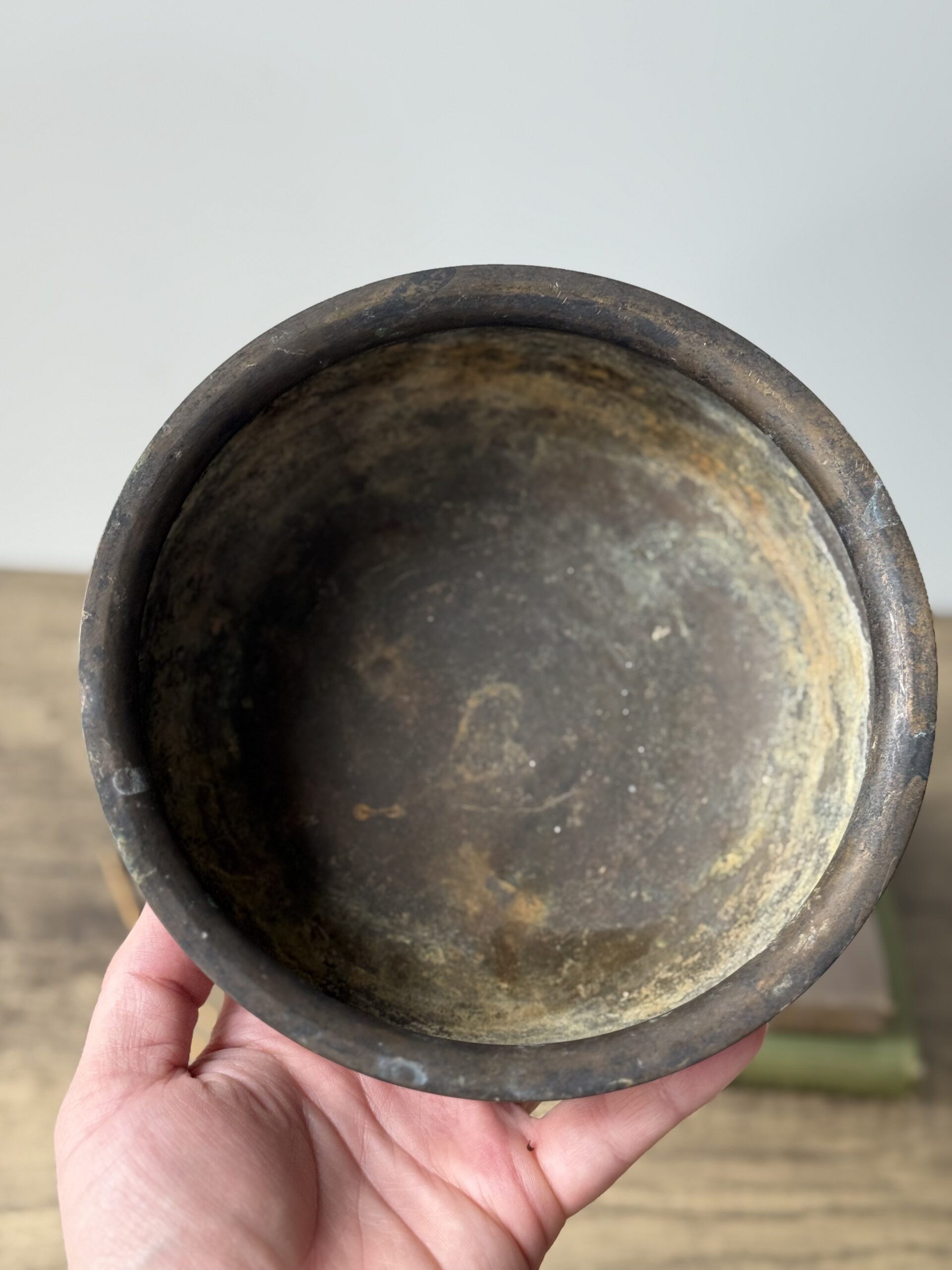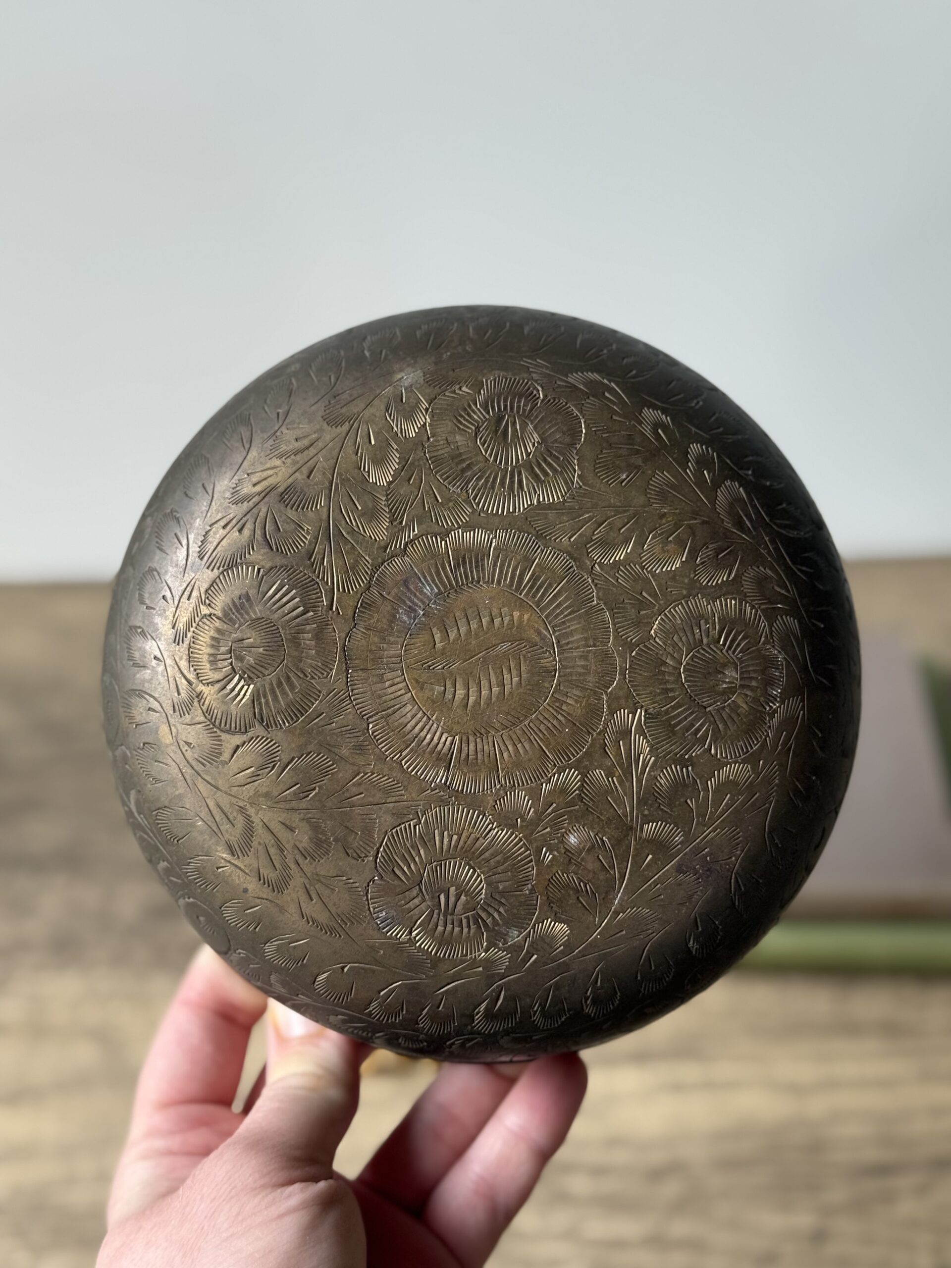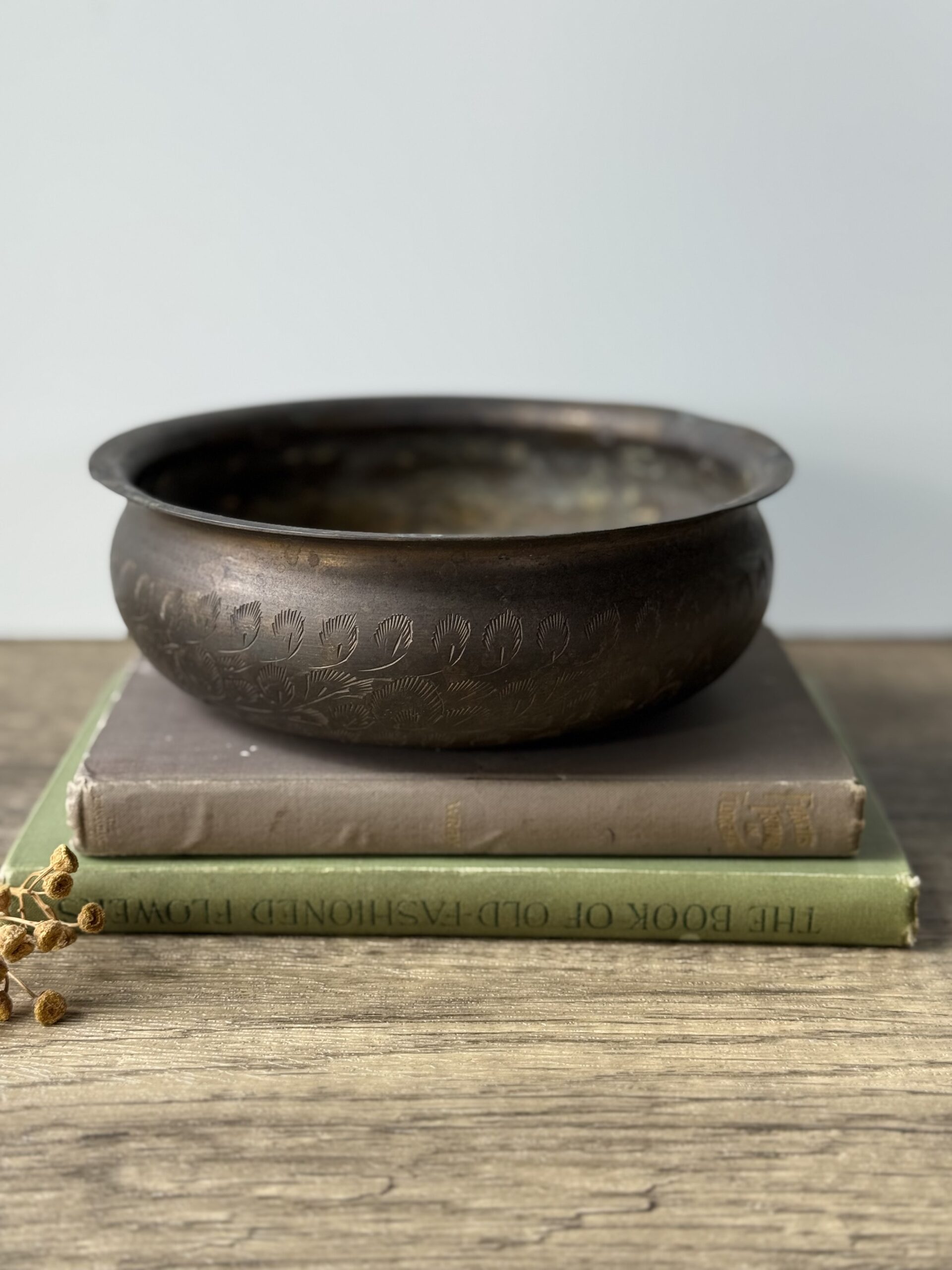 Pretty Etched brass bowl. Could be used to hold a plant, display on a shelf or to use as a catchall. Lots of patina and some tarnishing on the interior.