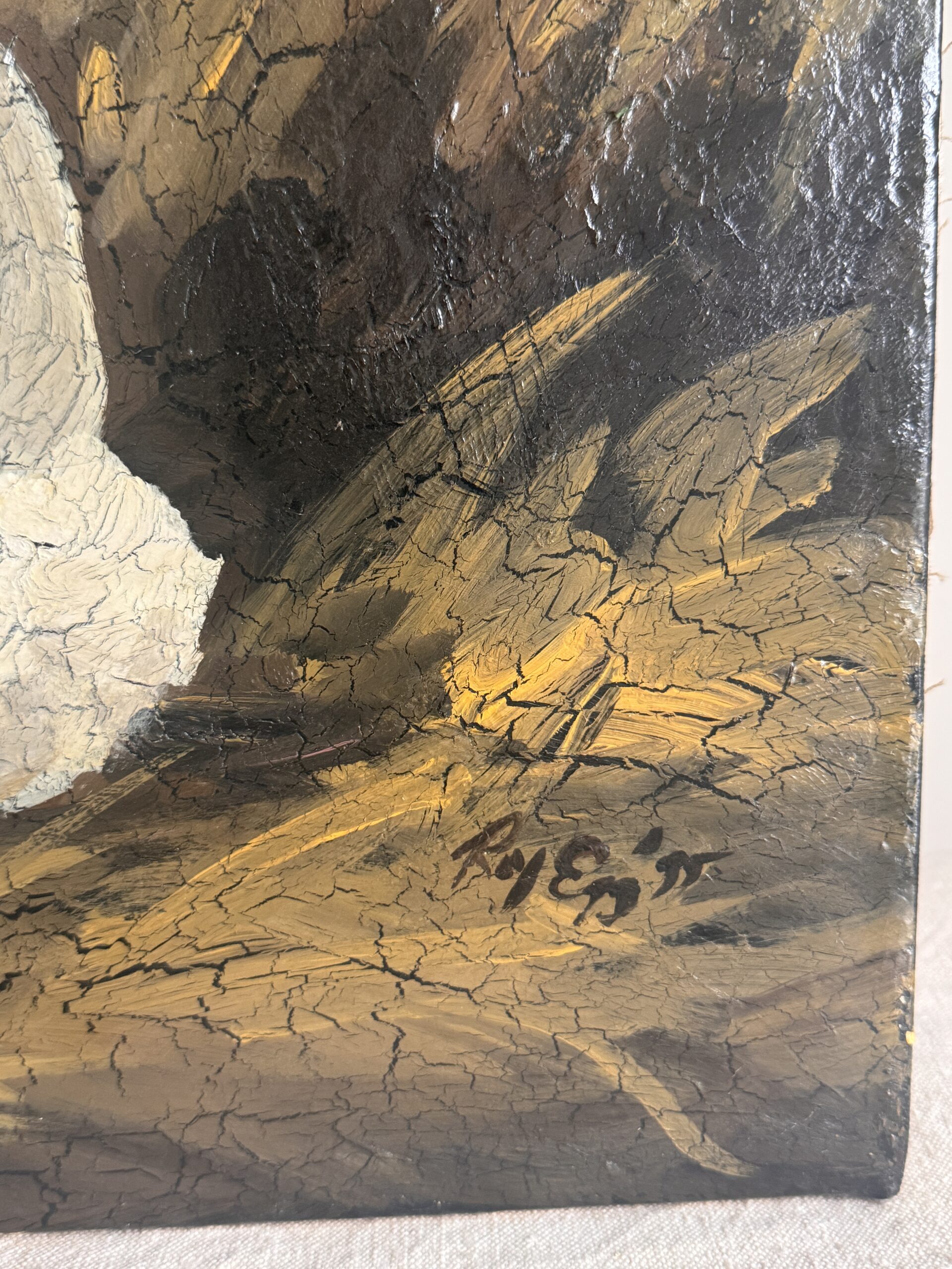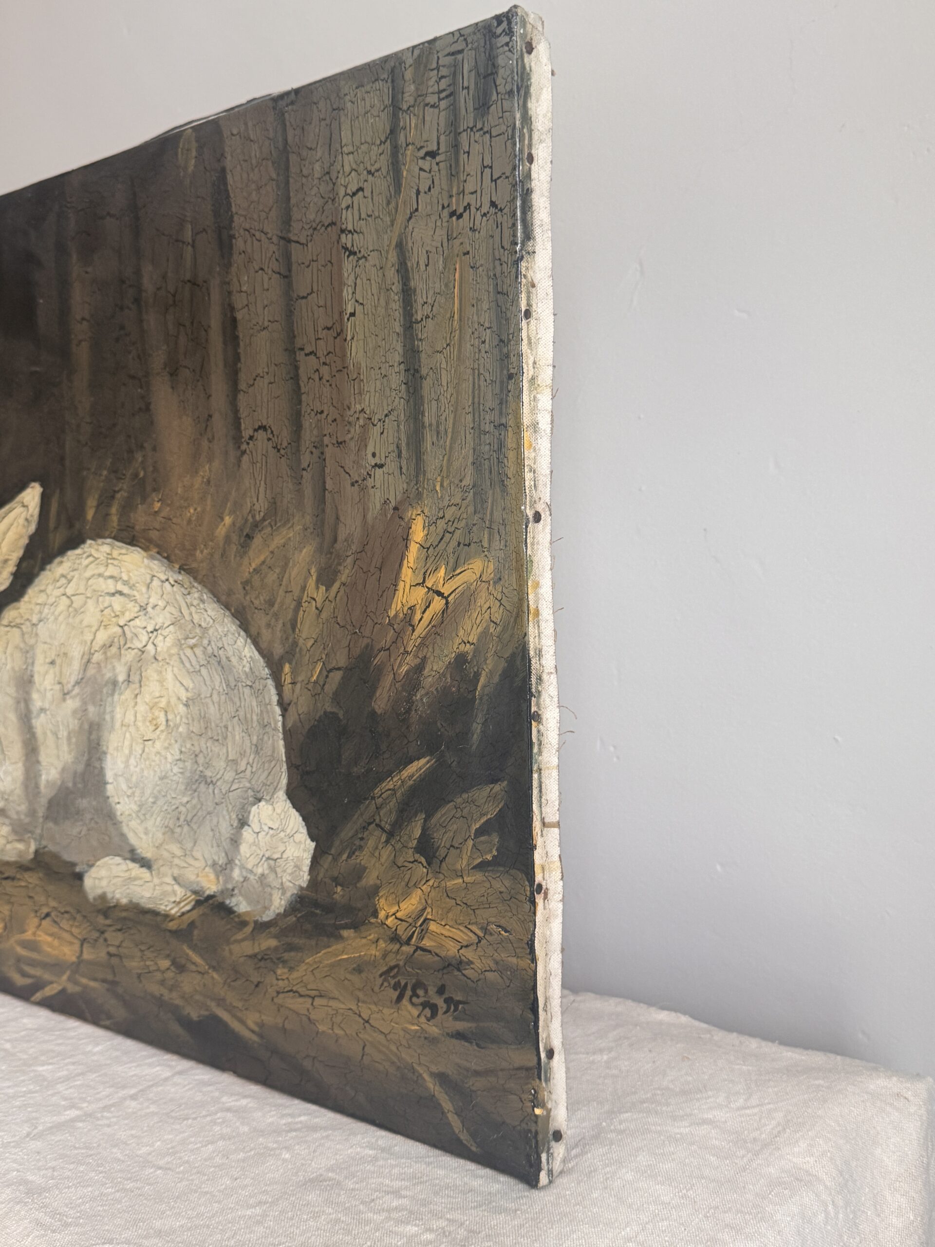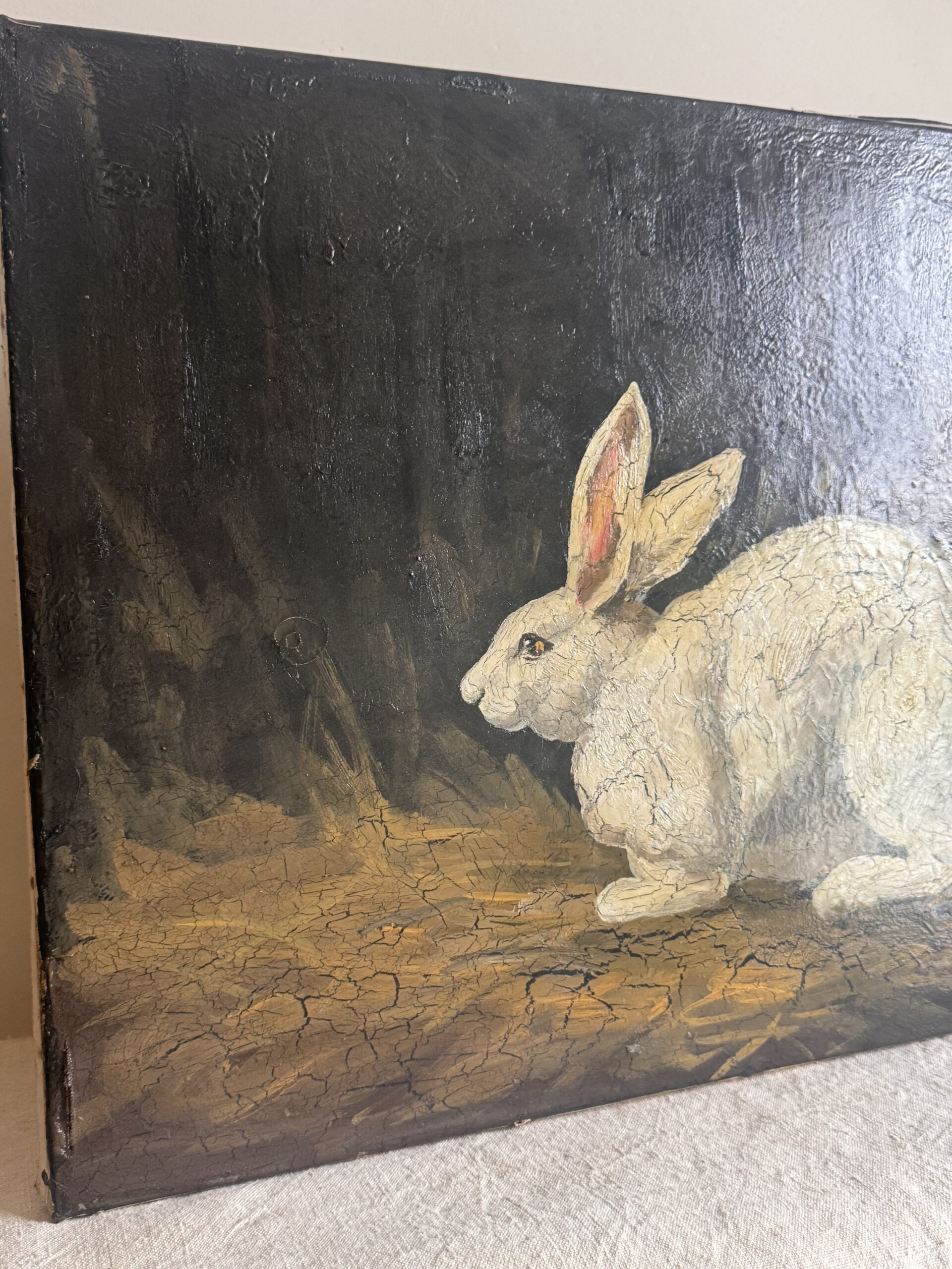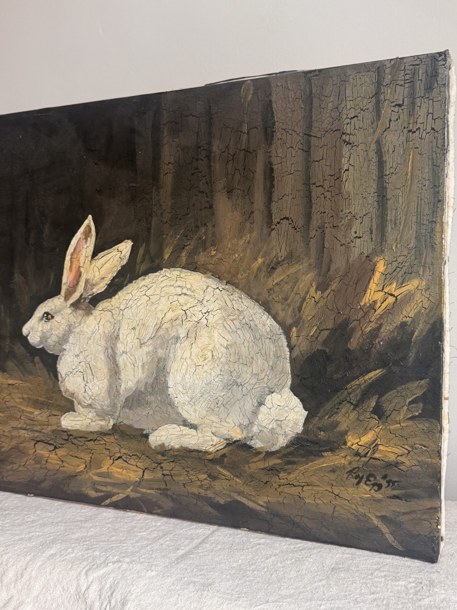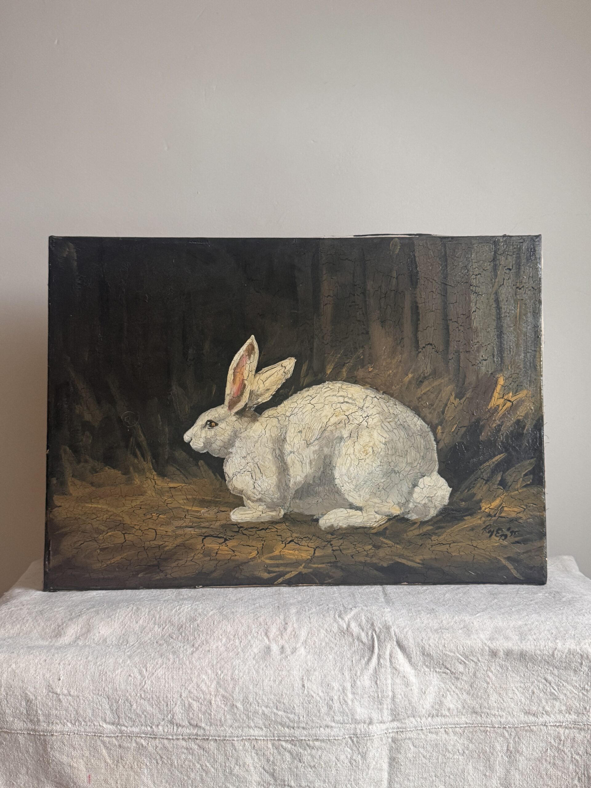 A soulful original painting of a white rabbit by celebrated folk artist Roy Egg, signed and dated 1995. Set against a dark, moody ground, the rabbit is rendered with expressive texture and crackled surface detail, giving the work a sense of stillness, watchfulness, and quiet gravity.