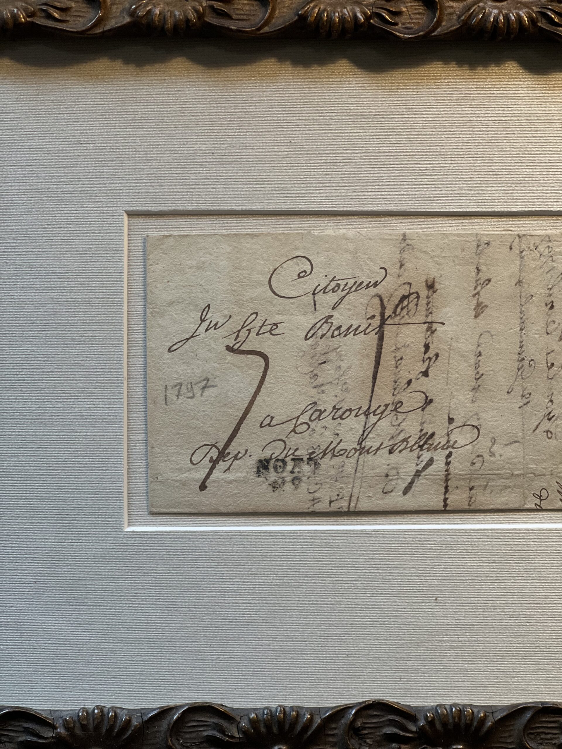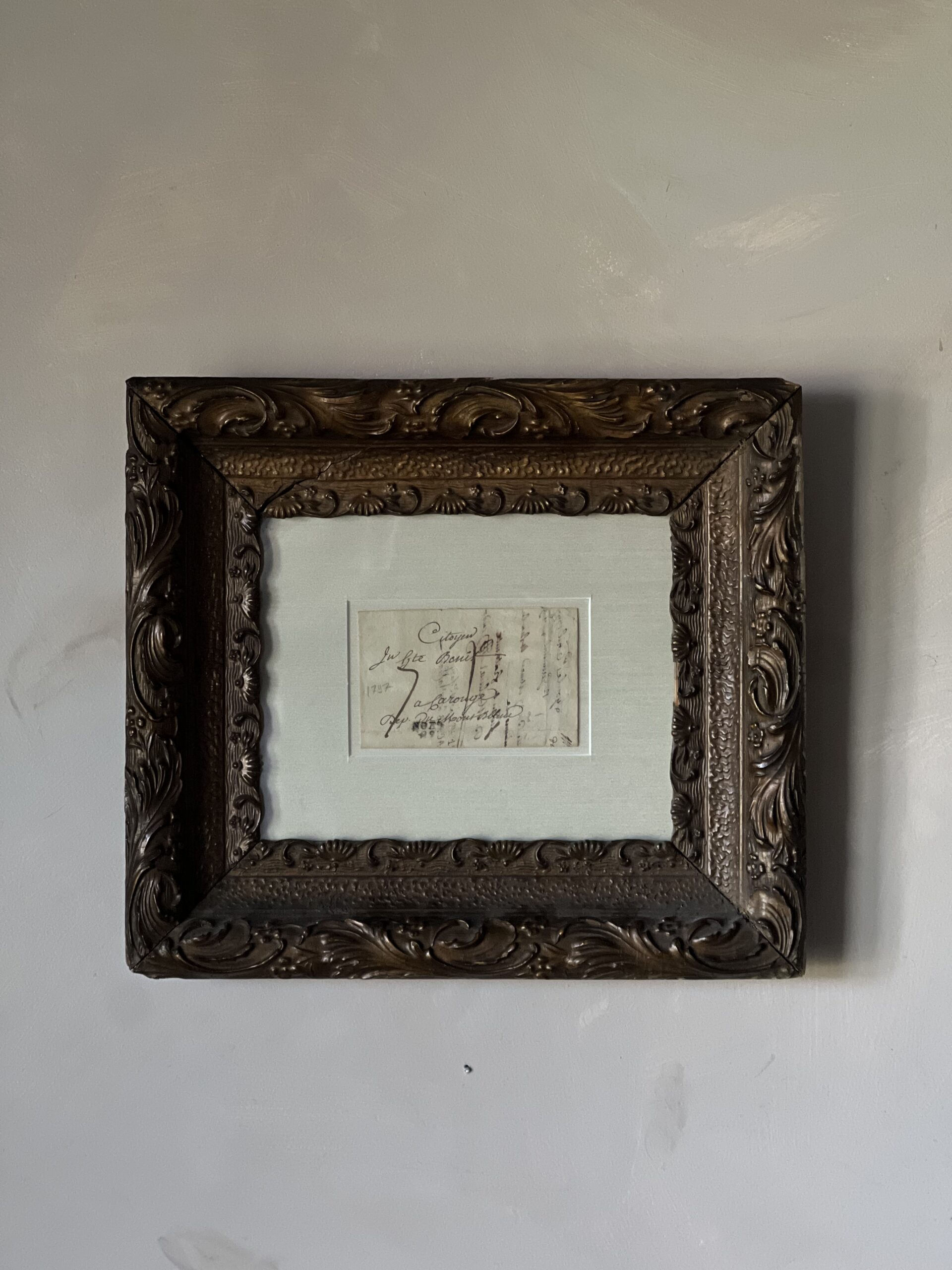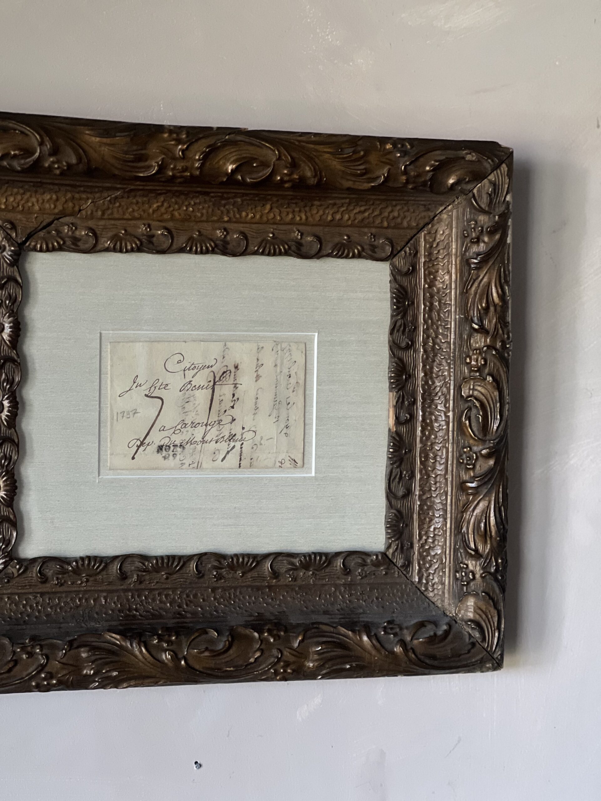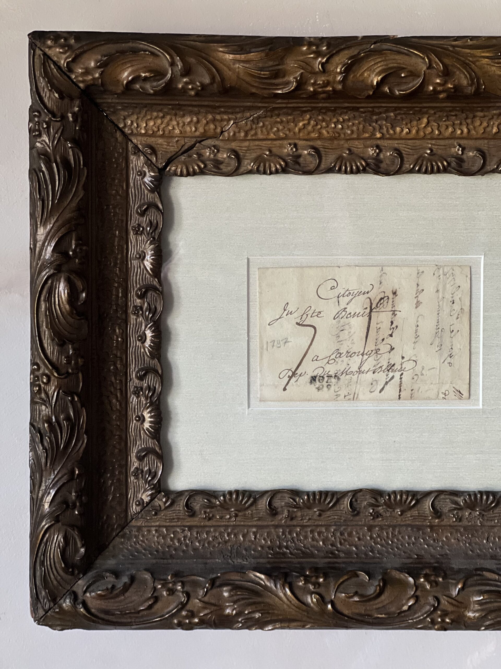 Framed French calligraphy folded letter that dates from 1797 during the French Revolution. Beautiful aged paper with warm, creamy tones matted against a sandy silk matting. Framed in a beautifully ornate wood and gesso frame with a rich bronzed finish. The frame has an old crack in the upper left corner, but it is still very sturdy, with spots of missing gesso. A gorgeous European piece of history to elevate any space.