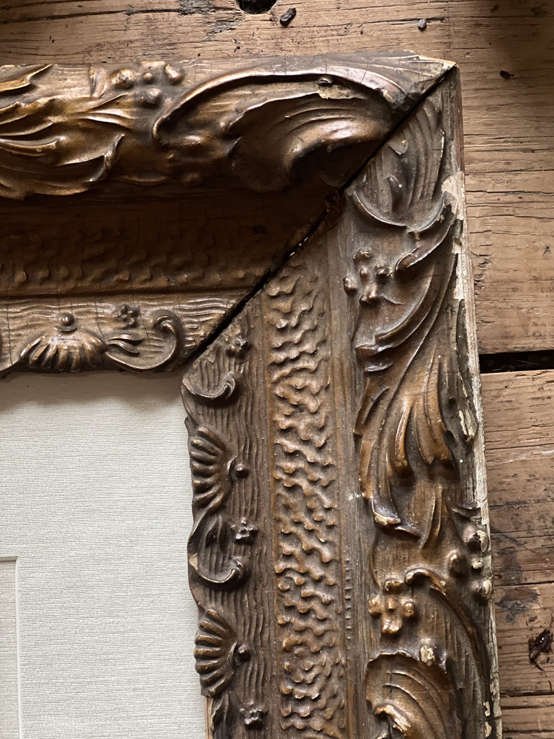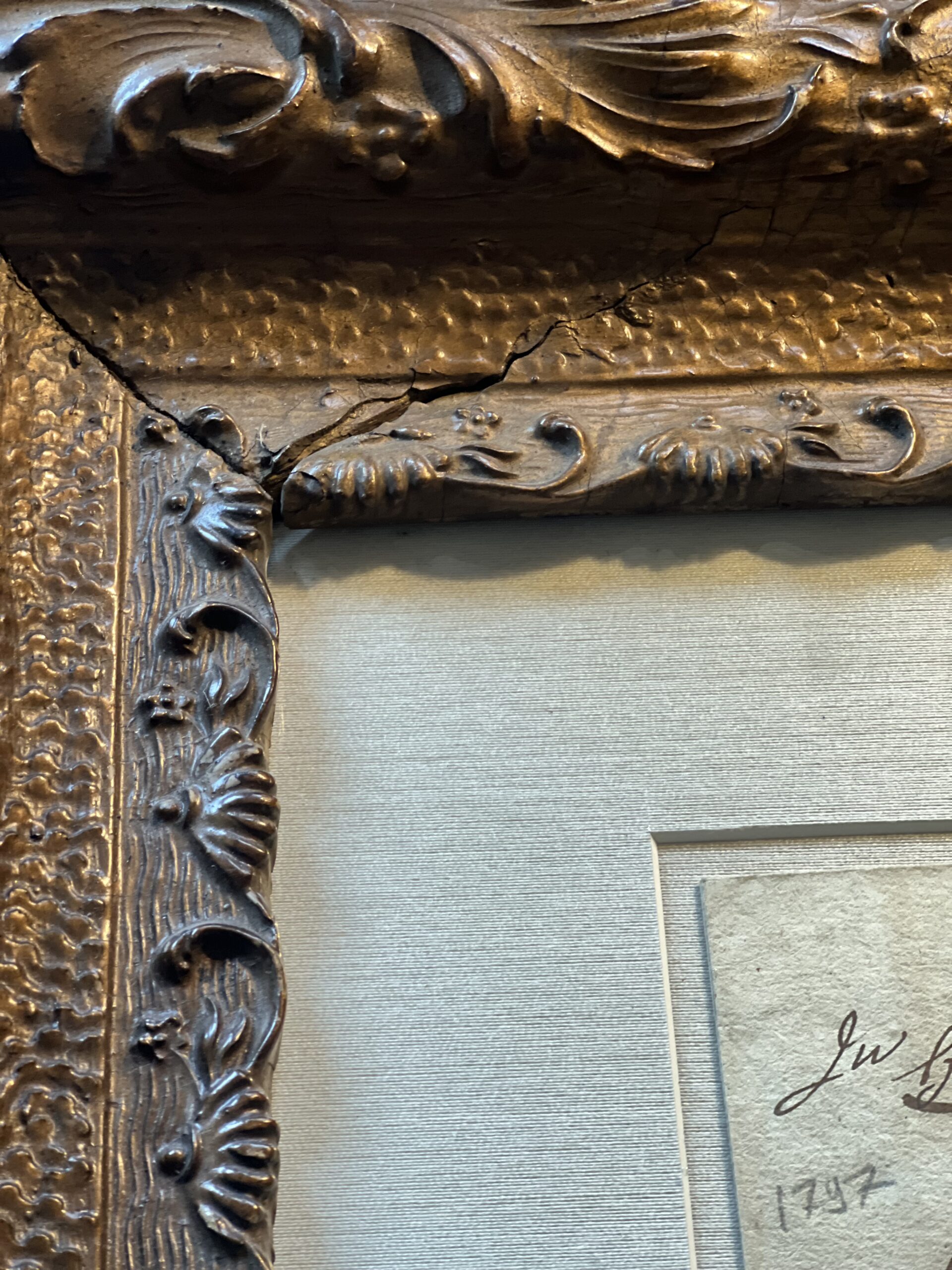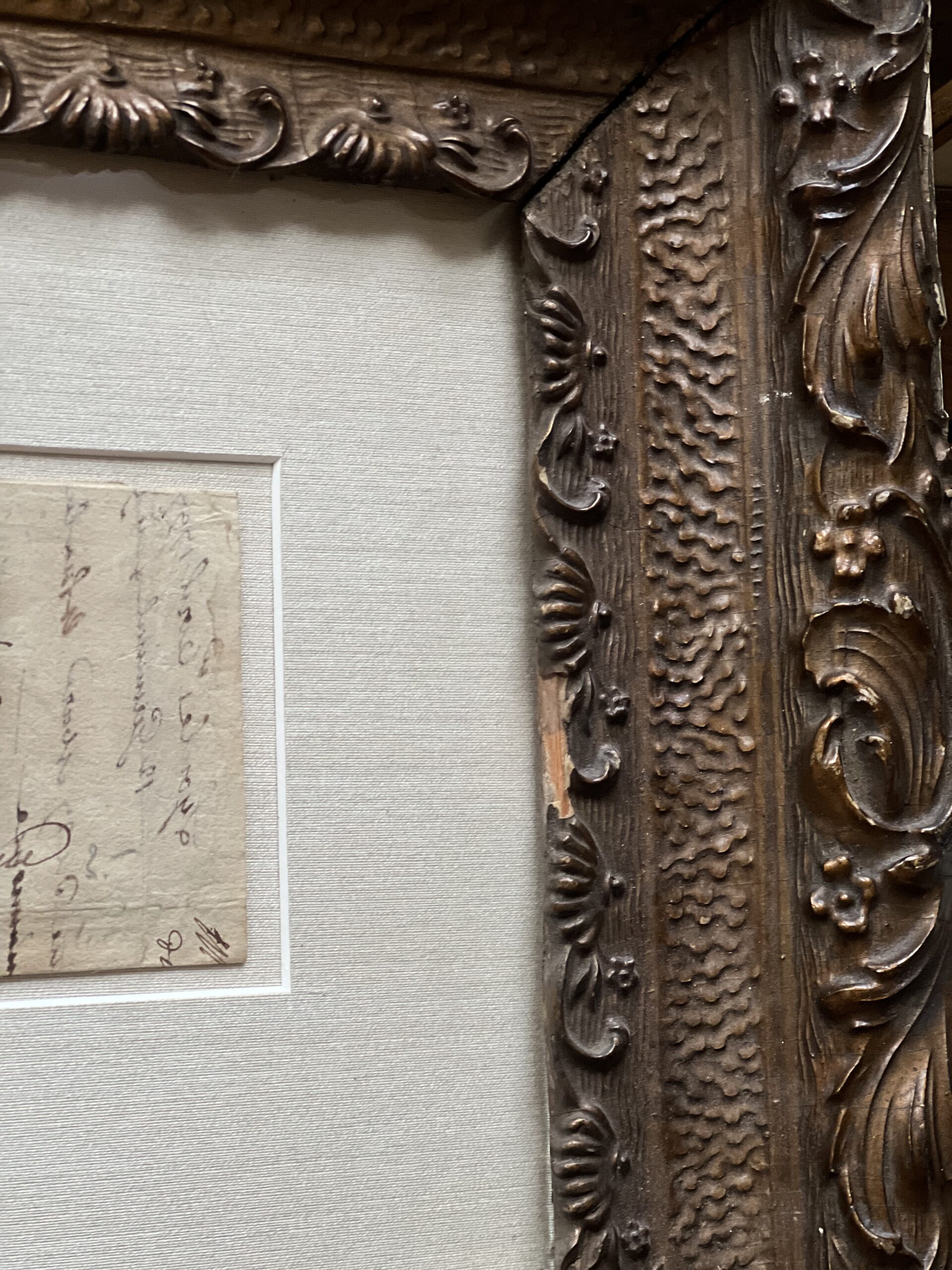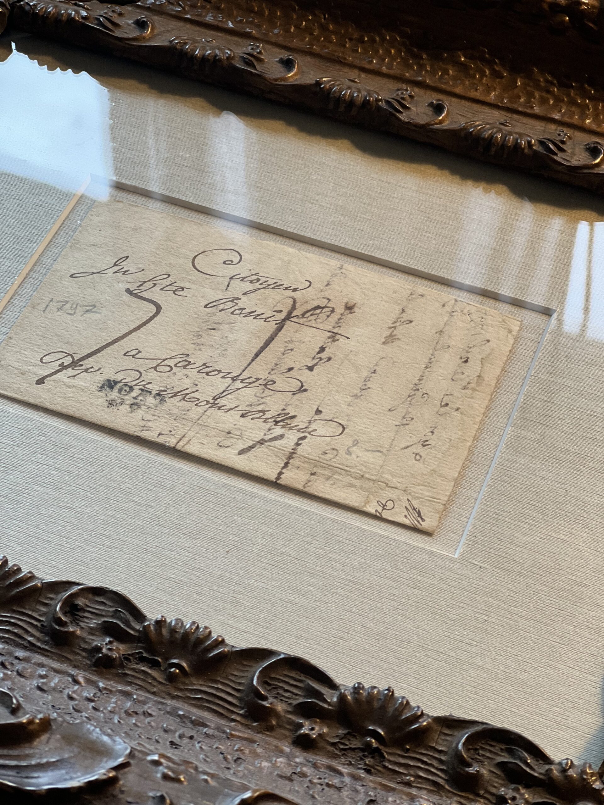 Framed French calligraphy folded letter that dates from 1797 during the French Revolution. Beautiful aged paper with warm, creamy tones matted against a sandy silk matting. Framed in a beautifully ornate wood and gesso frame with a rich bronzed finish. The frame has an old crack in the upper left corner, but it is still very sturdy, with spots of missing gesso. A gorgeous European piece of history to elevate any space.