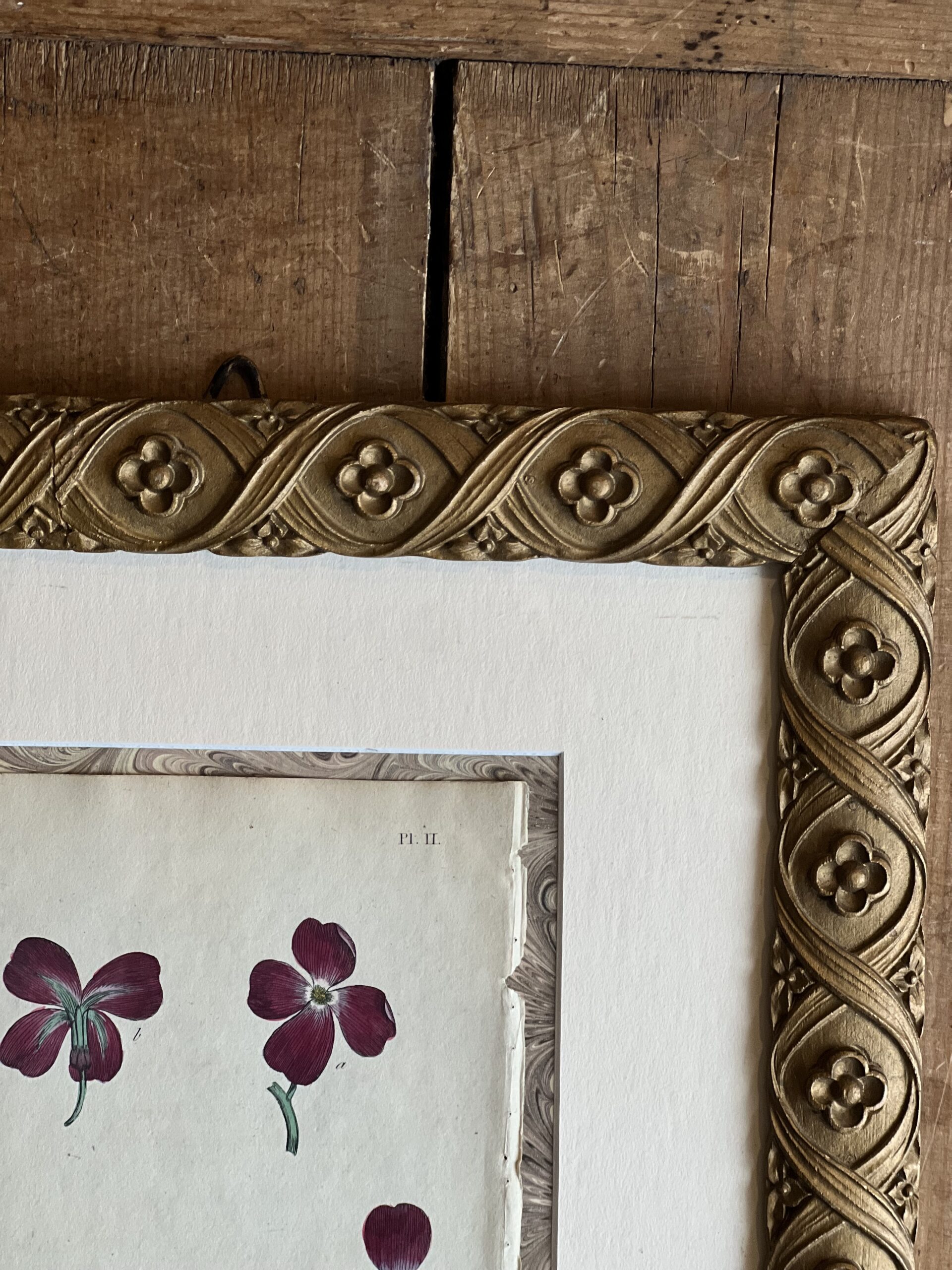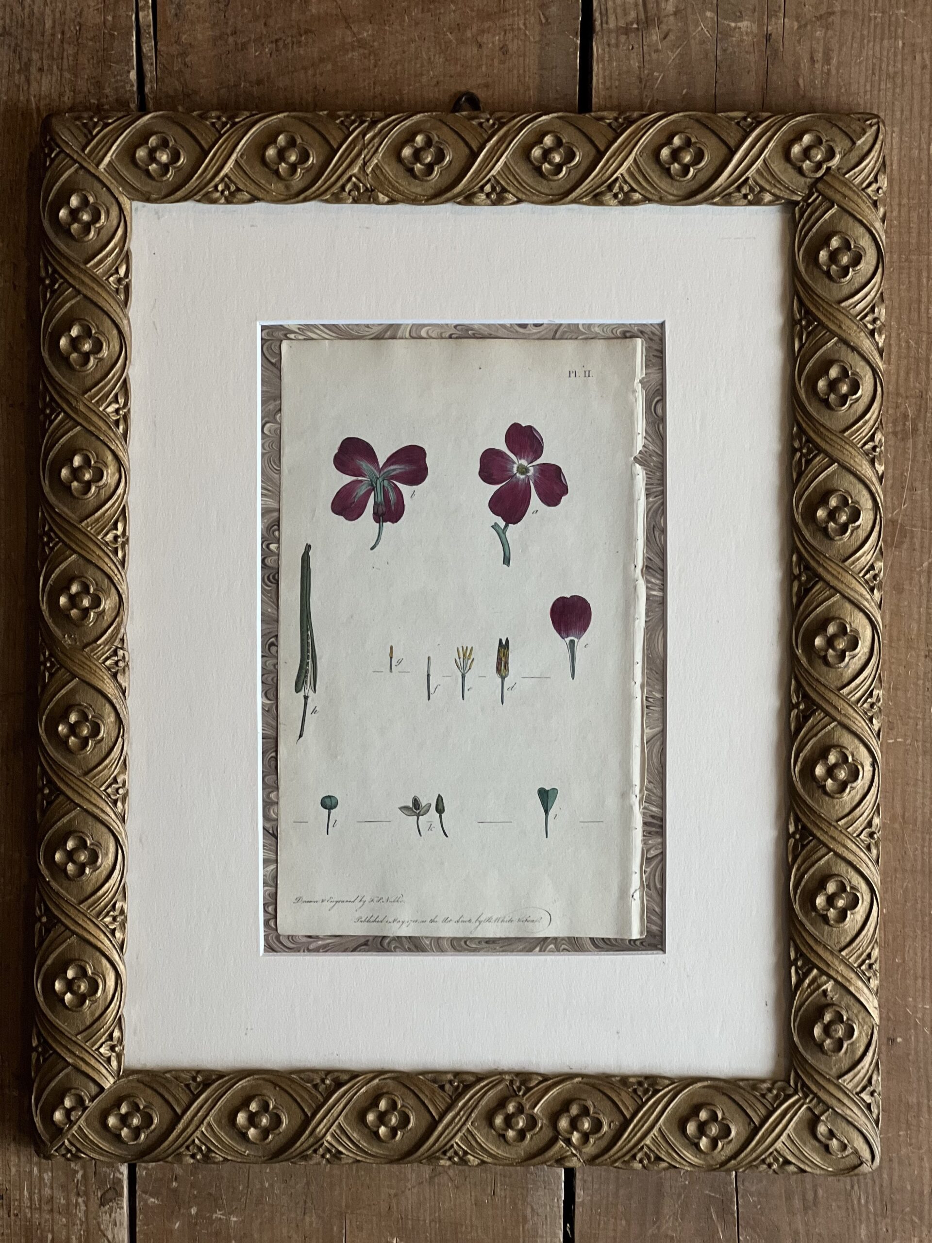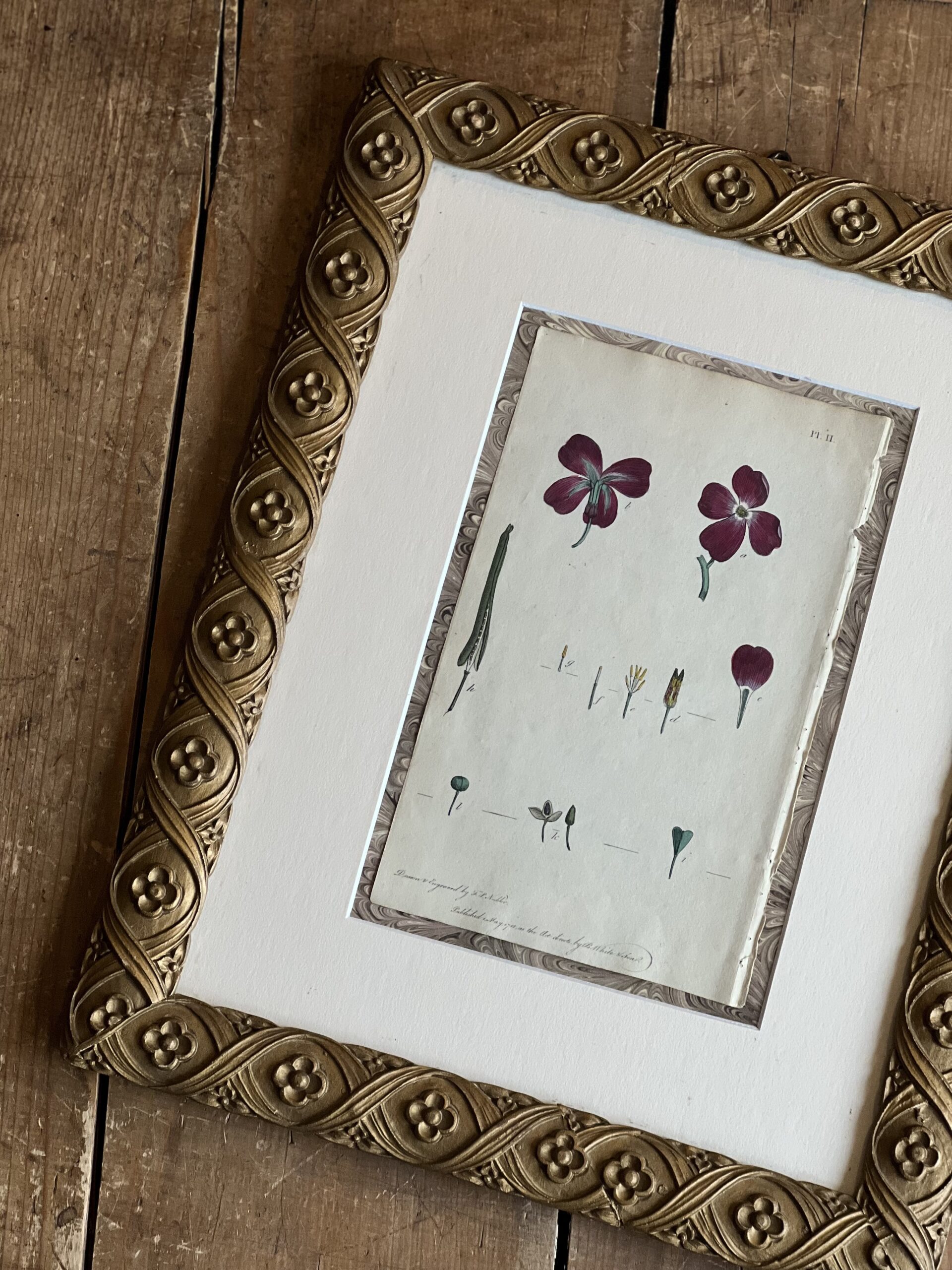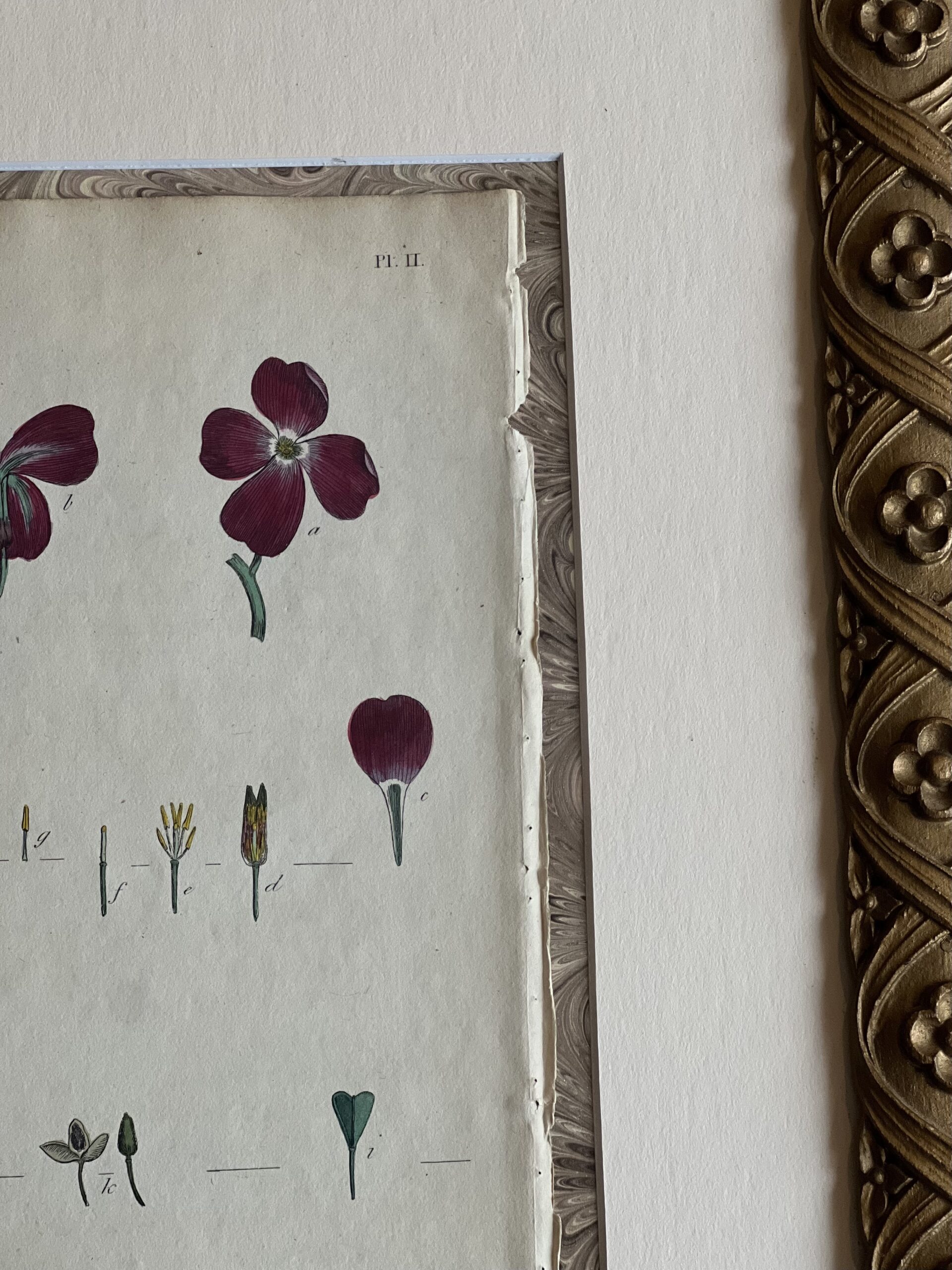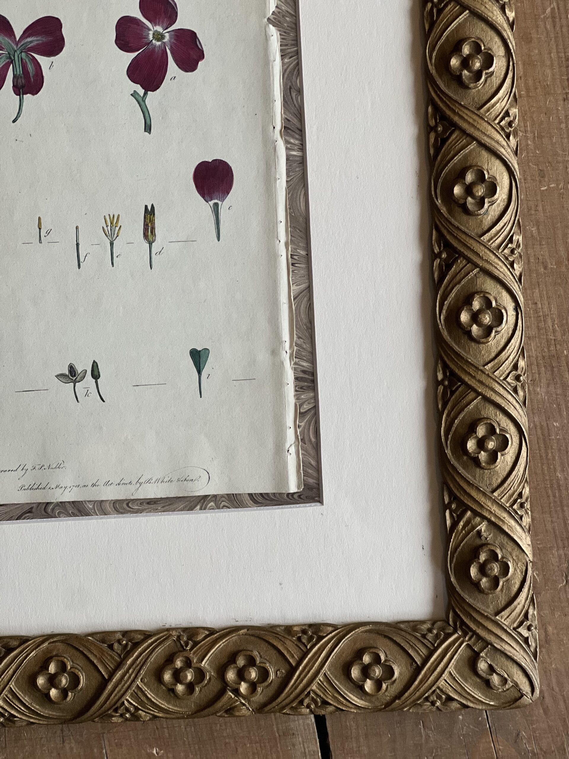 Gorgeous 1799 hand colored engraving of a dissected view of a Gillyflower/Stock flower. Page is from the book Thirty-eight Plates with Explanations. Authored by Thomas Martyn, who was a professor of Botany at Cambridge, and illustrated with hand-colored copper plates by Frederick Polydore Nodder.