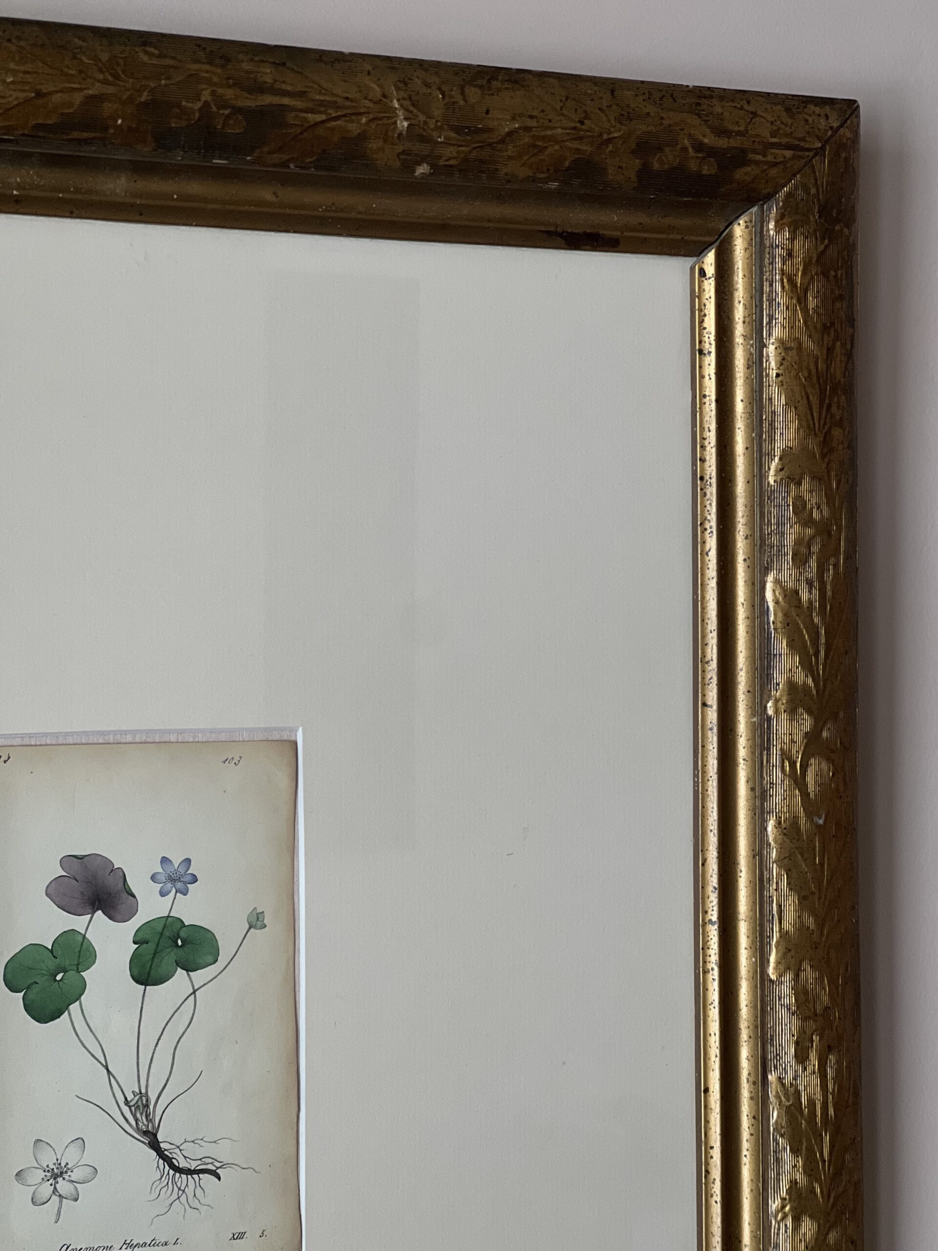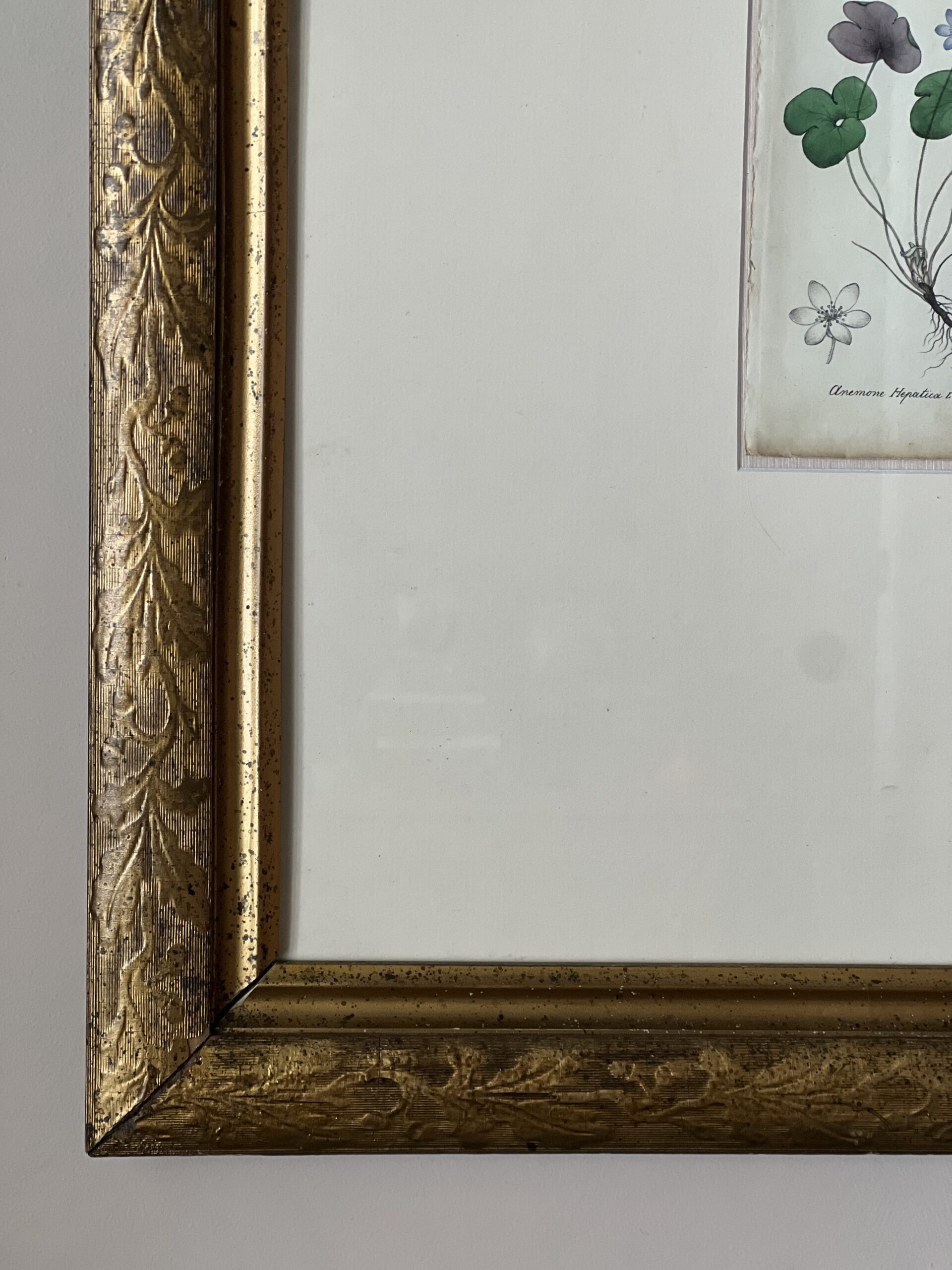 Framed in a large, oversized cream colored matting with a beautiful, large gold-toned foliage frame. Frame has some small spots of wear.