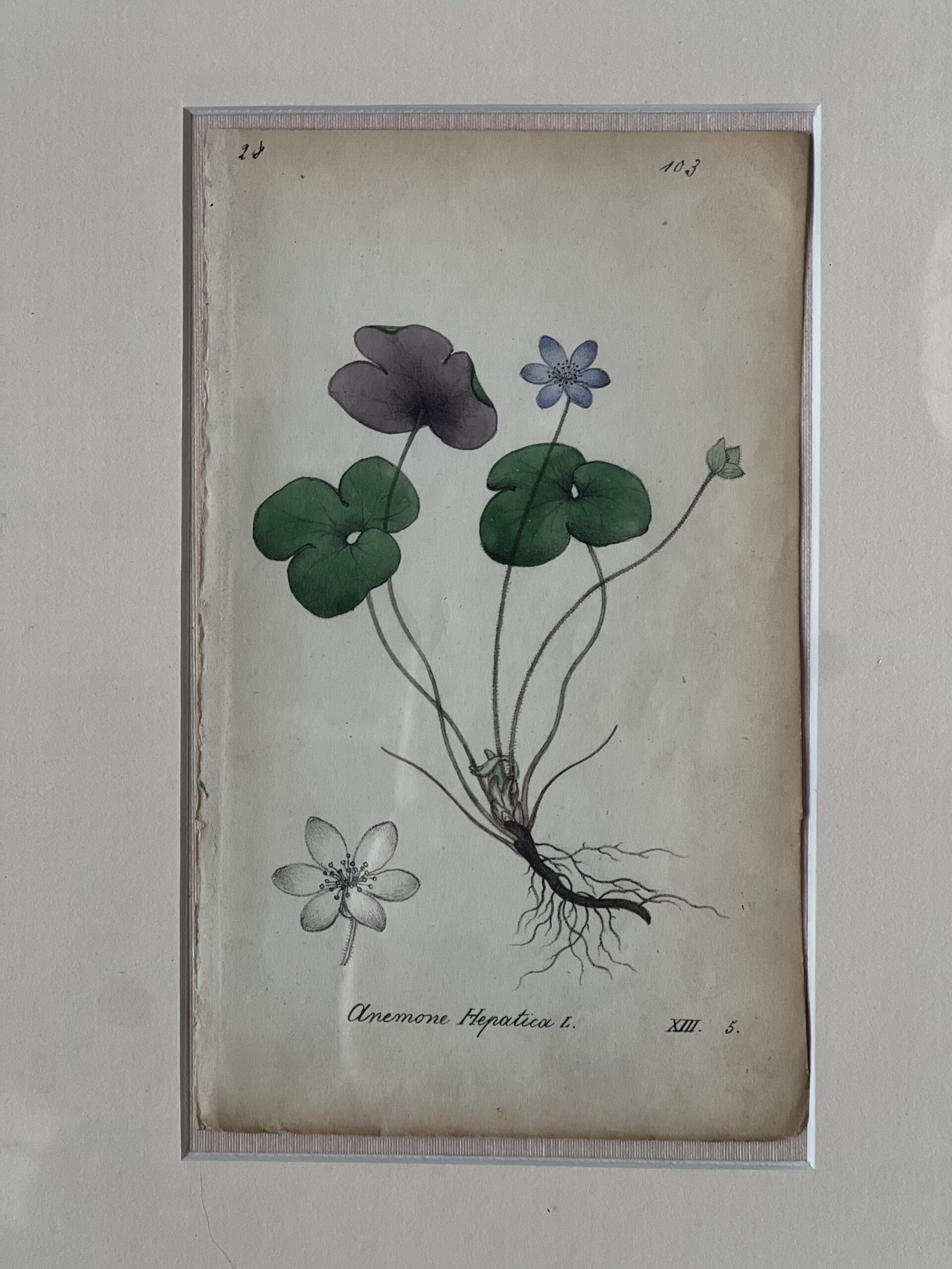 1824 hand colored lithograph of the plant Anemone Hepatica, a woodland perennial known for its soft violet-blue petals and early springtime blooms. From the Collection of Swiss Plants by Johann Heinrich Hegetschweiler and Jonas David Labram.