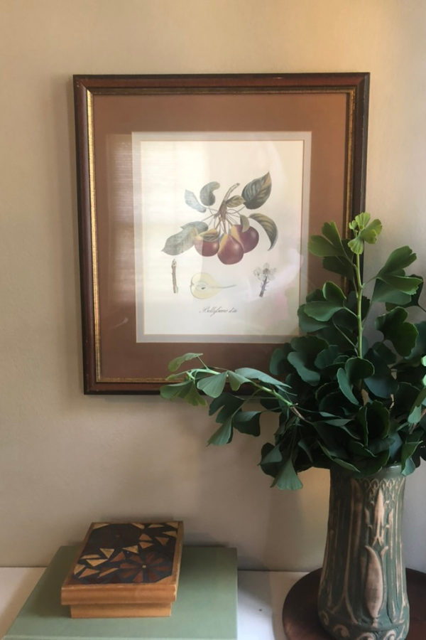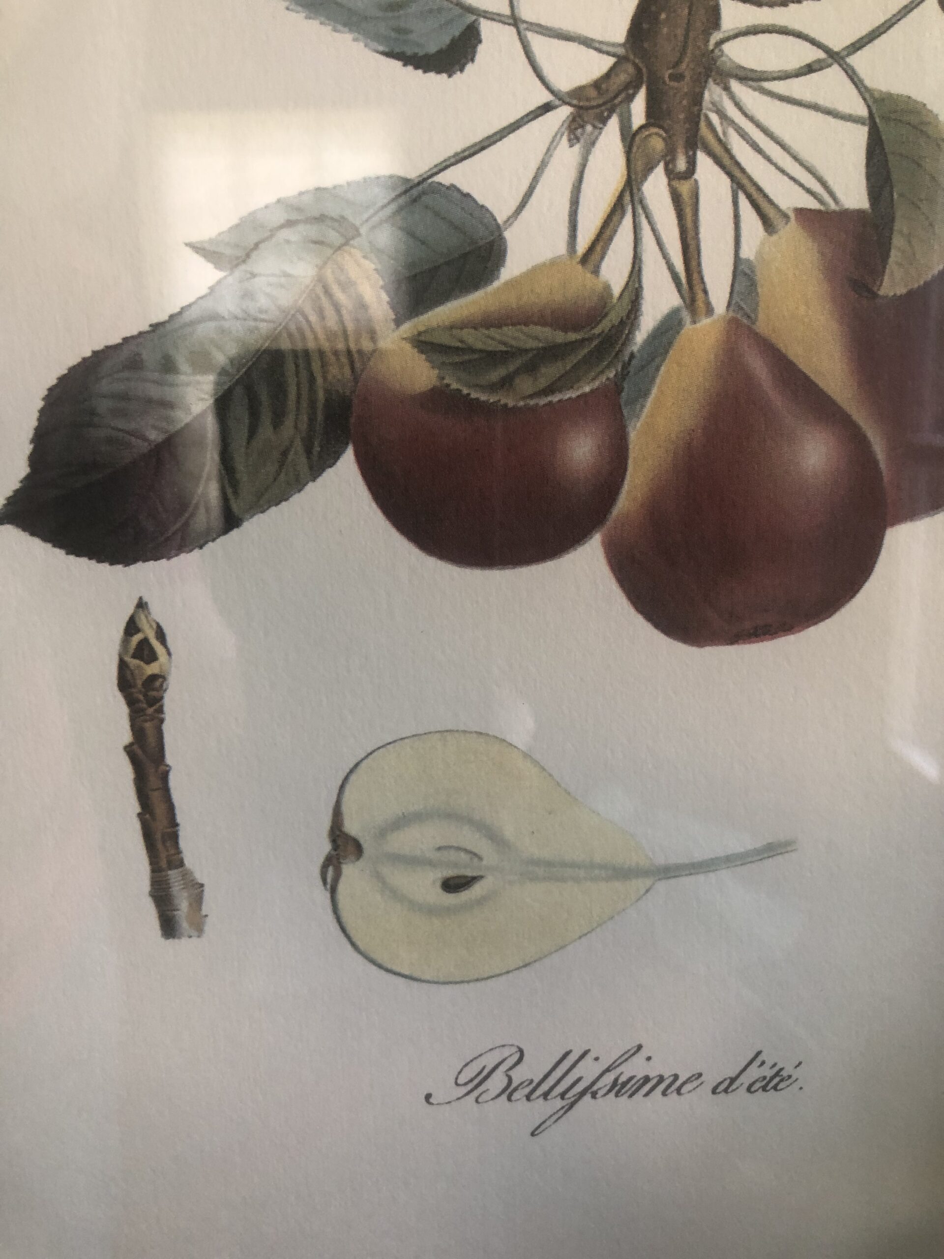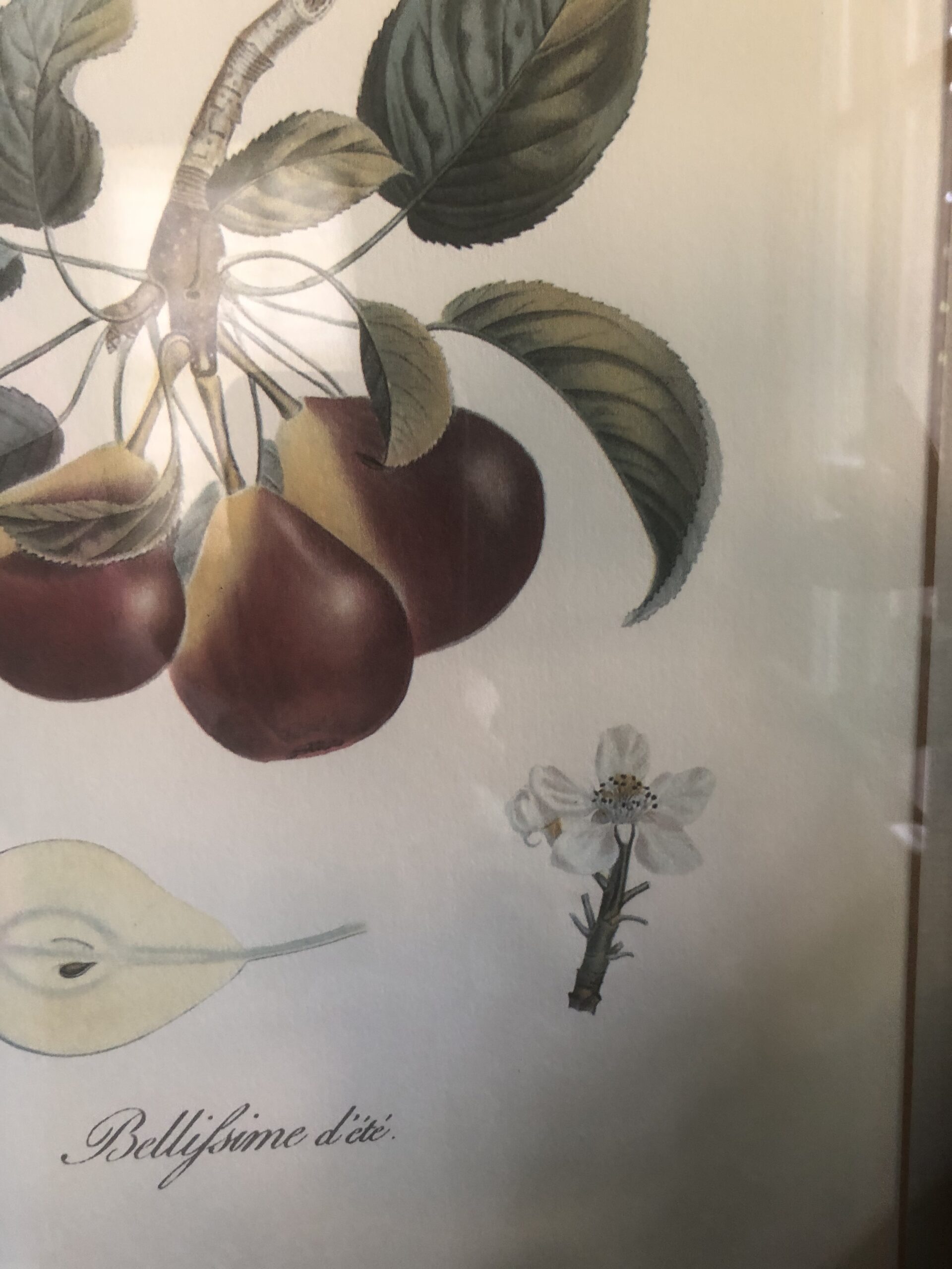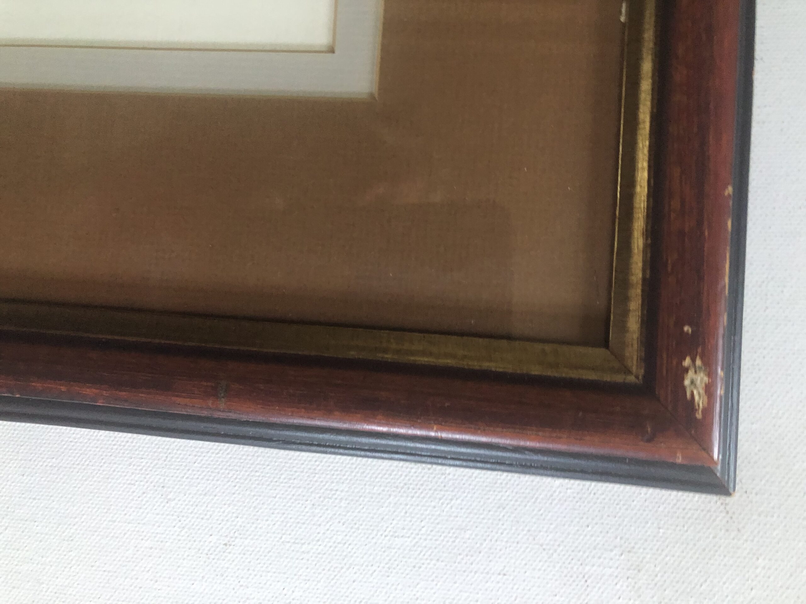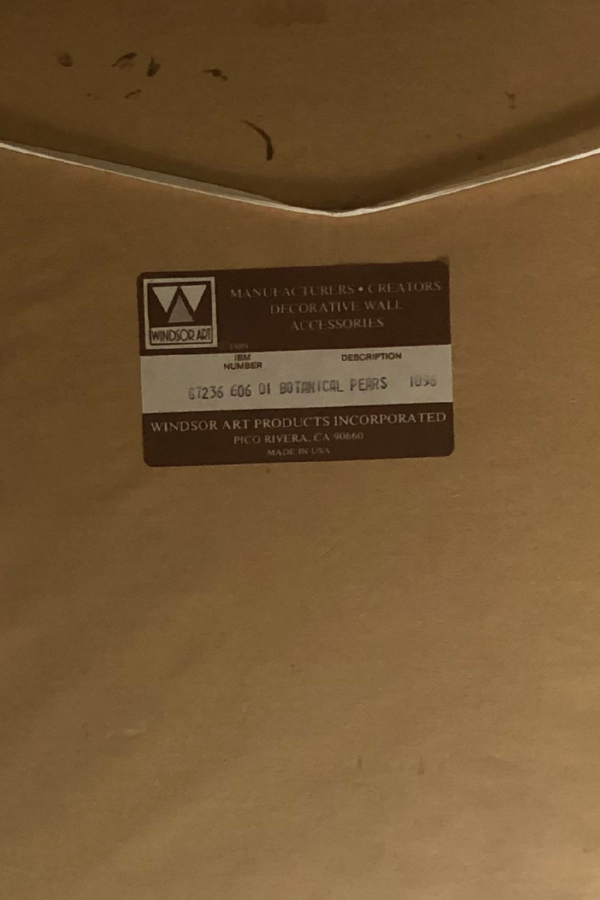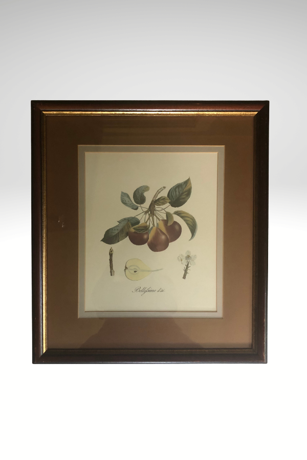 Beautiful framed and matted botanical print featuring pears. Double mat is tan and brown. Wooden frame with a gold inside edge and a darker outside edge. Frame stain has some worn spots. Sticker on the back, including original price sticker. Hanger on back. Pretty neutral colors. I have another botanical listed separately but it has the same framing and matting. If you are interested in both, let me know. I can give a little discount ($120 for the pair, shipped). The framed print measures 18 x 20 inches. Shipping is included but only within the contiguous US.