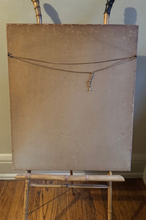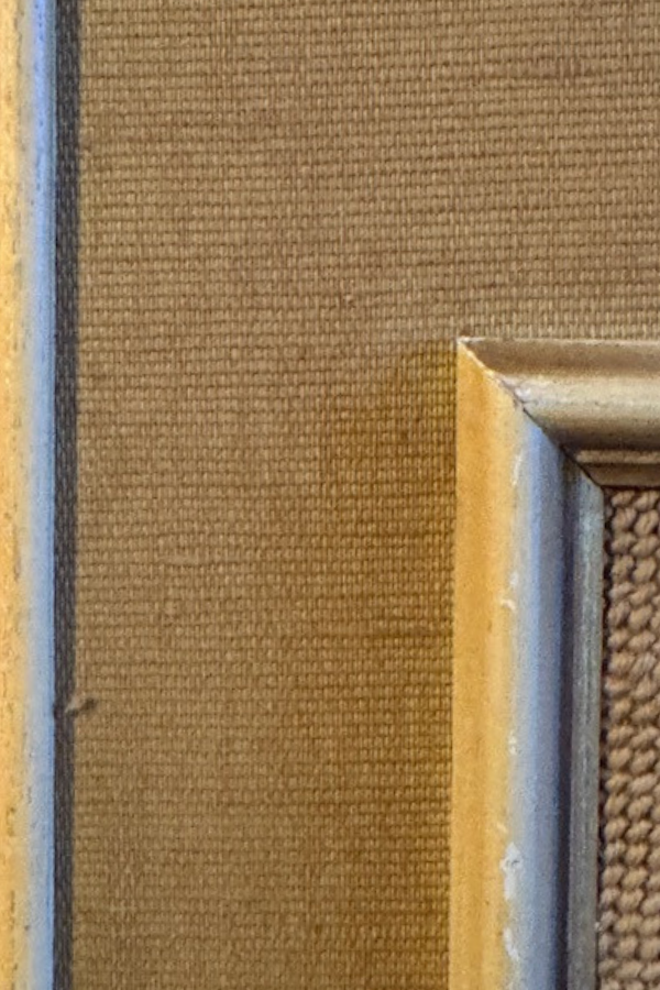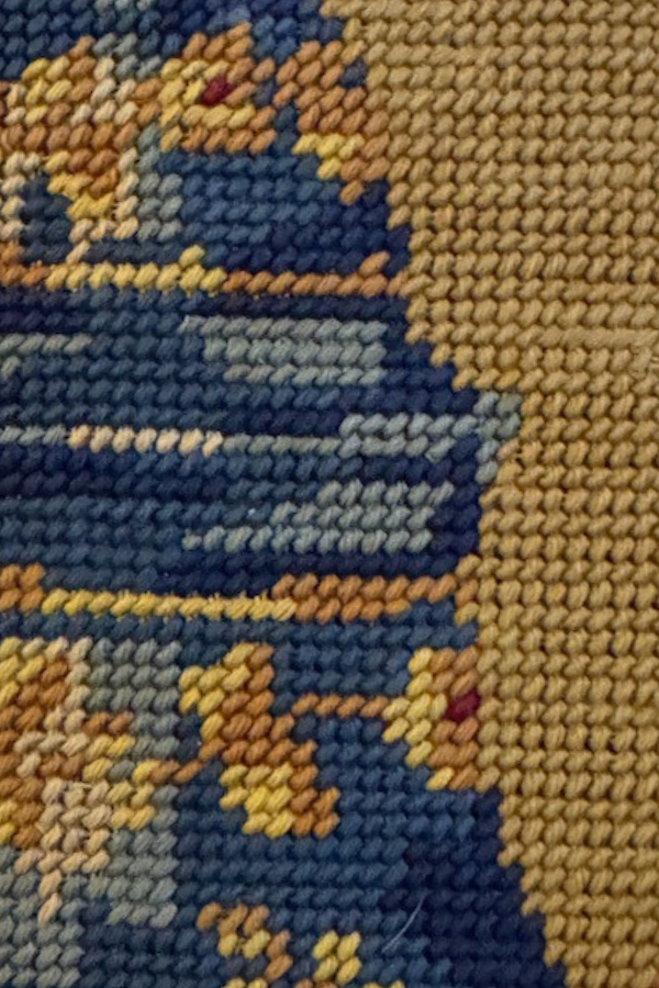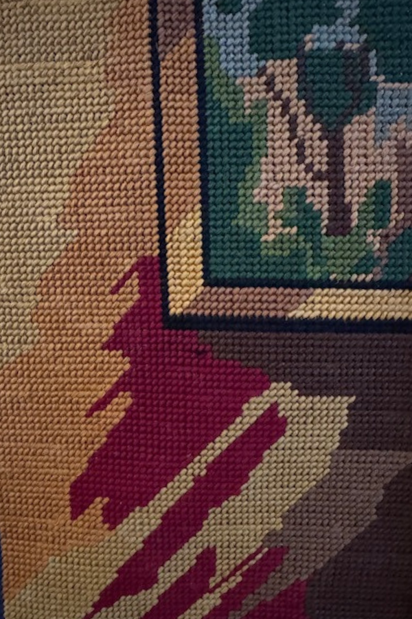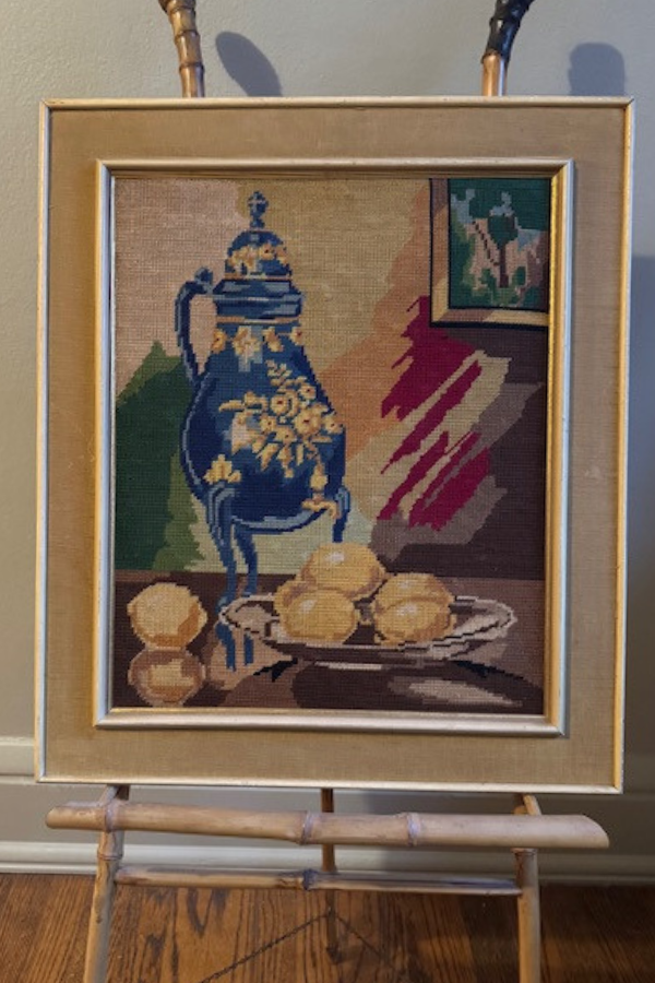 Framed mid-20th century needlepoint still life featuring lemons, a teapot, and a picture on the wall behind. Tans, golds, blues. Older frame with wear consistant with age. It consists of a cream-colored inner edge and a cream-colored wooden outer edge. The center is a tan grass cloth- like material. It looks like the frame/mat has darkened over the years. The needlepoint bulges a bit and I am guessing it needs to be re-stretched so it is a little tighter. A new frame and mat would really freshen it up, but it can be hung “as is.” There is a board on back with eye hooks and an old string for hanging. Measures 20 x 23.5 inches. Unique piece that would be great in a kitchen or dining area. Shipping is included but only within the contiguous US