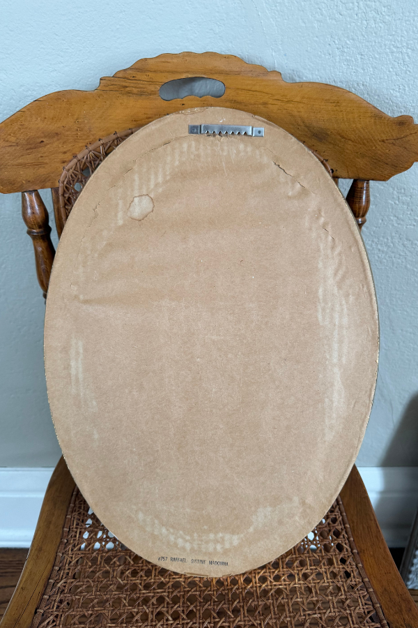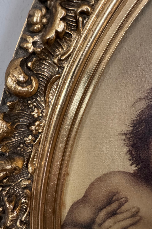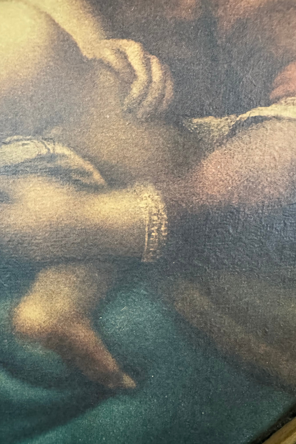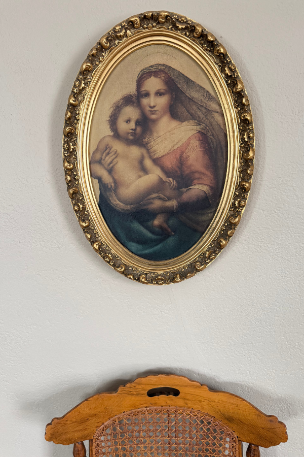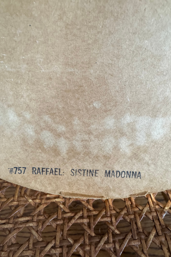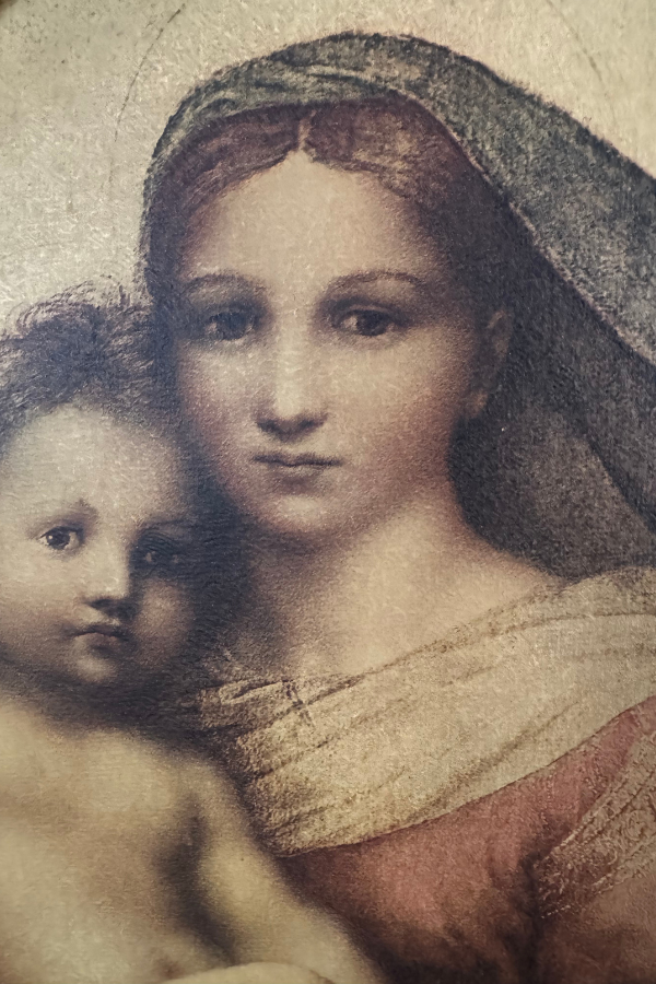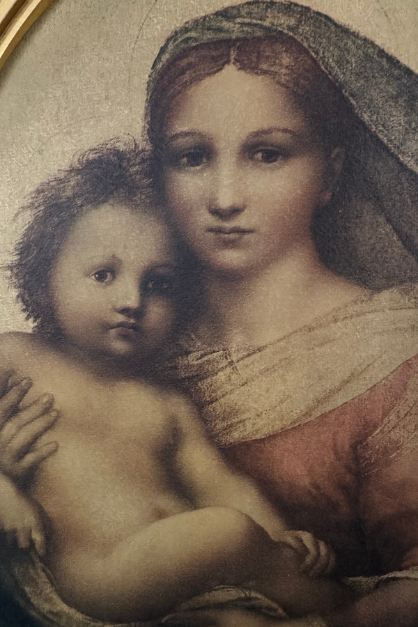 Framed print of Raphael’s Sistine Madonna in gold-painted frame. Frame feels like it is wood, but it is lighter weight. Print is on a canvas like material. Stamped on back, so best guess is that this is a quality mass-produced piece, but it beautiful. Measures 17.5” x 12.5”. What a great addition to your Christmas decor. Shipping is included, but only within the contiguous US.