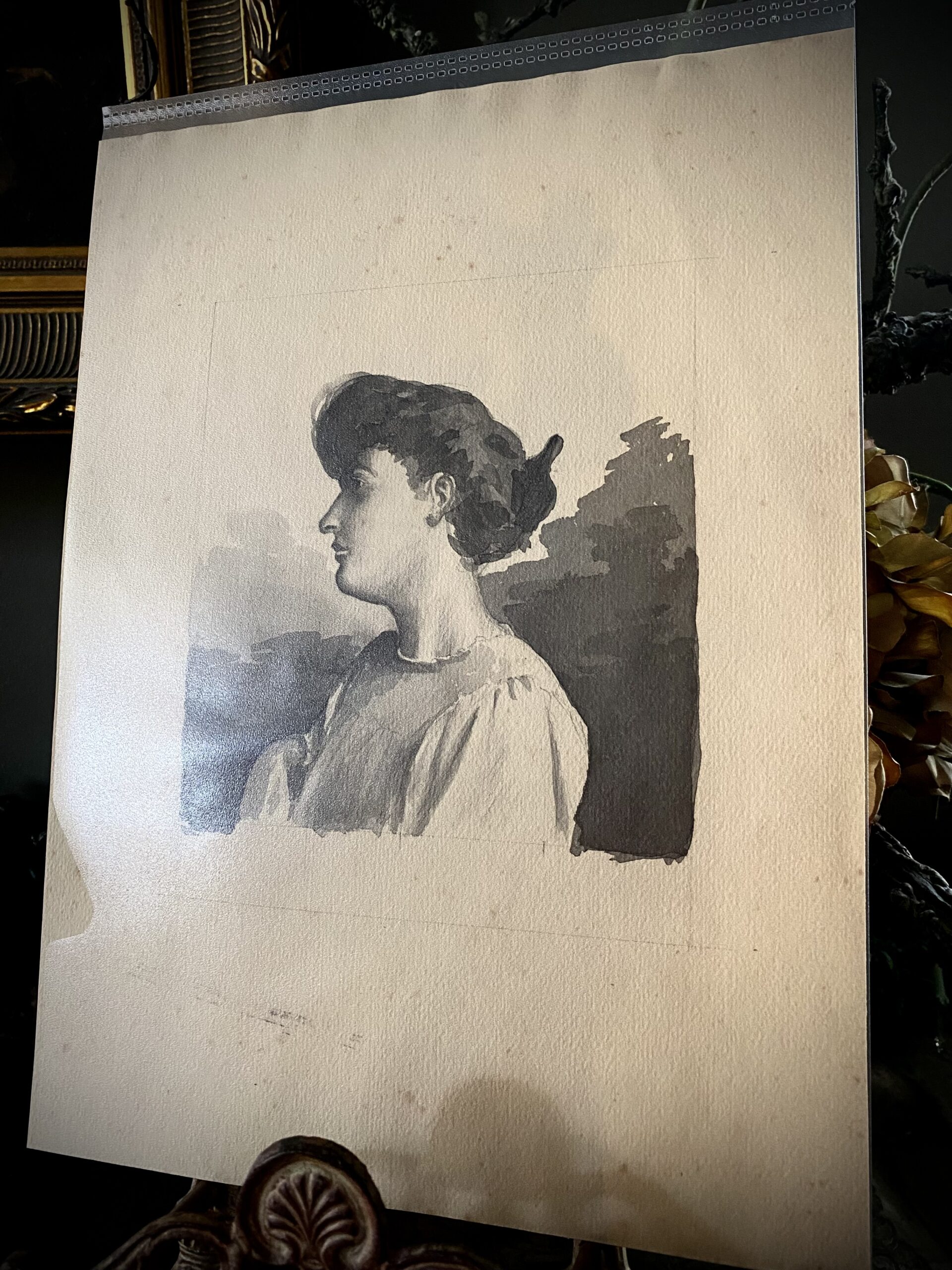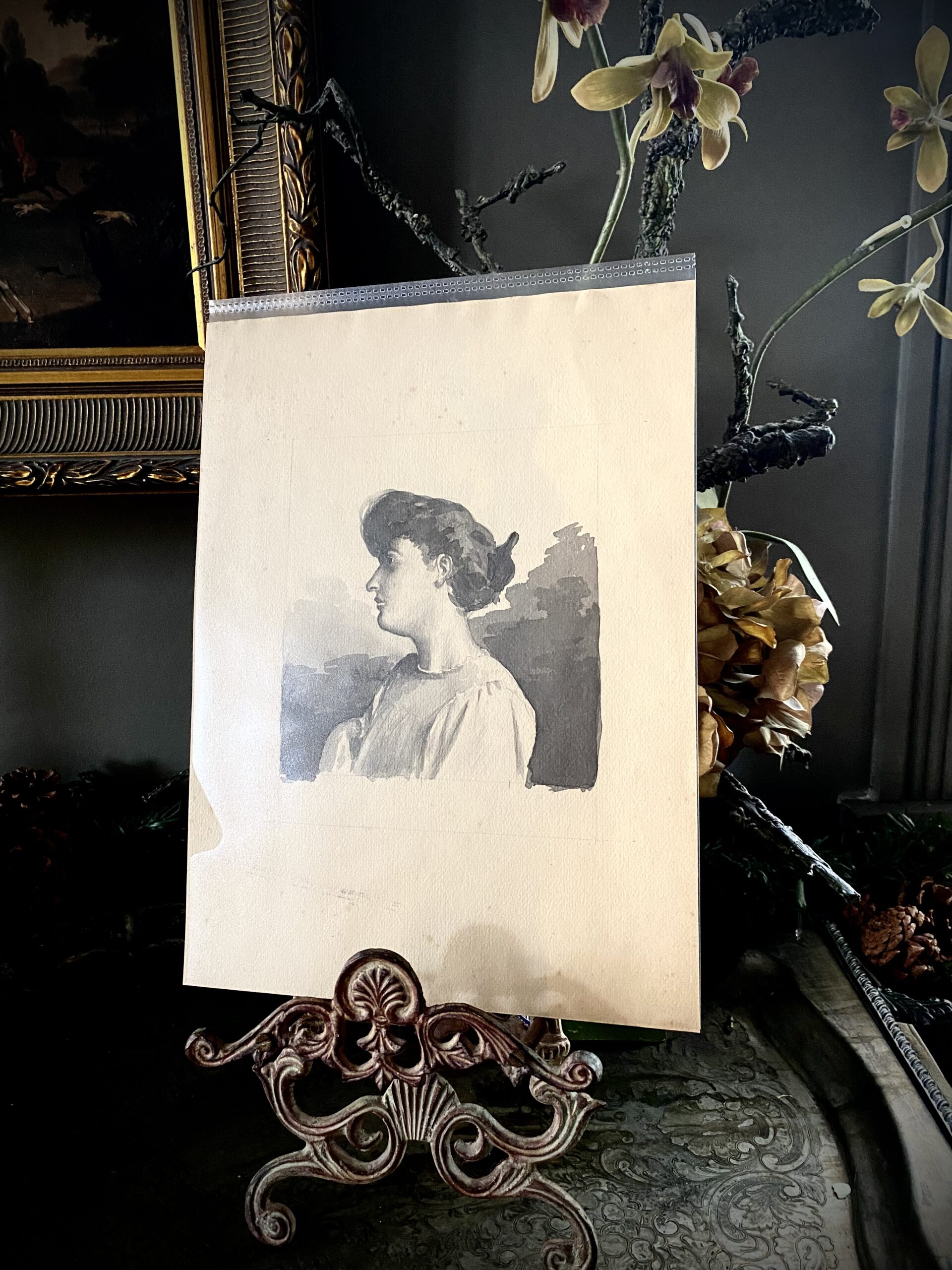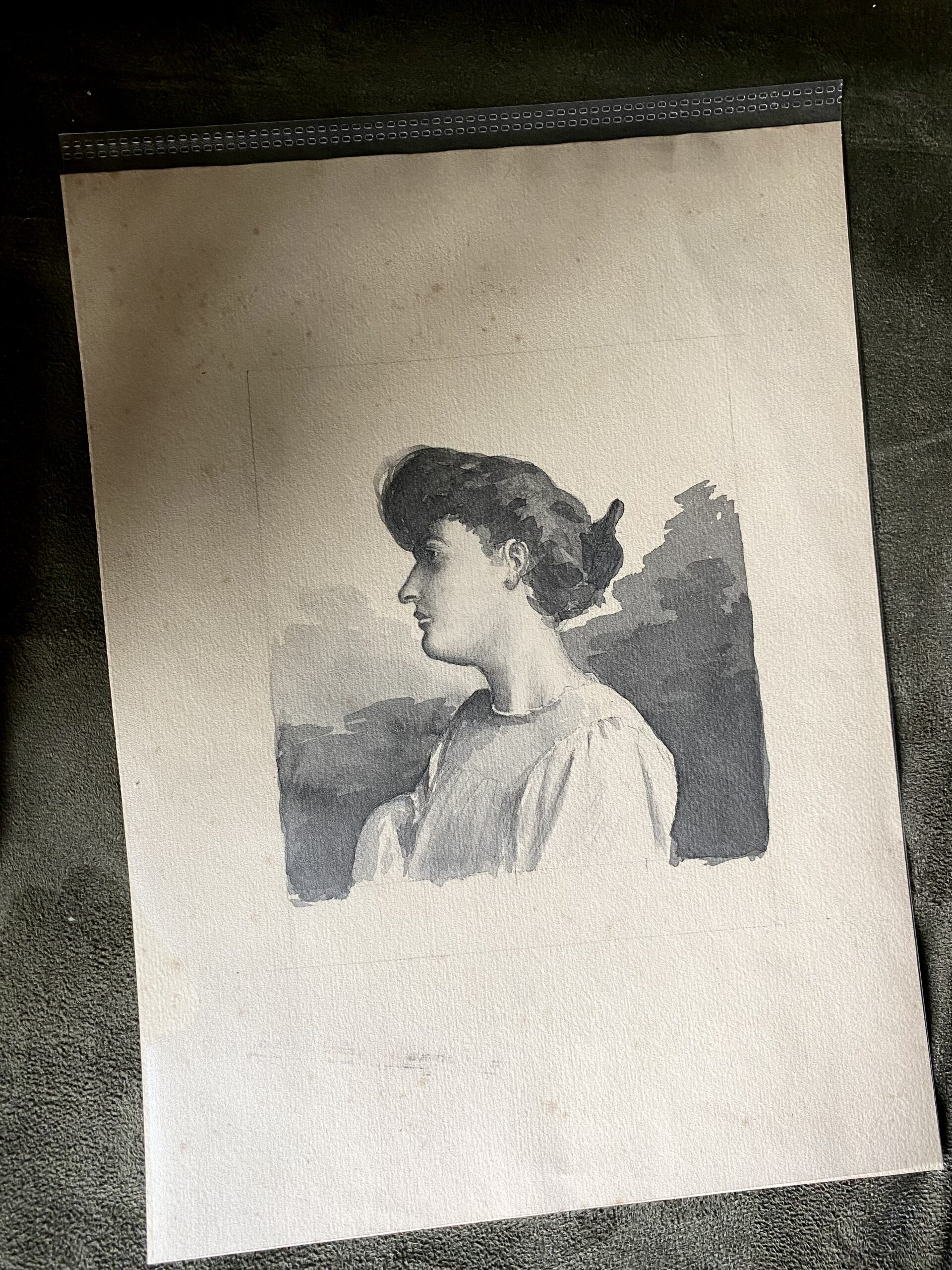 Stunning French school ink drawing of woman profile portrait. Estimated to be from 1900-1920. On vellum paper. Came from art dealer in Périgueux, France. Measures 11 3/4″ x 8 3/4″