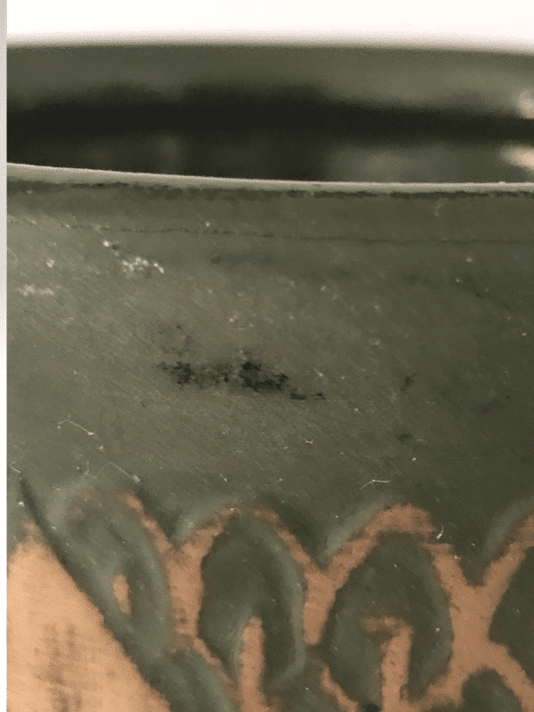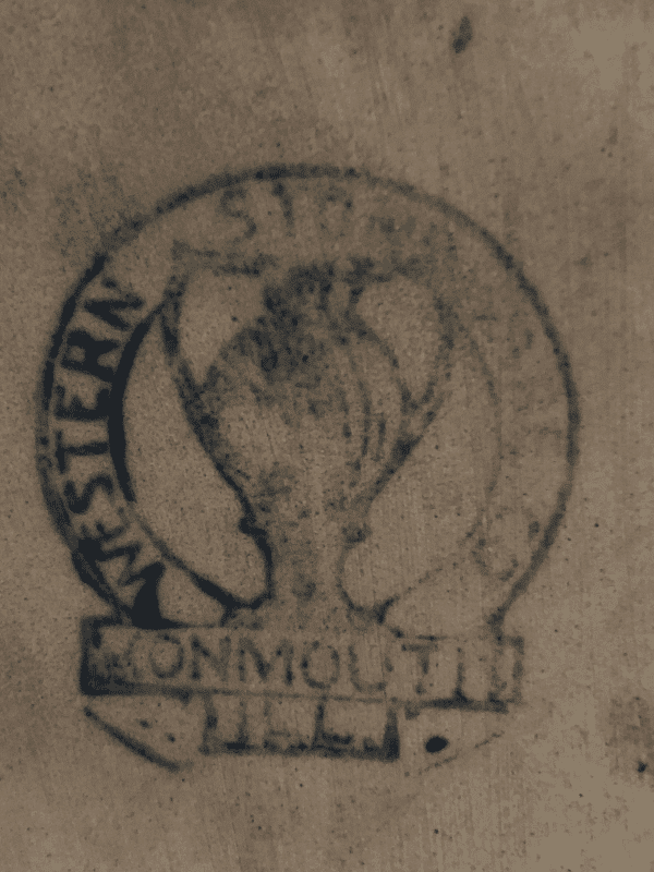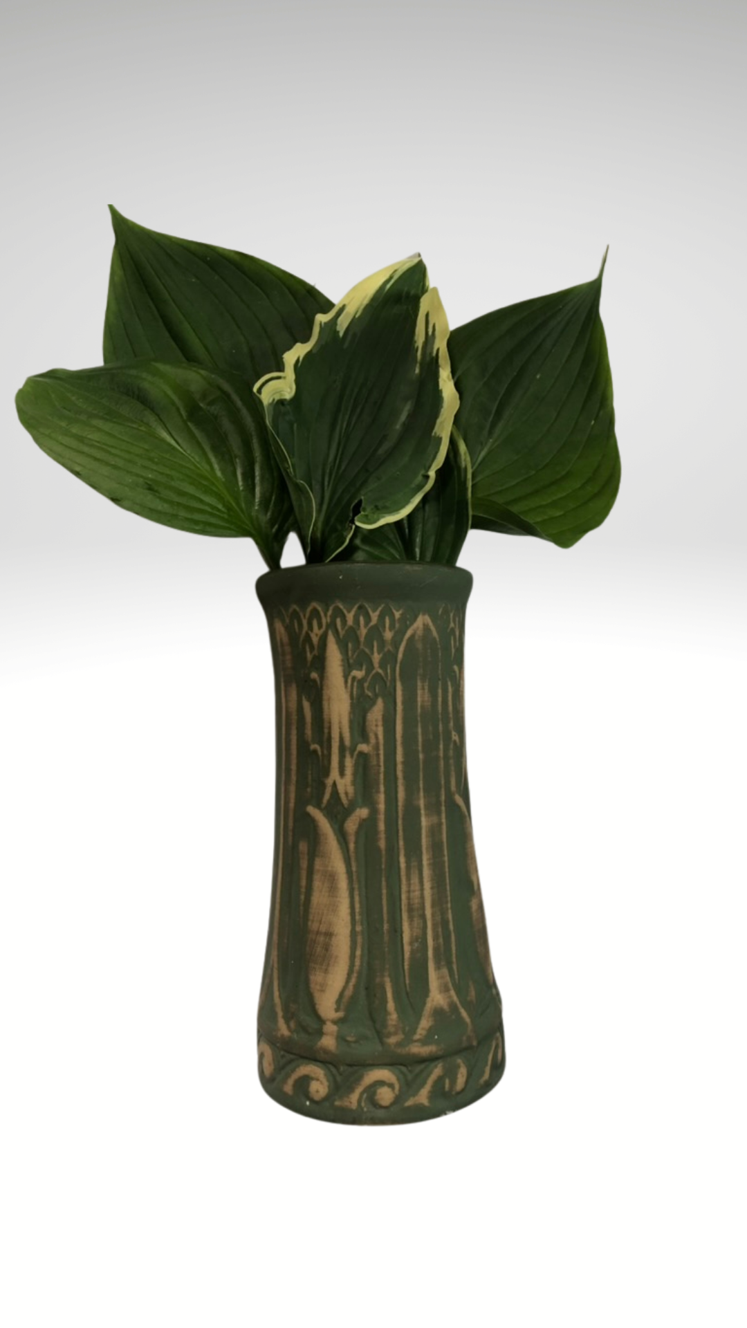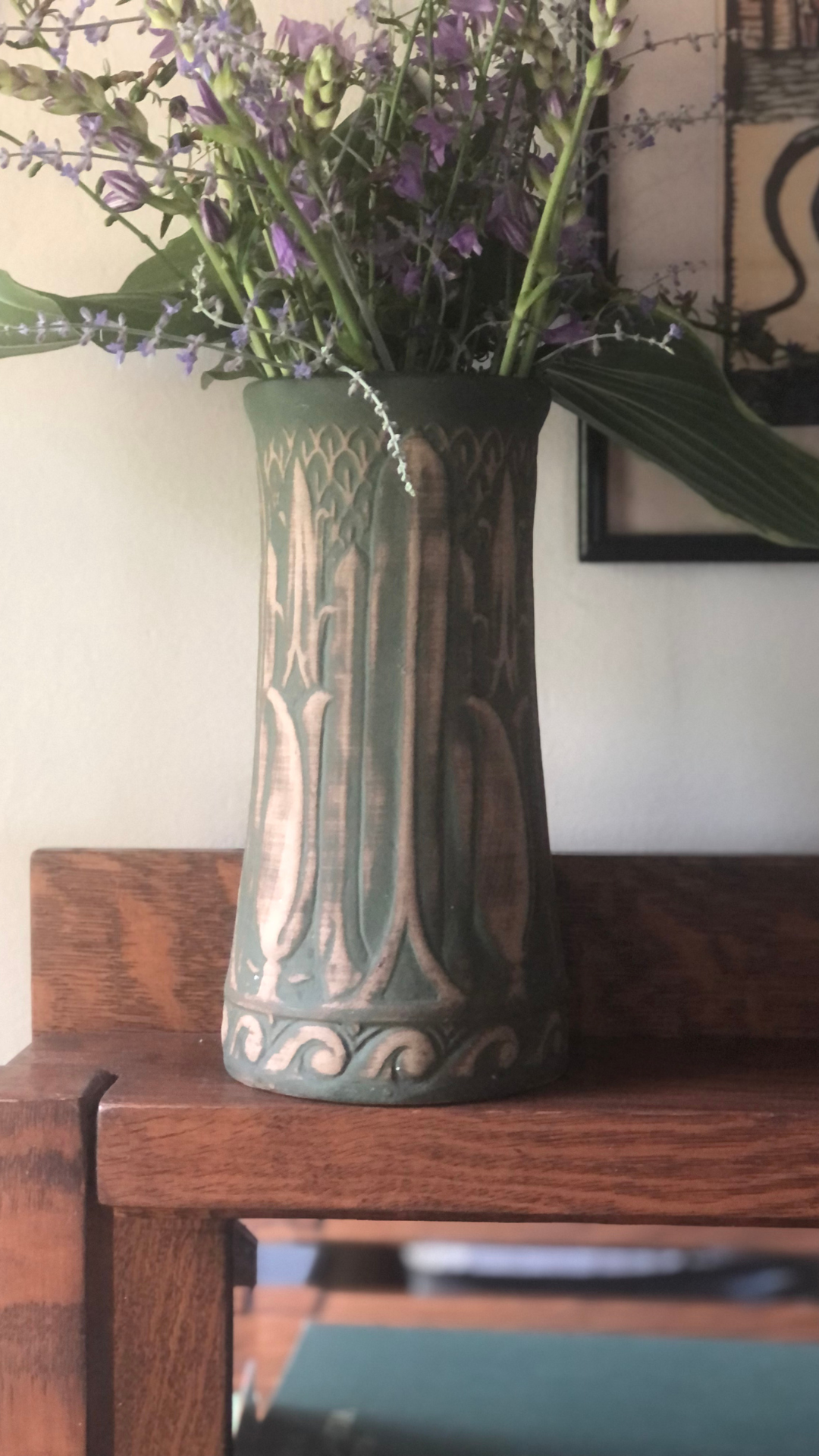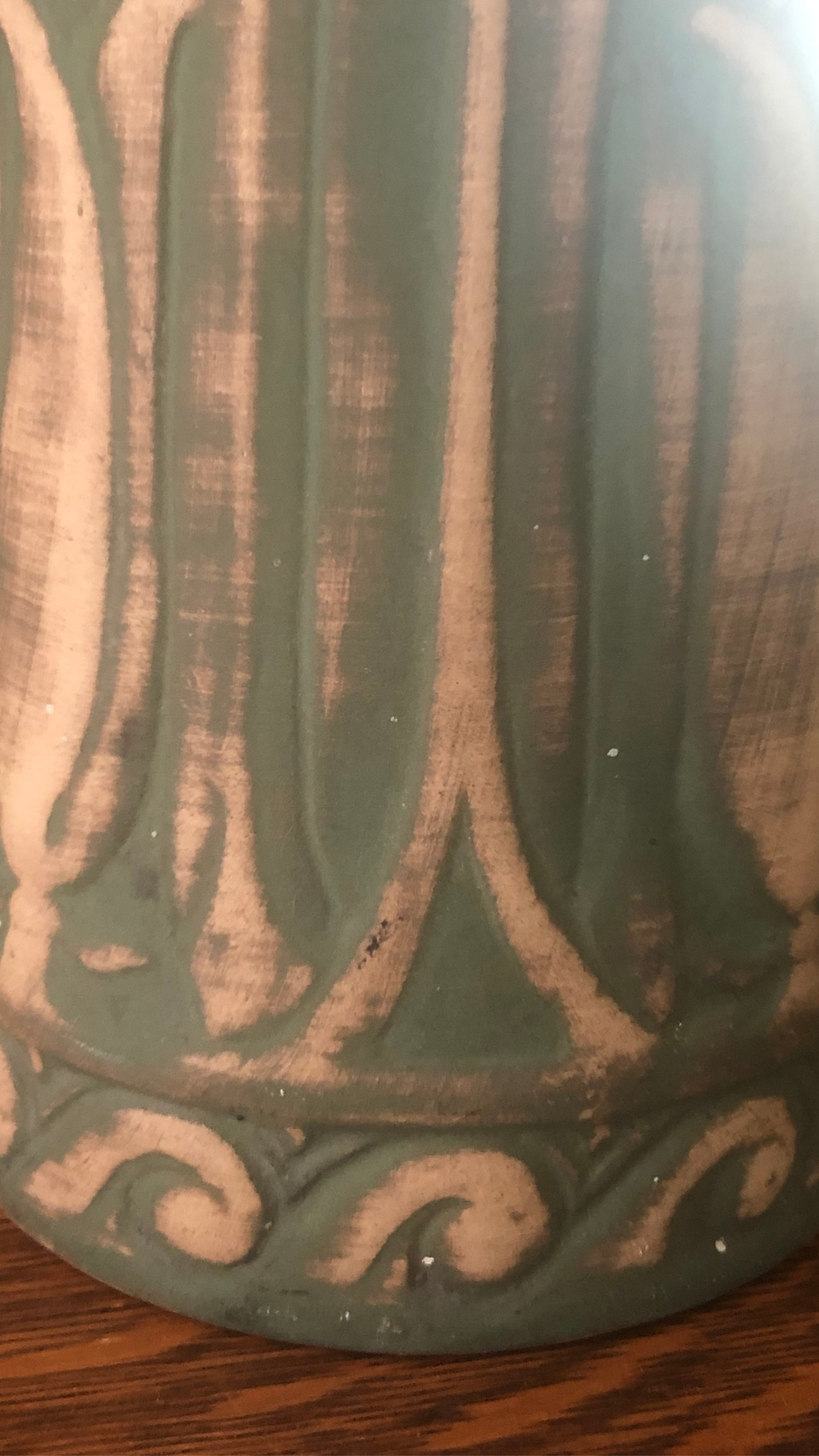 Beautiful green brush-ware vase from the Western Stoneware Company. The Lotus pattern vase was made c. 1925 – 1930. Brushware was popular during the end of the nineteenth century and into the first quarter of the twentieth century and is known for its art pottery quality. Each piece is unique and as such, was a popular choice during the Arts and Crafts Movement. “Brushed Ware” was made by a number of stoneware producers including Red Wing, Western Stoneware Company (Monmouth Illinois), and Robinson-Ransbottom (Ohio). Color was applied to molded stoneware, and then lightly “brushed away” leaving contrasting areas on the embossed design. This vase was manufactured by the Western Stoneware Company, located in Monmouth IL. The vase is stamped on the bottom.