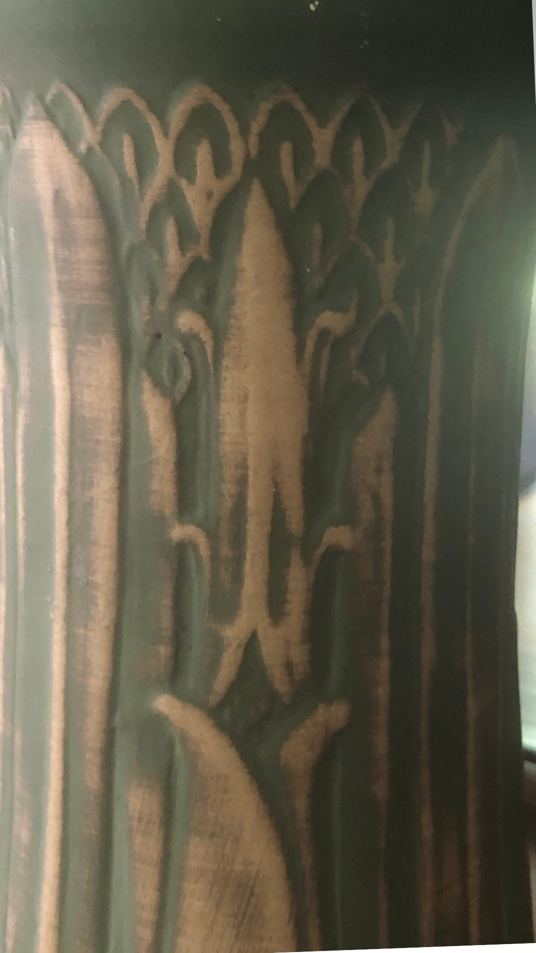 It has a yellow clay base with a raised lotus flower design and is brushed with a green matte glaze, wiped to allow the pottery color to show through, hence the name brushware. The vase has a dark gloss-green interior and measures approximately 10 inches tall. It is heavy and weighs 3 # 9oz.