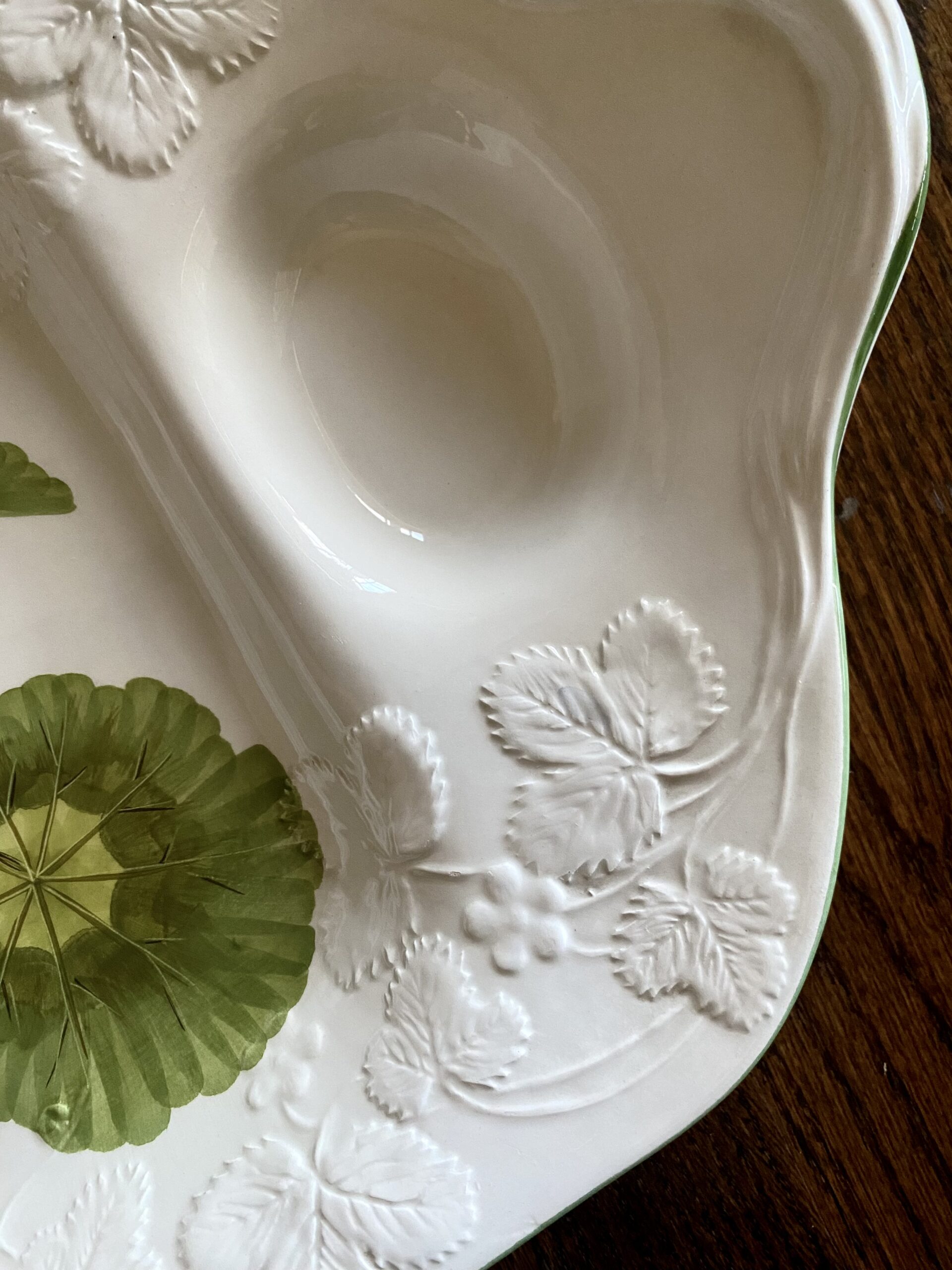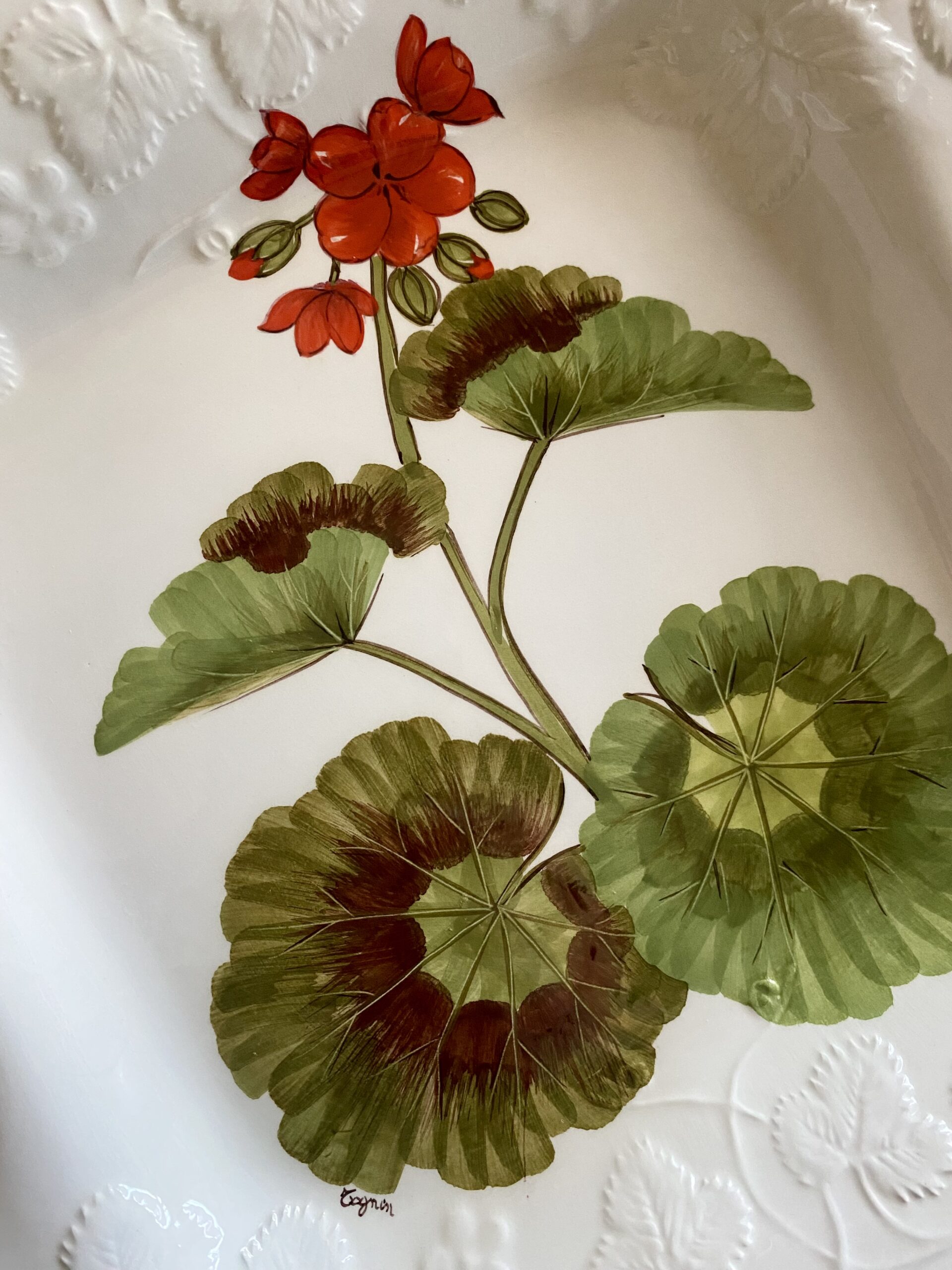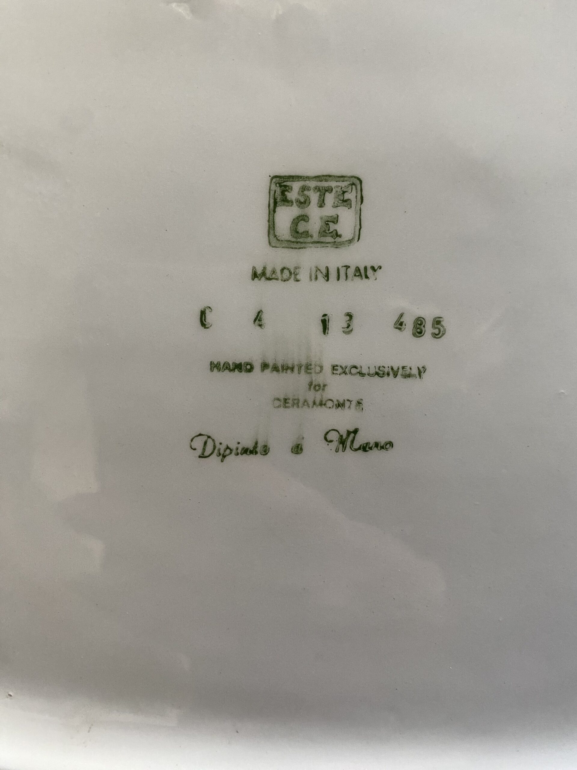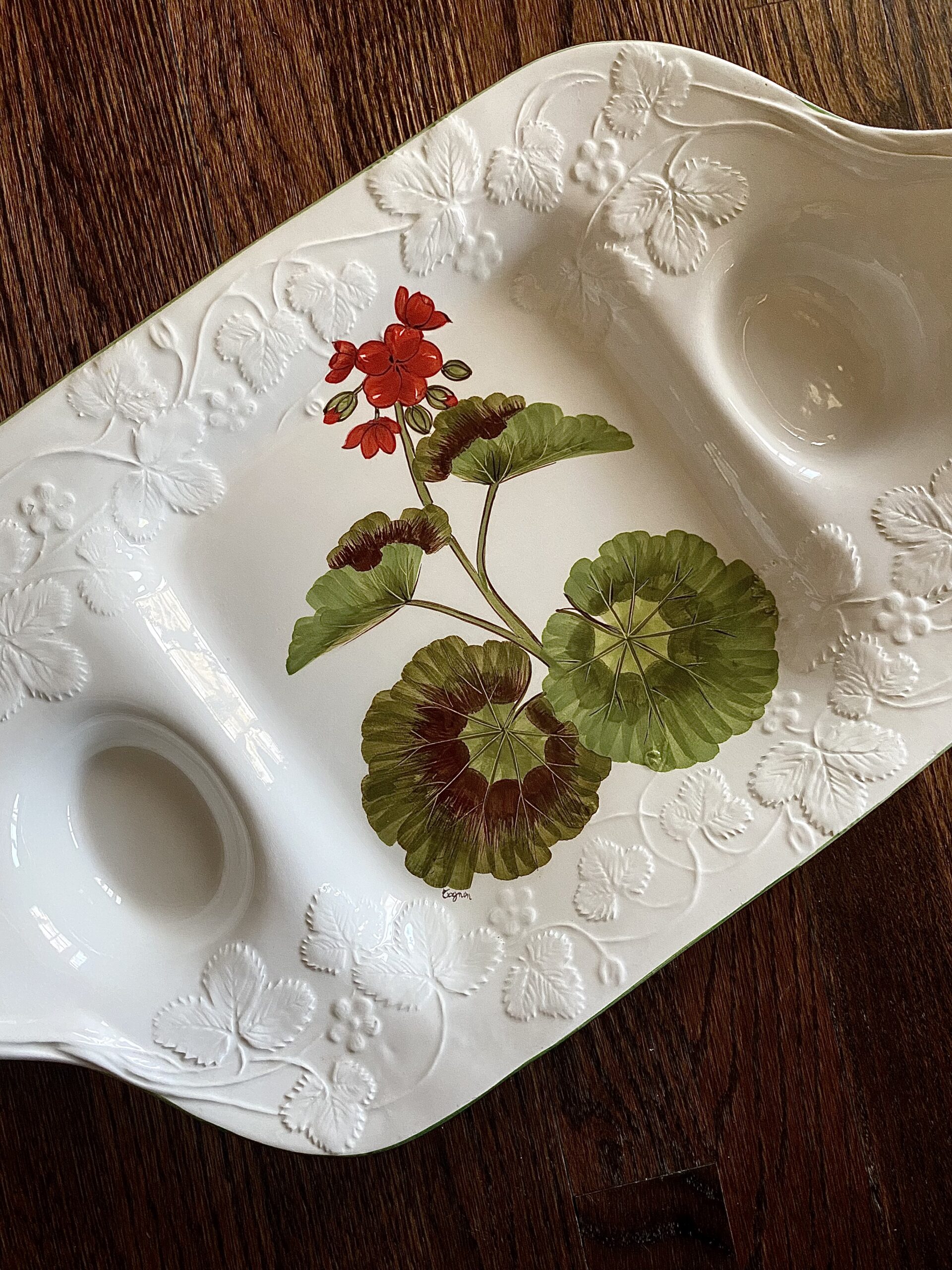 Large hand painted vintage platter with gravy wells. Features geraniums, hand painted in Italy exclusively for Ceramonte, by the company Este Ceramiche, a well-known Italian pottery maker. Measures 19″ x 11.5″