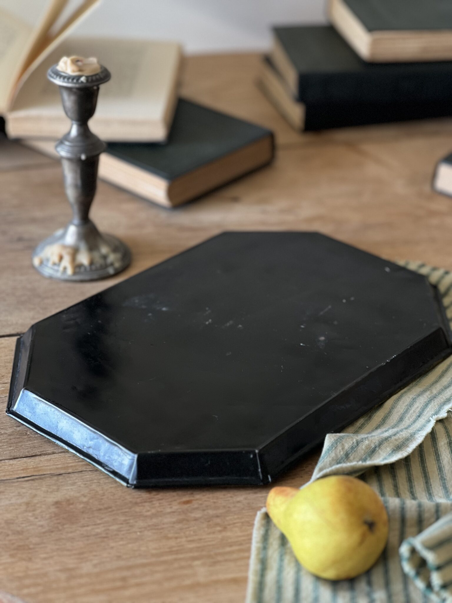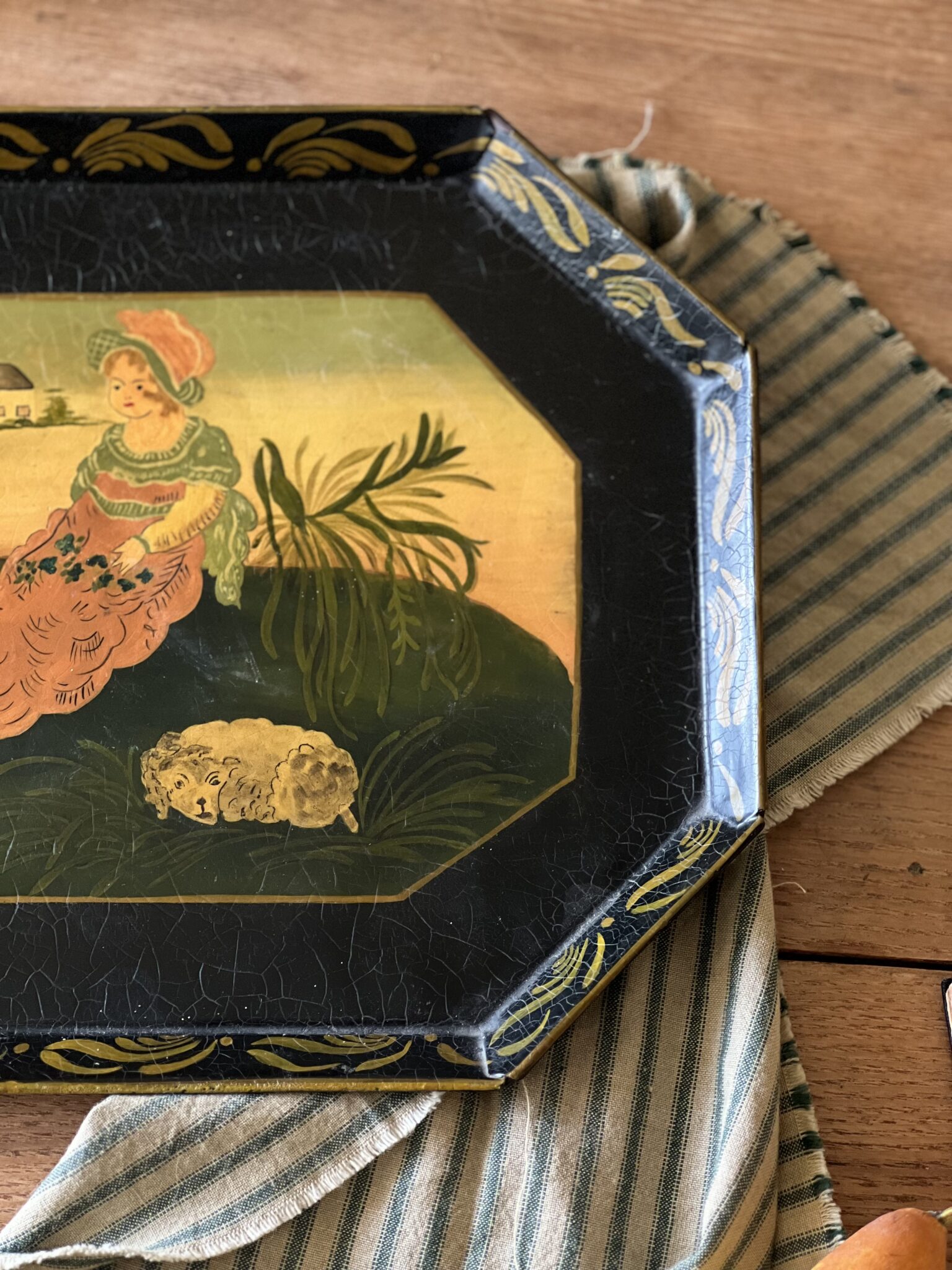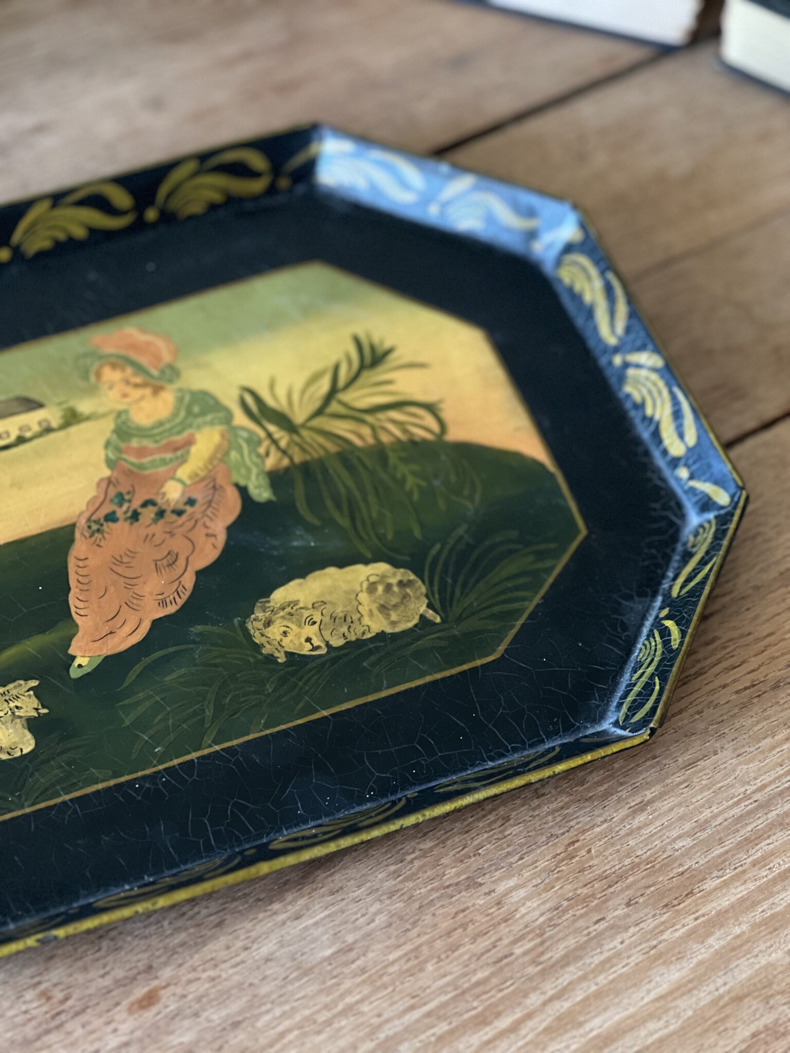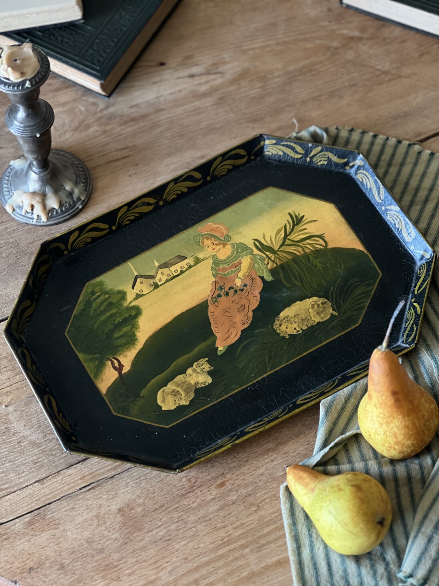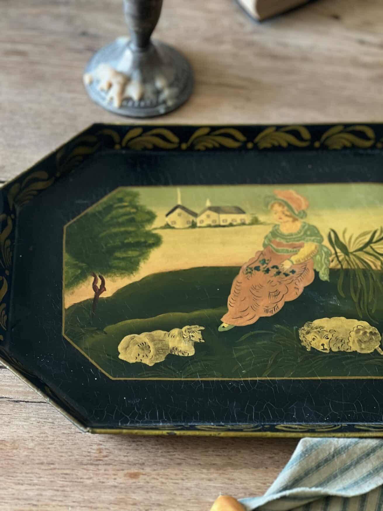 A lovely hand painted toleware serving tray of a girl sitting with her sheep. Painted with bright and bold greens and yellows, with some craquelure along the paint’s surface. A charming tray for holding candles or remotes on a coffee table or lovely in a kitchen or hung on a wall.