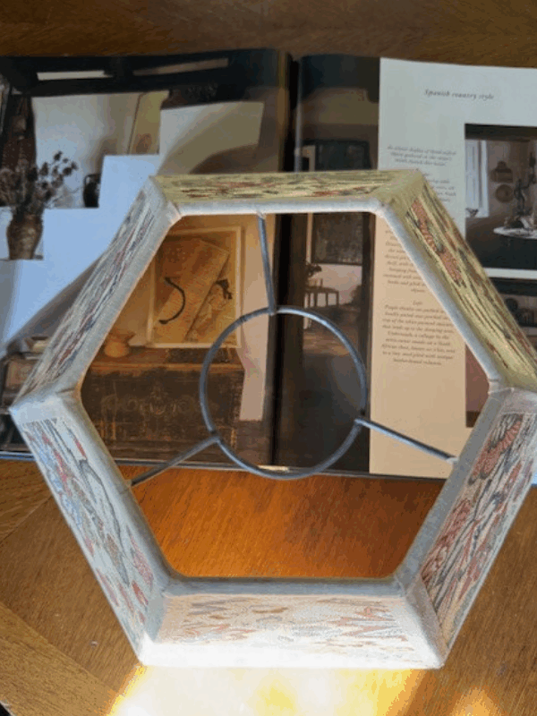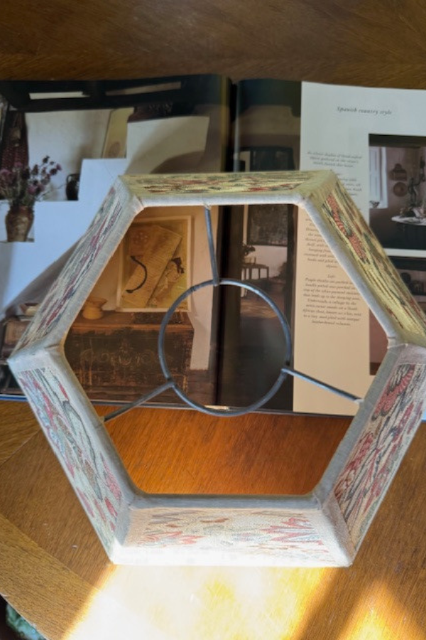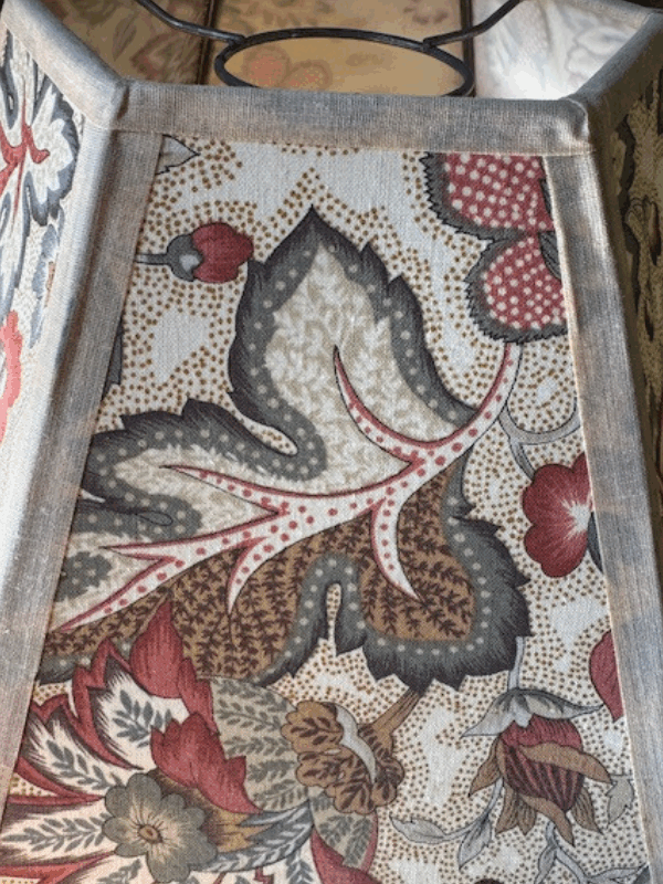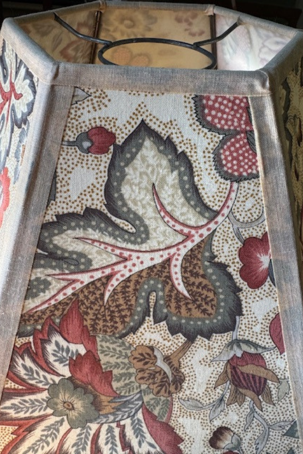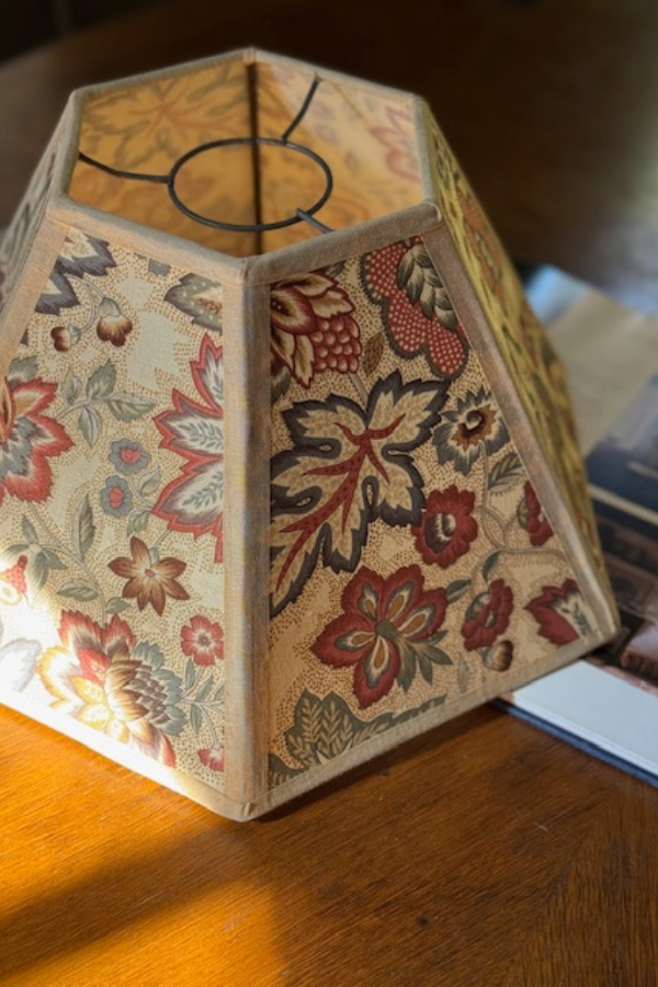 Beautiful vintage lampshade. Hexagonal shape, with a floral pattern in brick red, green, blue, gold and cream. Great autumn colors. The shade has a chimney harp, meant to go over a glass chimney. The shade measures 6” top, 14” bottom, 8” tall. Shipping is included with this listing, but only within the contiguous US.