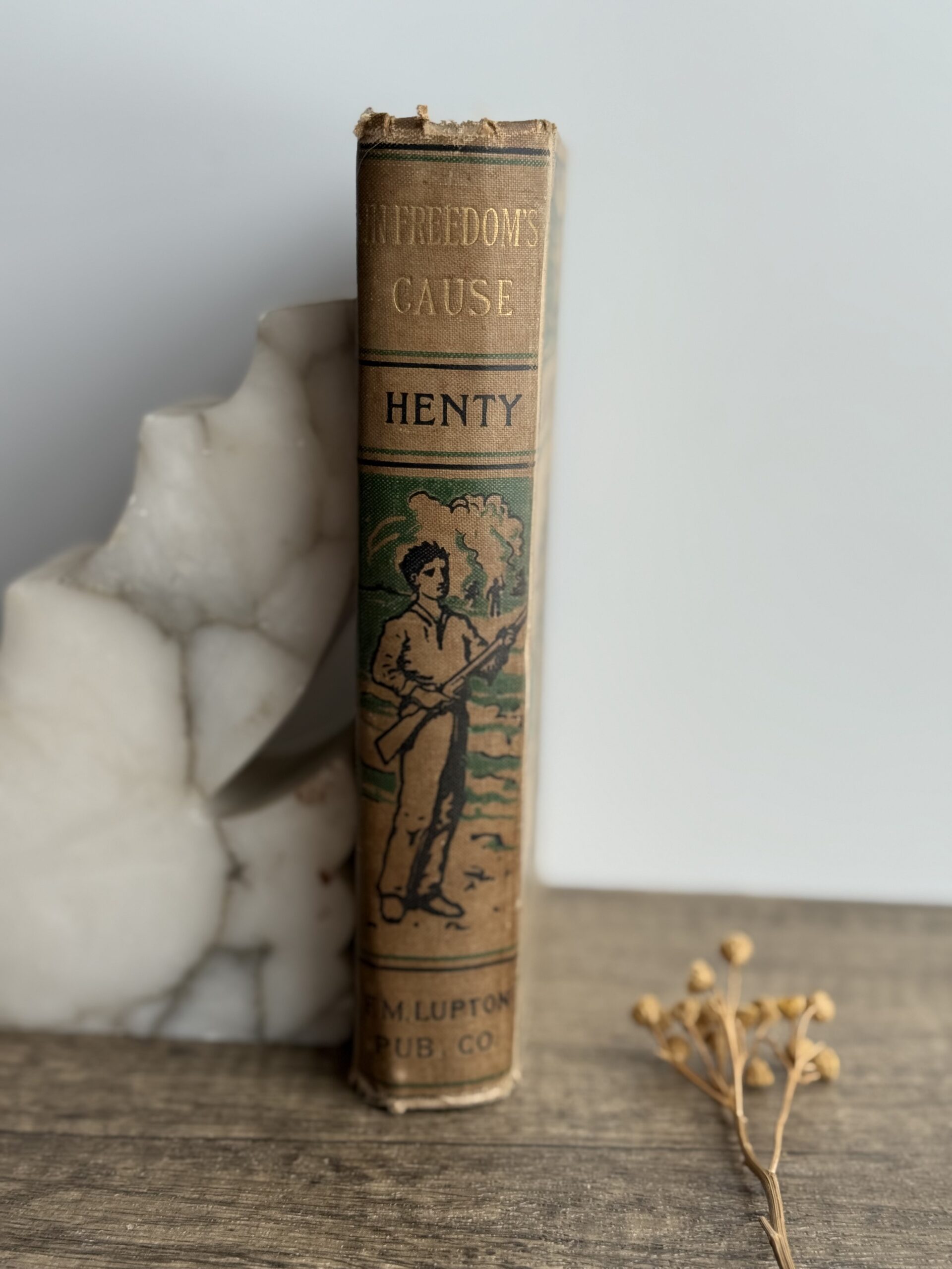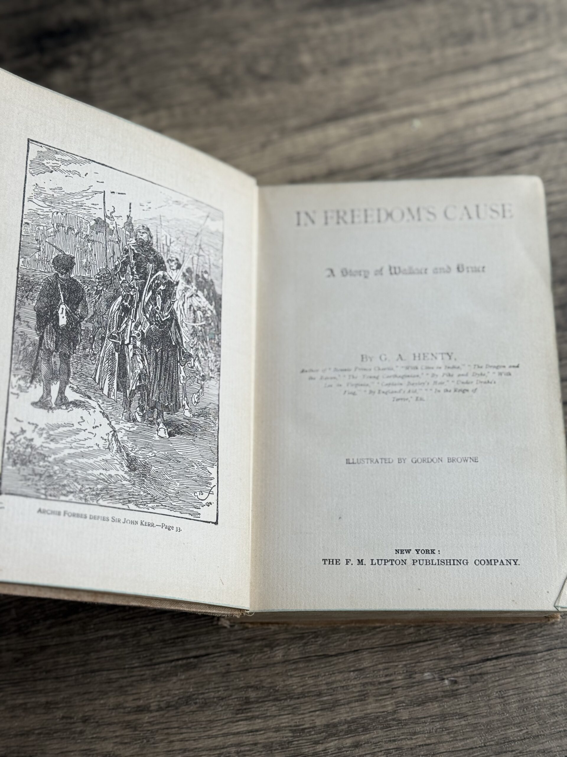 In Freedom’s Cause, A story of Wallace and Bruce by G.A. Hently published by the F.M. Lipton Publishing company of NY (1890s- early 1900s). Has some small areas of foxing on a few pages. Historical Fiction Novel set in the times of Wars of Scottish independence from England.