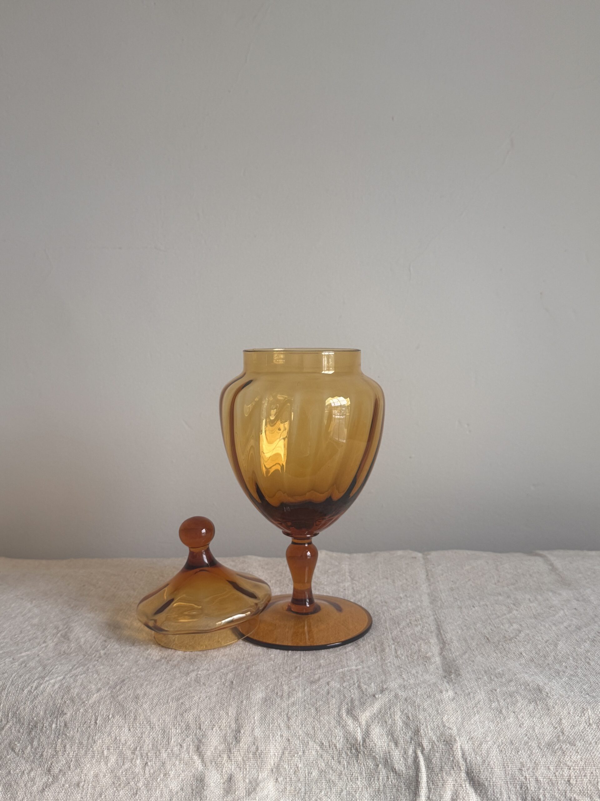The glass shows beautiful tonal variation, shifting from honeyed gold to deeper amber at the stem and finial. Originally intended for sweets or dry goods, it now reads as a sculptural accent—perfect styled on open shelving, a kitchen counter, or layered into a vignette.