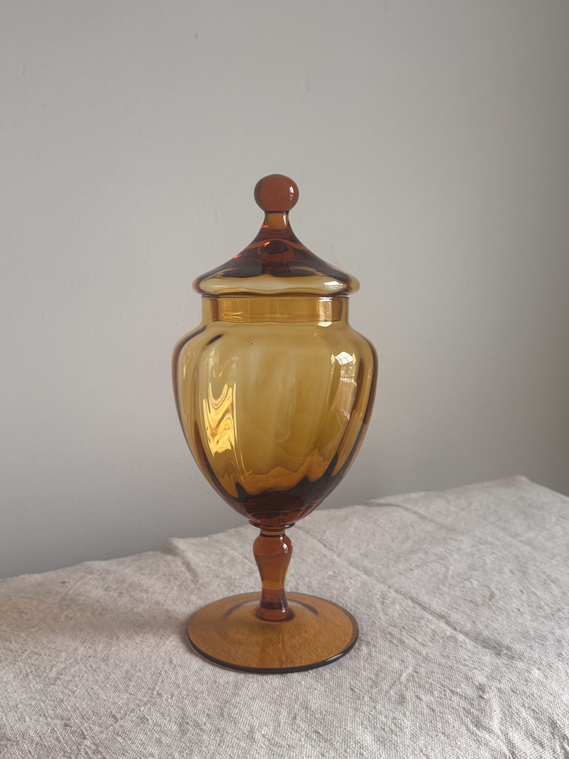 A striking Empoli glass apothecary jar from Italy, crafted in a glowing amber hue with a graceful, elongated silhouette. Elevated on a slender pedestal base and finished with a domed lid, this piece feels both architectural and romantic—an object designed to catch light and hold attention.