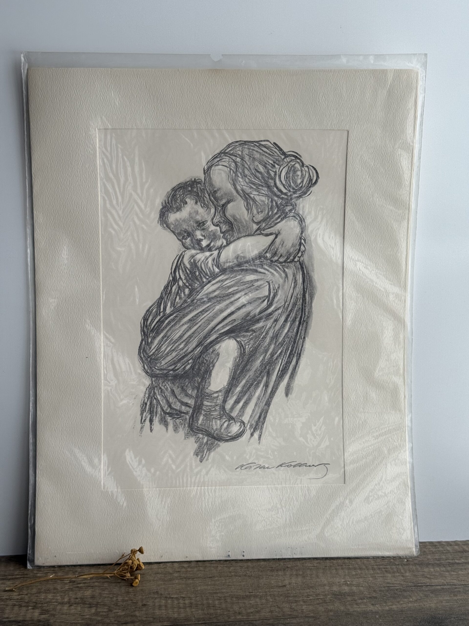 Vintage print ready for a frame! This is a reproduction print from the 1950s or 60s. Käthe Kollwitz is the artist and this piece is called Child in Arms. How perfect would this be in a nursery.