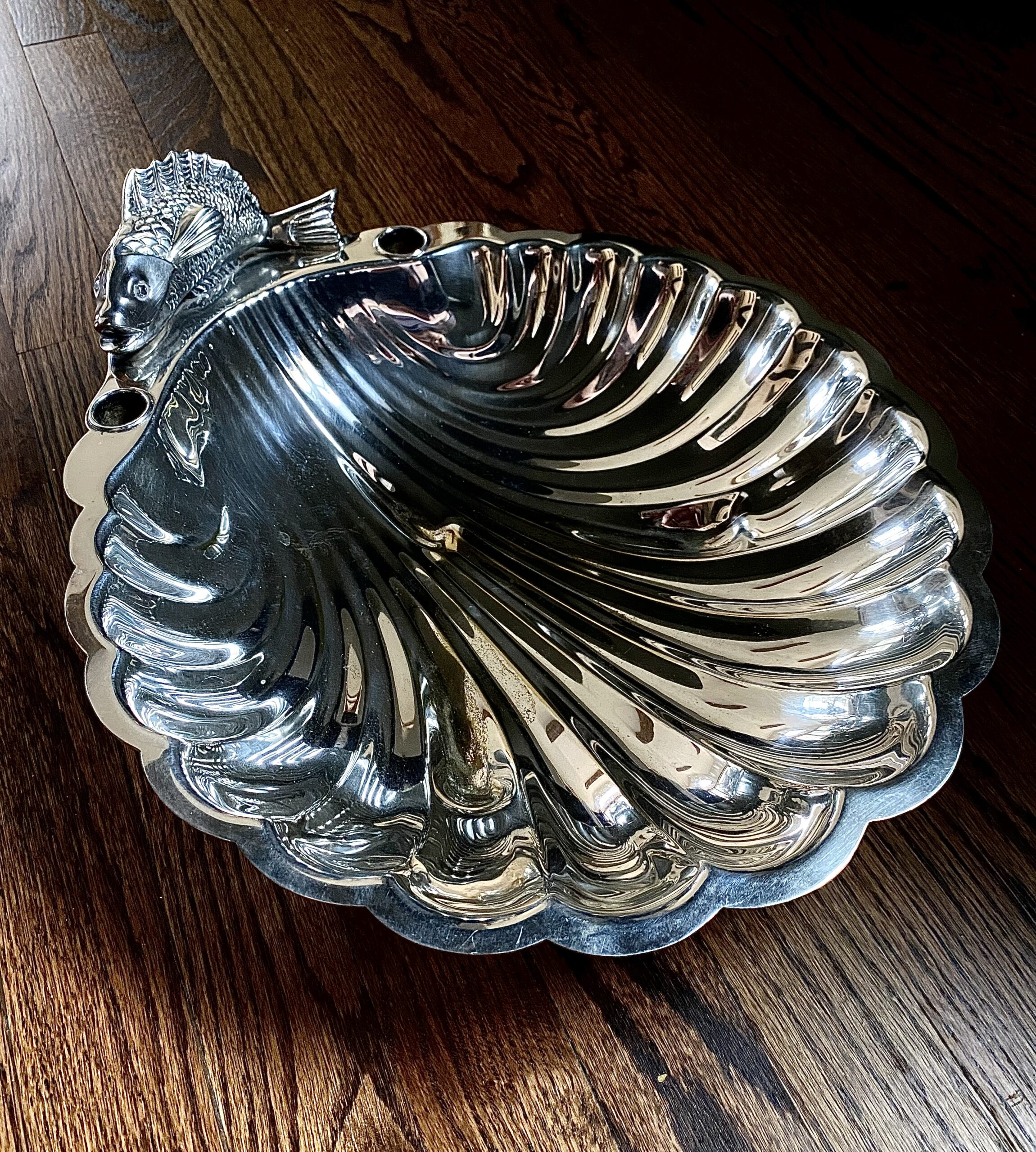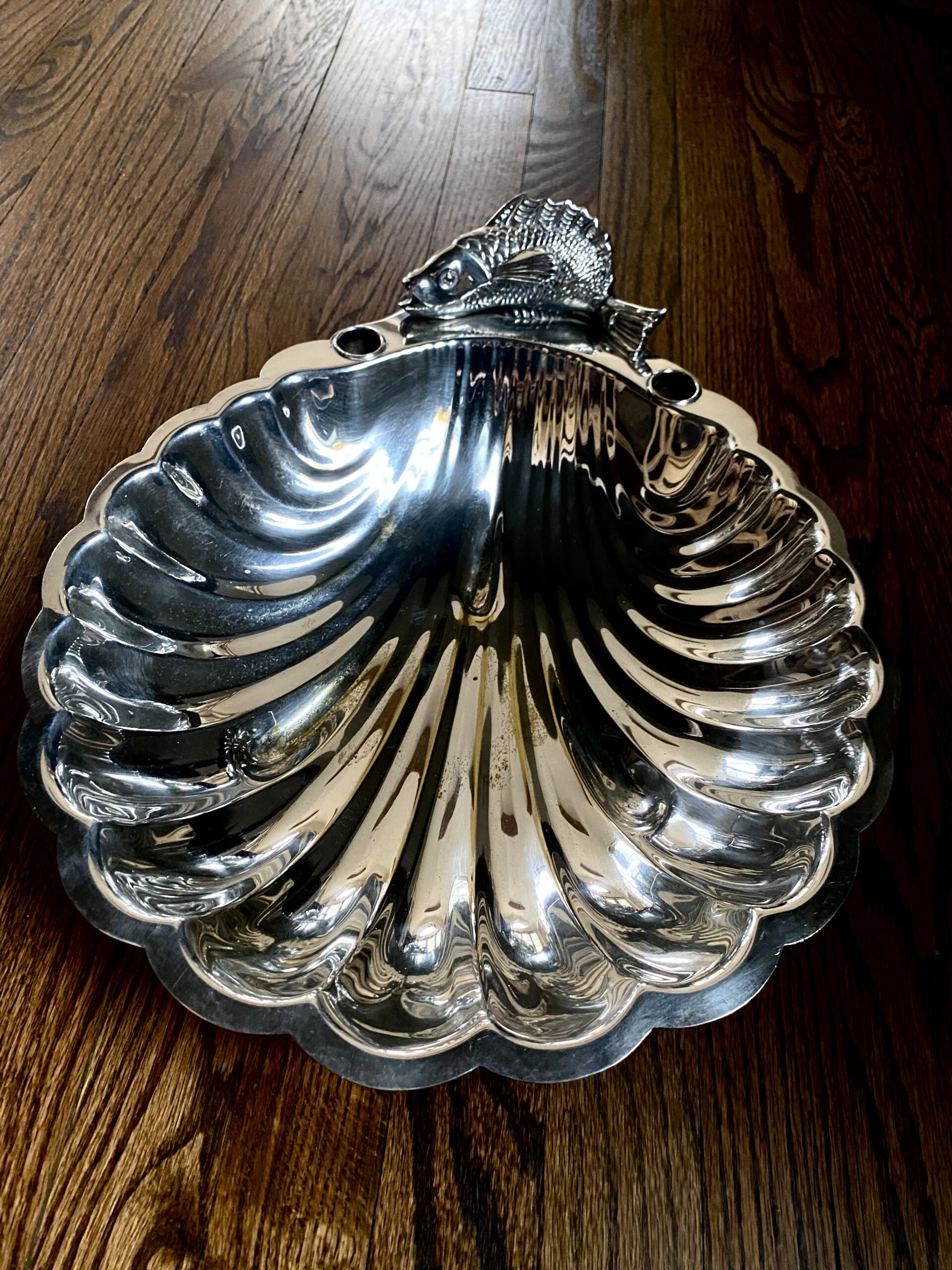 Large silver plated seafood appetizer server in shape of clam shell, with fish on the top and acanthus flower legs.. Has built in toothpick holders that can also be used as candlestick holders. Dates to the 1960’s. Measures 16″ x 13.5″