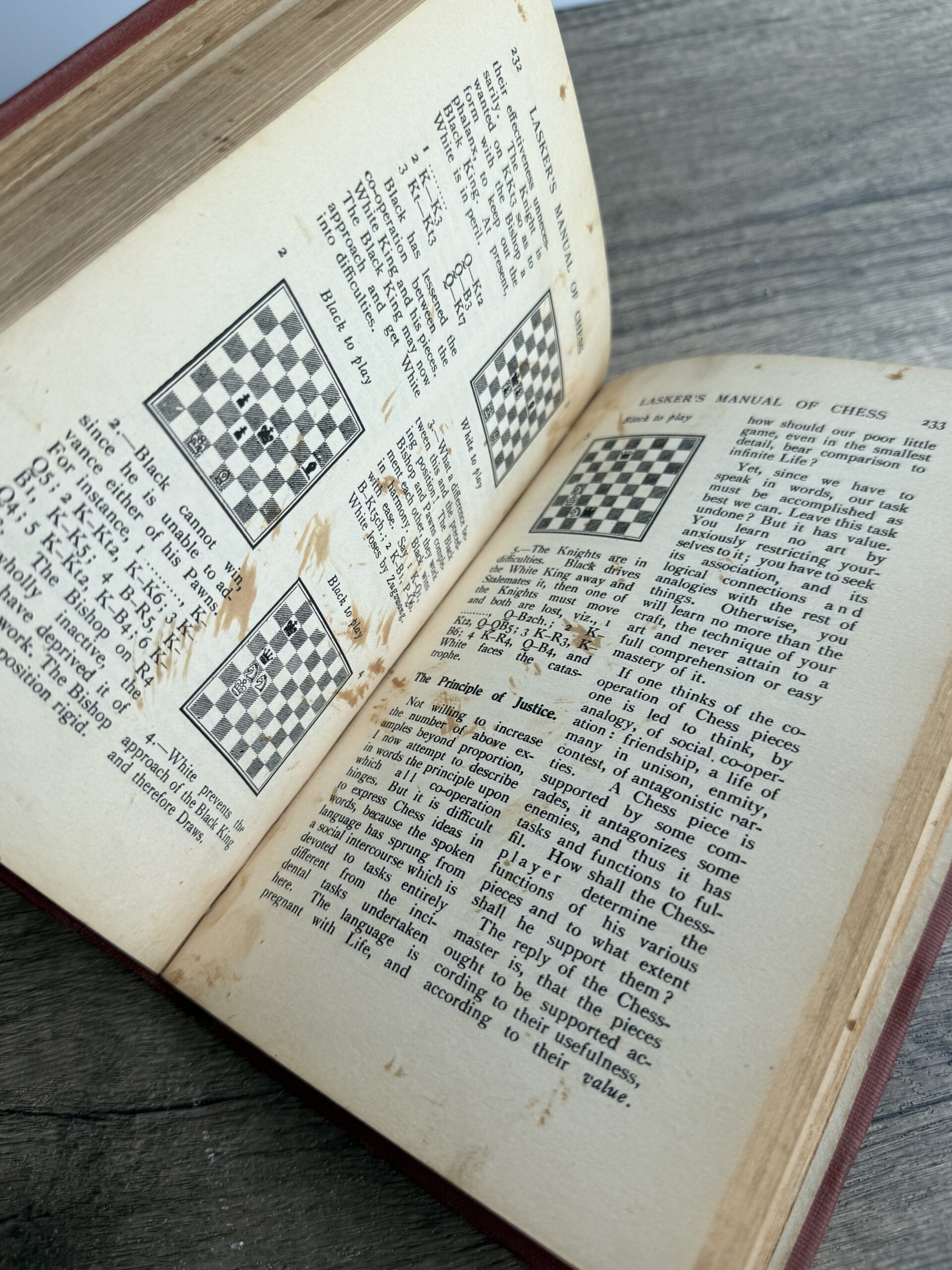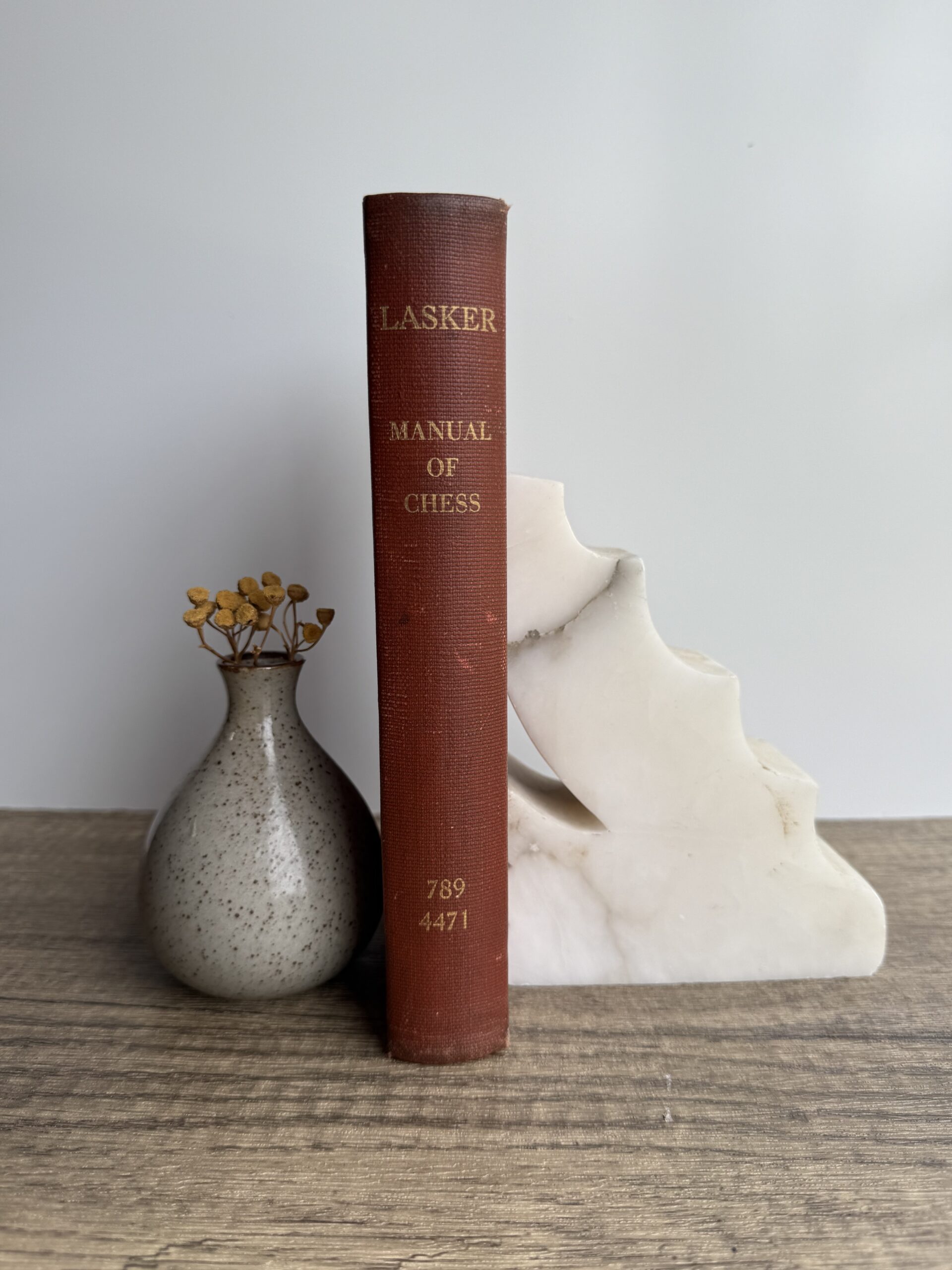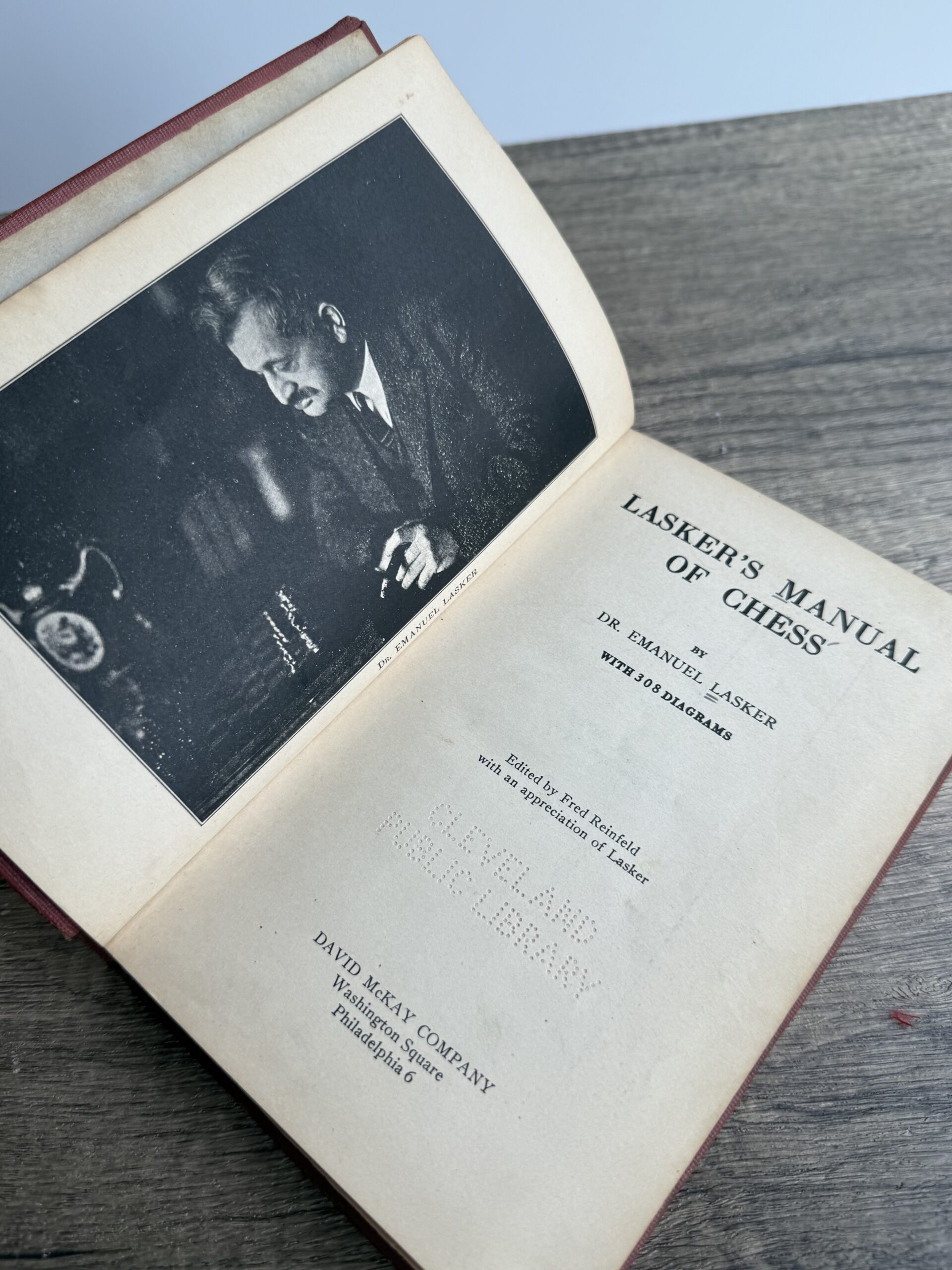 Lasker’s Manual of Chess by Dr. Emanuel Lasker. Was previously a library book at the Cleveland Public Library. Has the slot on the back inside cover. There are some pencil inscriptions and foxing on some pages. Photo 4 shows some foxing, the worst of it