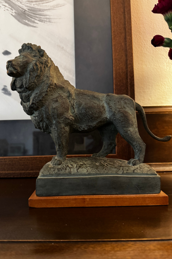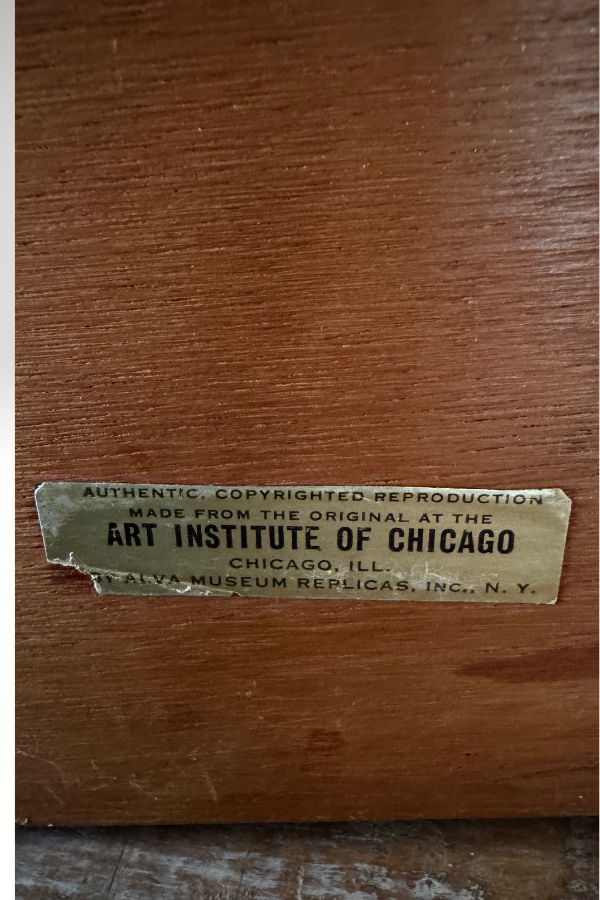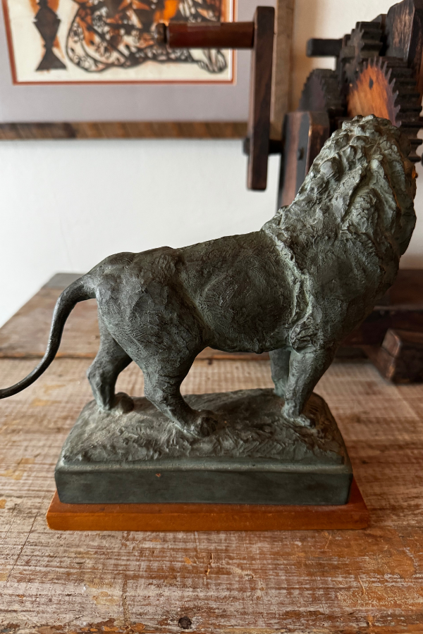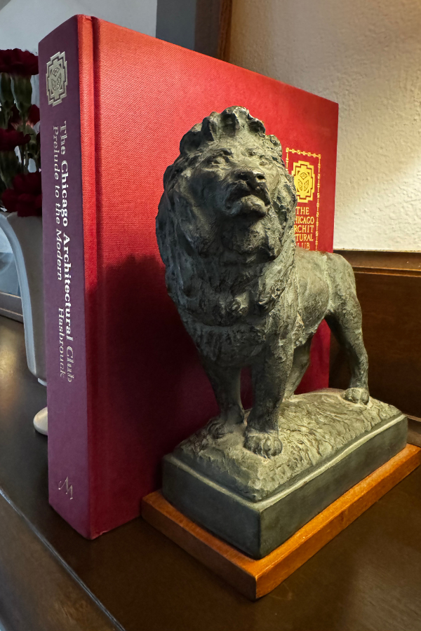 Bookend reproduction of Chicago Art Institute lion. Heavy, but not metal -some sort of manufactured material, I believe. On wooden base. Still sold through the museum shop, but this is vintage. Original foil label on the bottom.