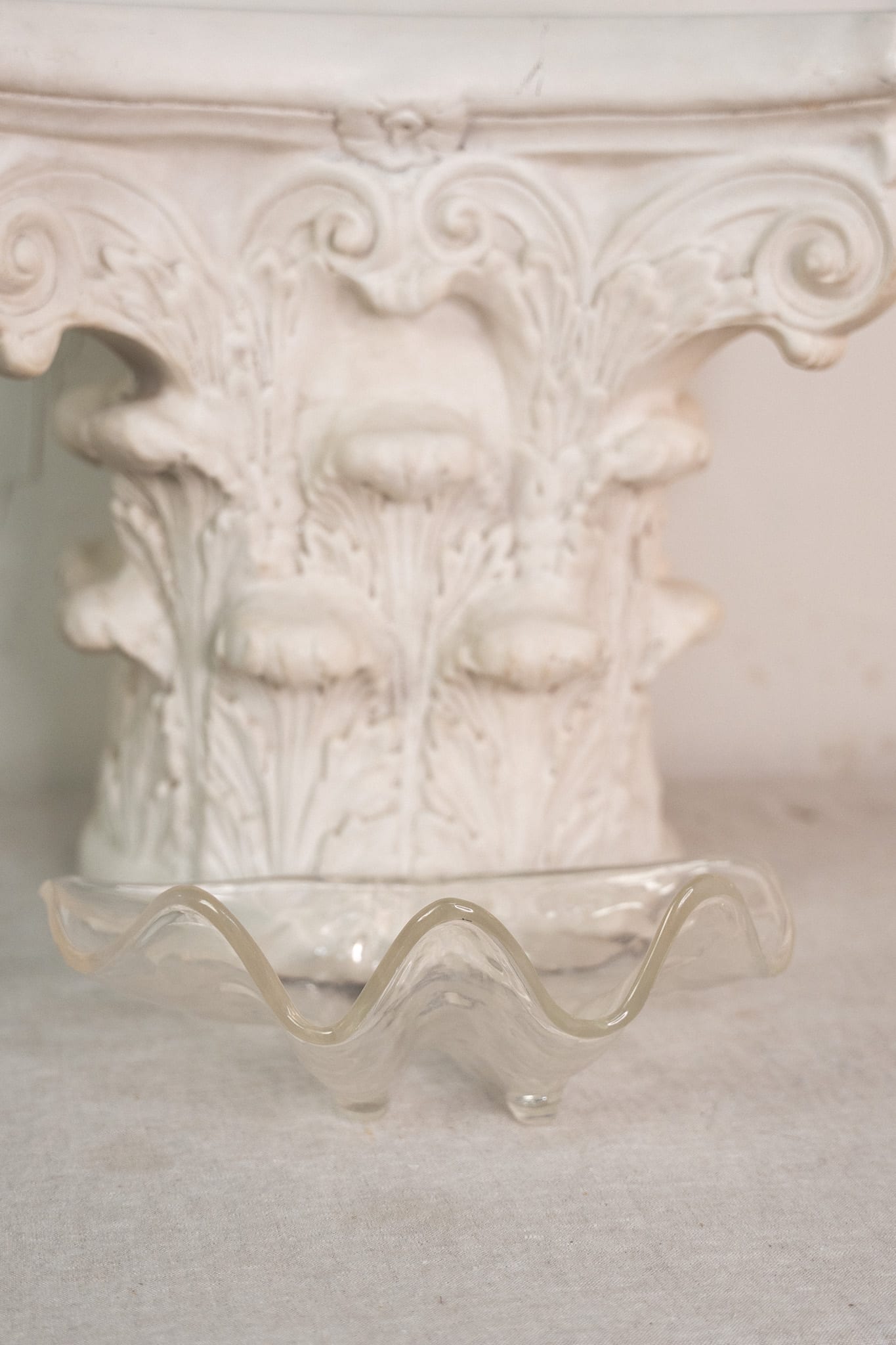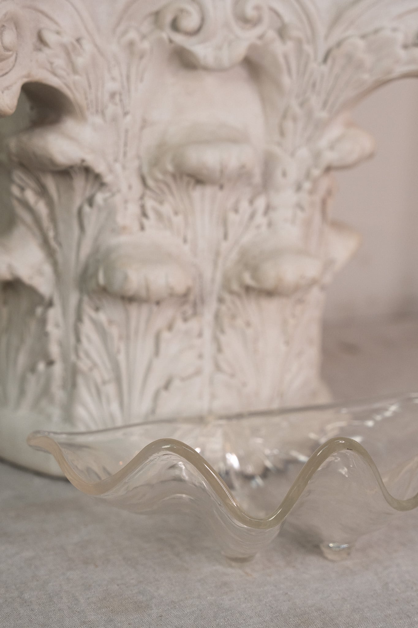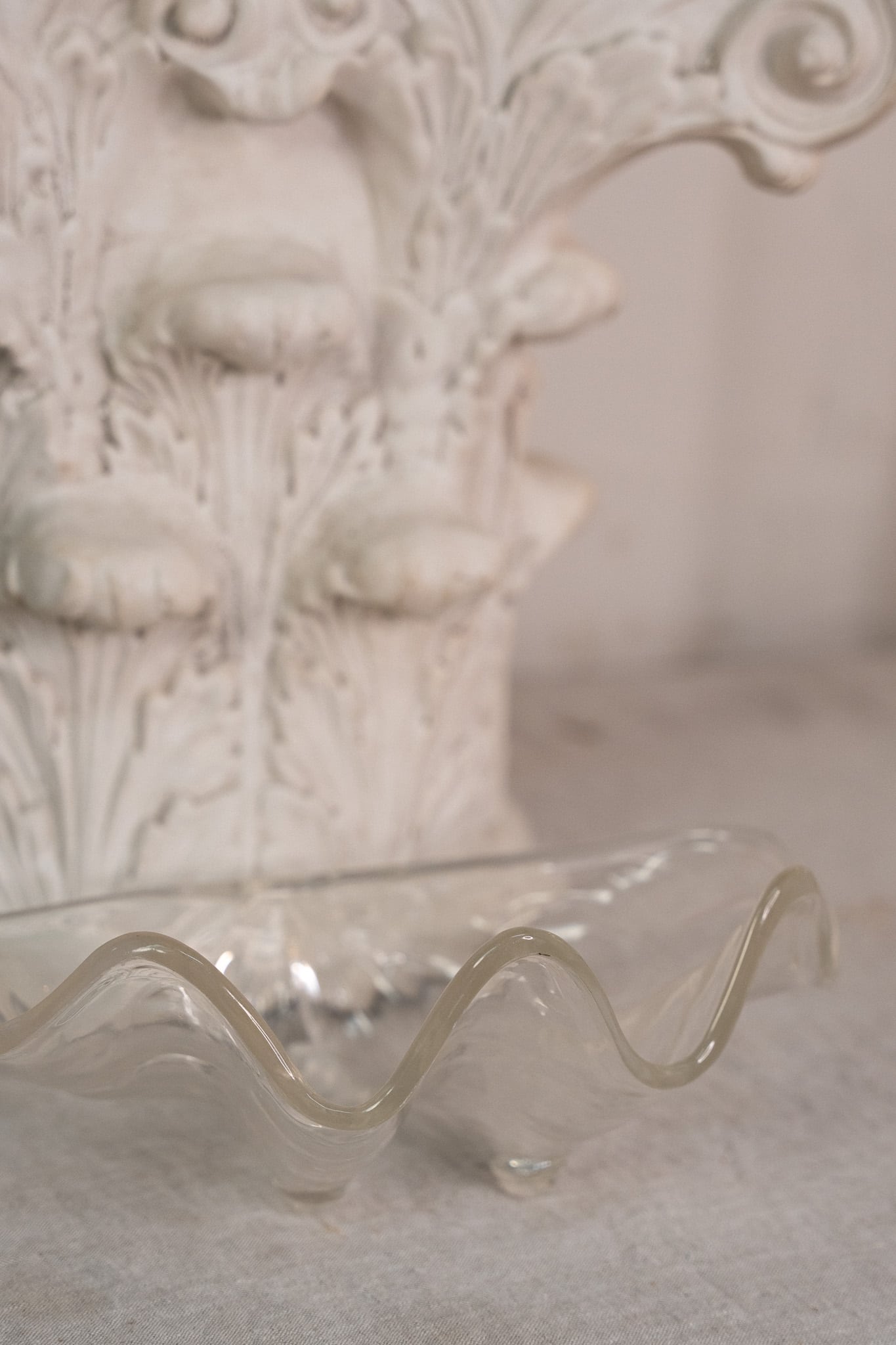 Lucite clamshell bowl. Perfect to use as a fruit bowl or to hold beautiful candy/matchboxes. Scratches throughout consistent with age.
