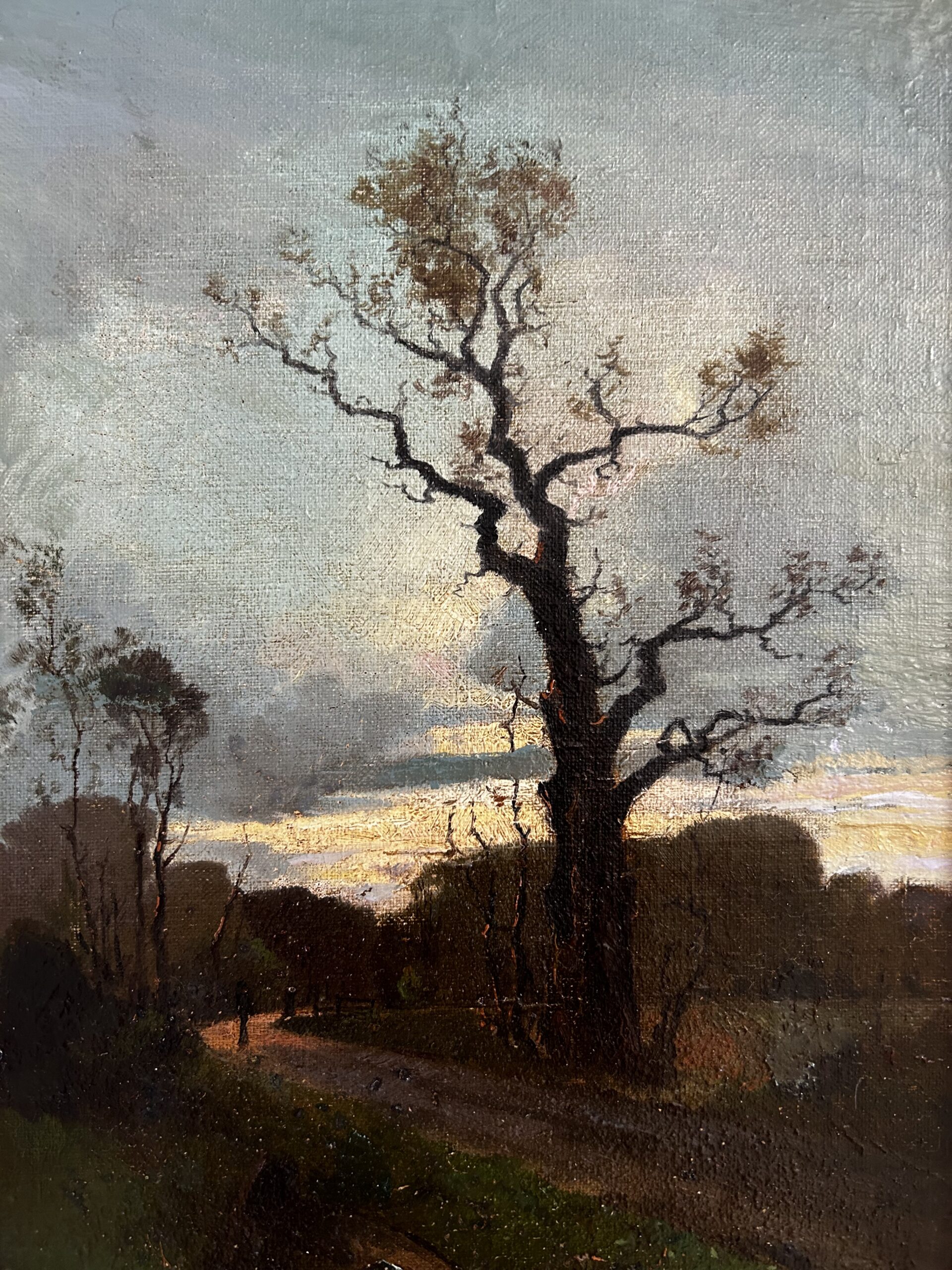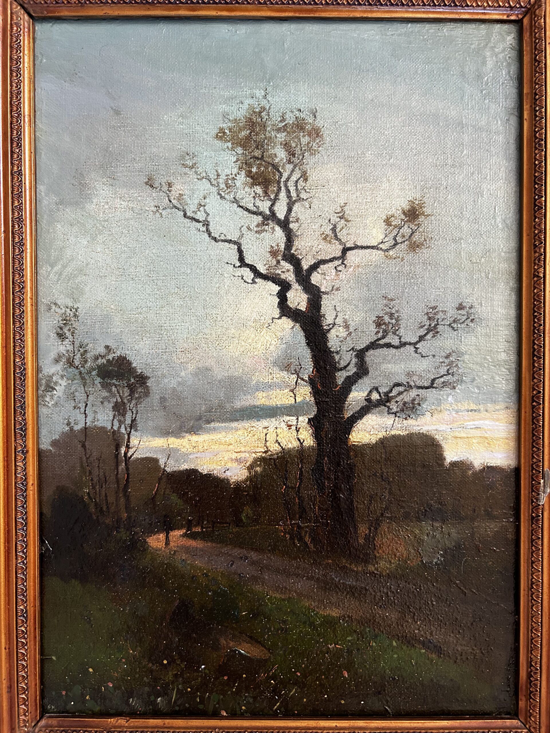 This beautiful piece depicts a soon-to-blossom tree at dusk. The contrast is quite striking in the blue background. A dirt road leads to silhouettes in the background.