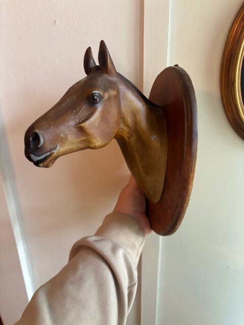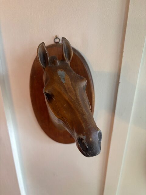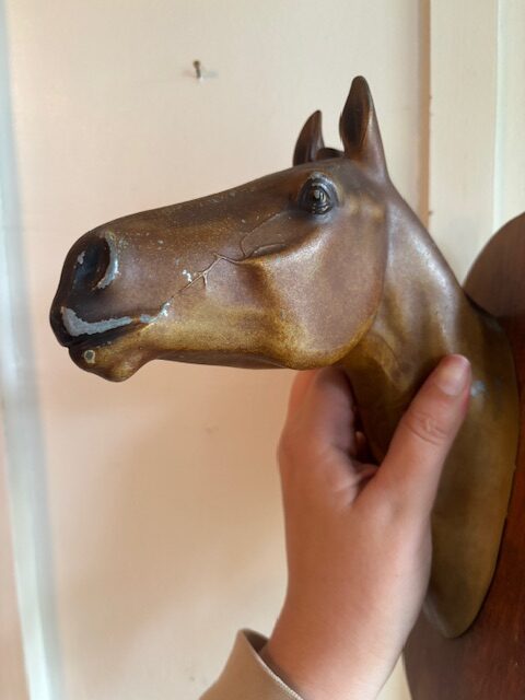 Metal Mounted horse head wall plaque. There is paint loss on the horses face and neck. Wood is in good condition and piece is ready for hanging. Because piece is made from metal, it is weighted. Measures 10″x 6″