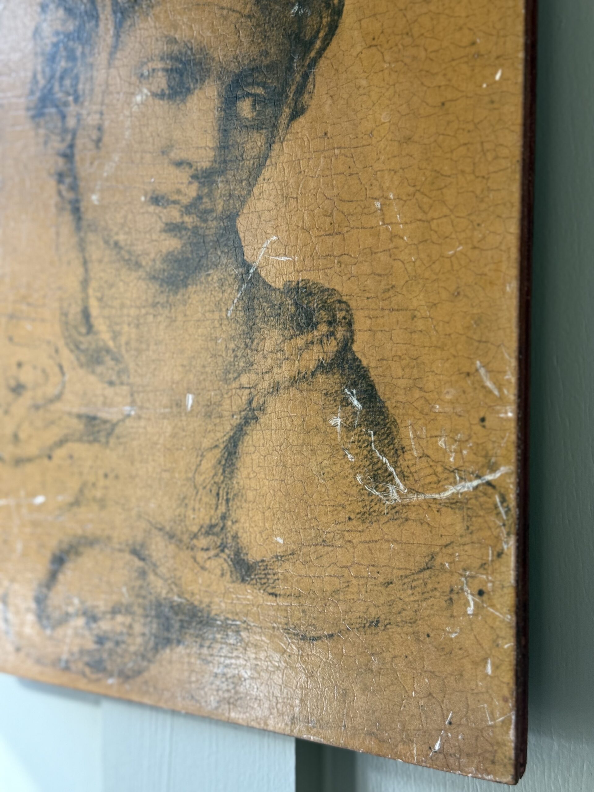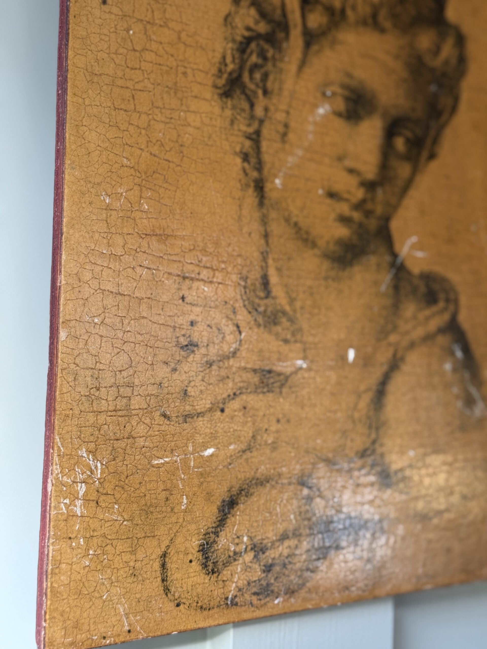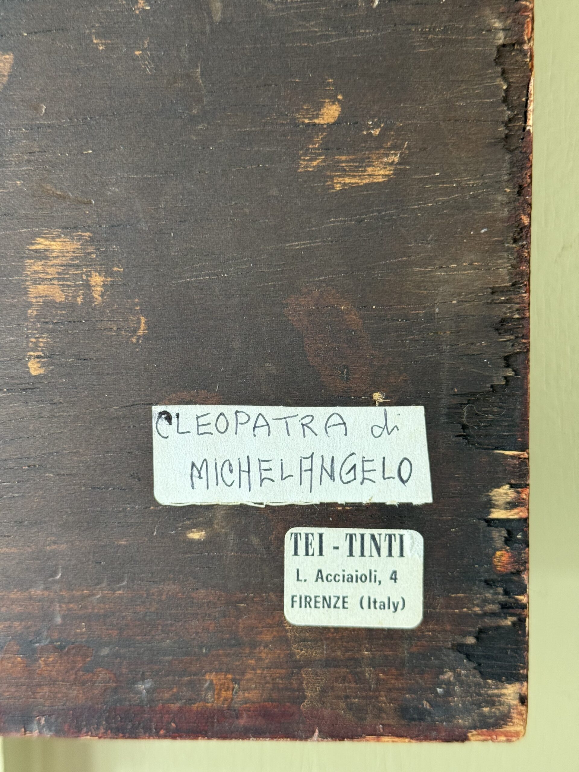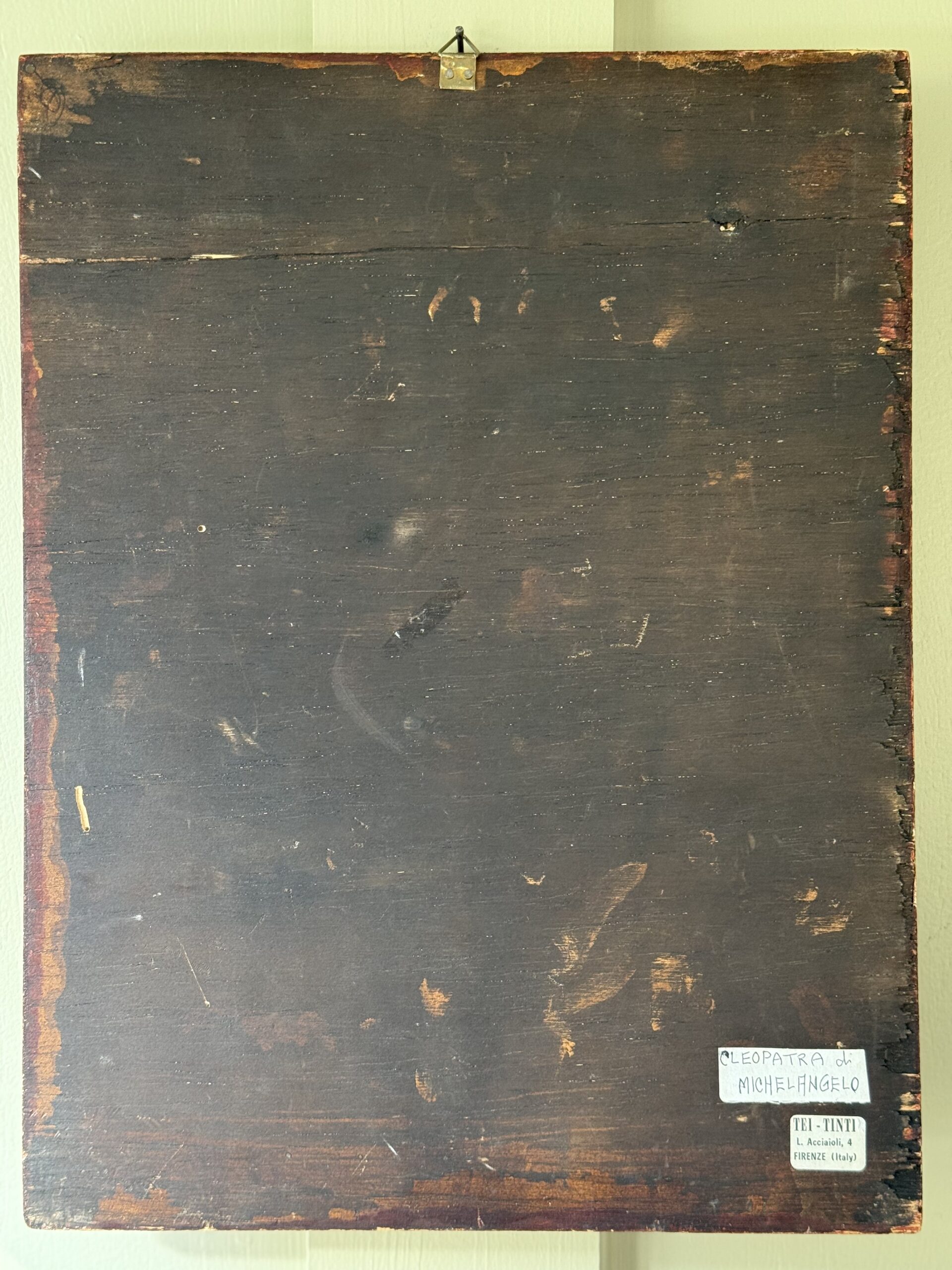 Print of Cleopatra by Michelangelo on wood. Sticker on back says Italy. Has some scratching on the print (shown in photos 2&3)
