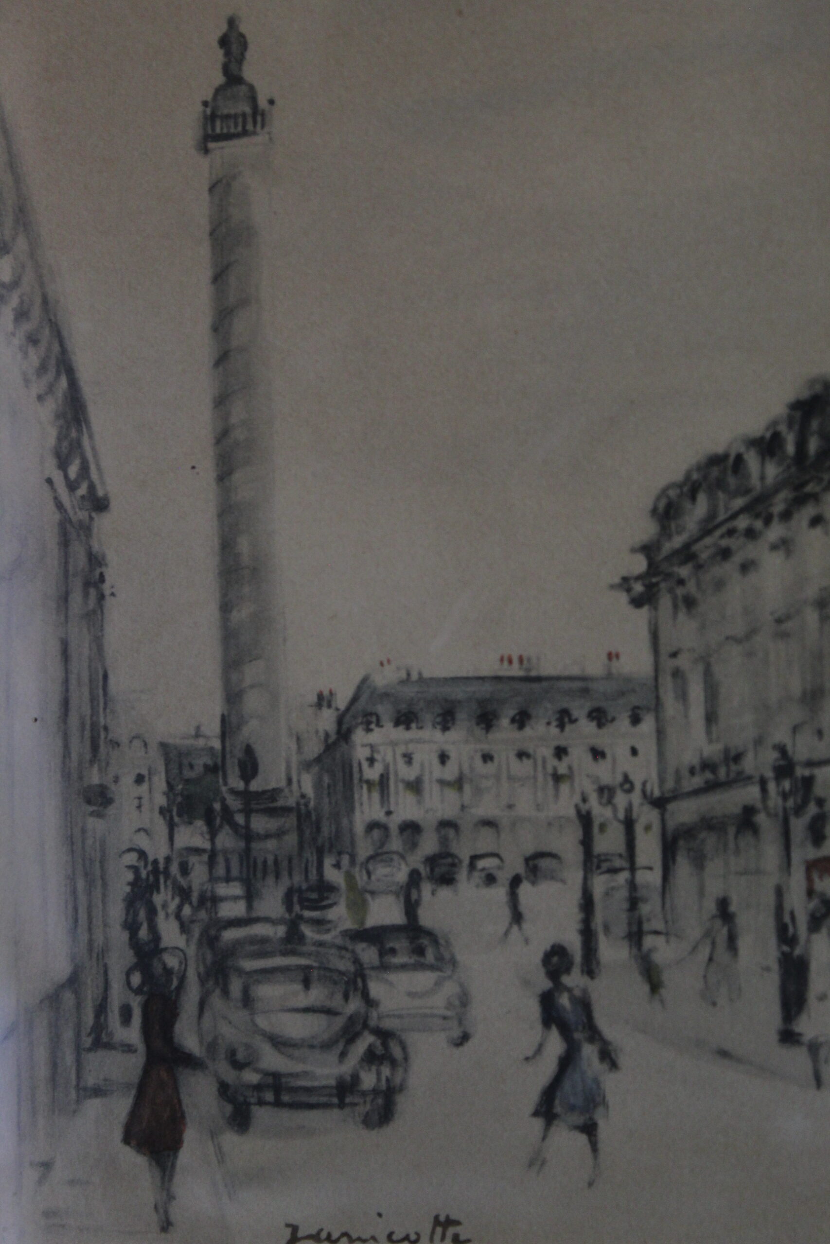 Gorgeous mid century watercolor of the iconic Place Vendome in Paris, France. Depicting women walking along the street in beautiful picturesque Paris. A classic and elegant piece of original signed artwork perfect for a gallery wall or on its own for a sophisticated and upscale feel. Paper has aged and yellowed with a water stain on the left side. Frame has some wear to it.