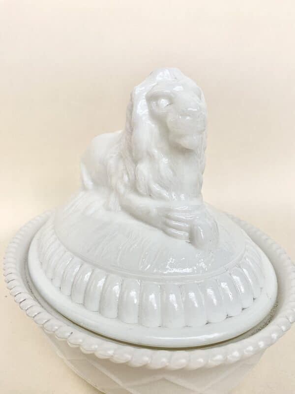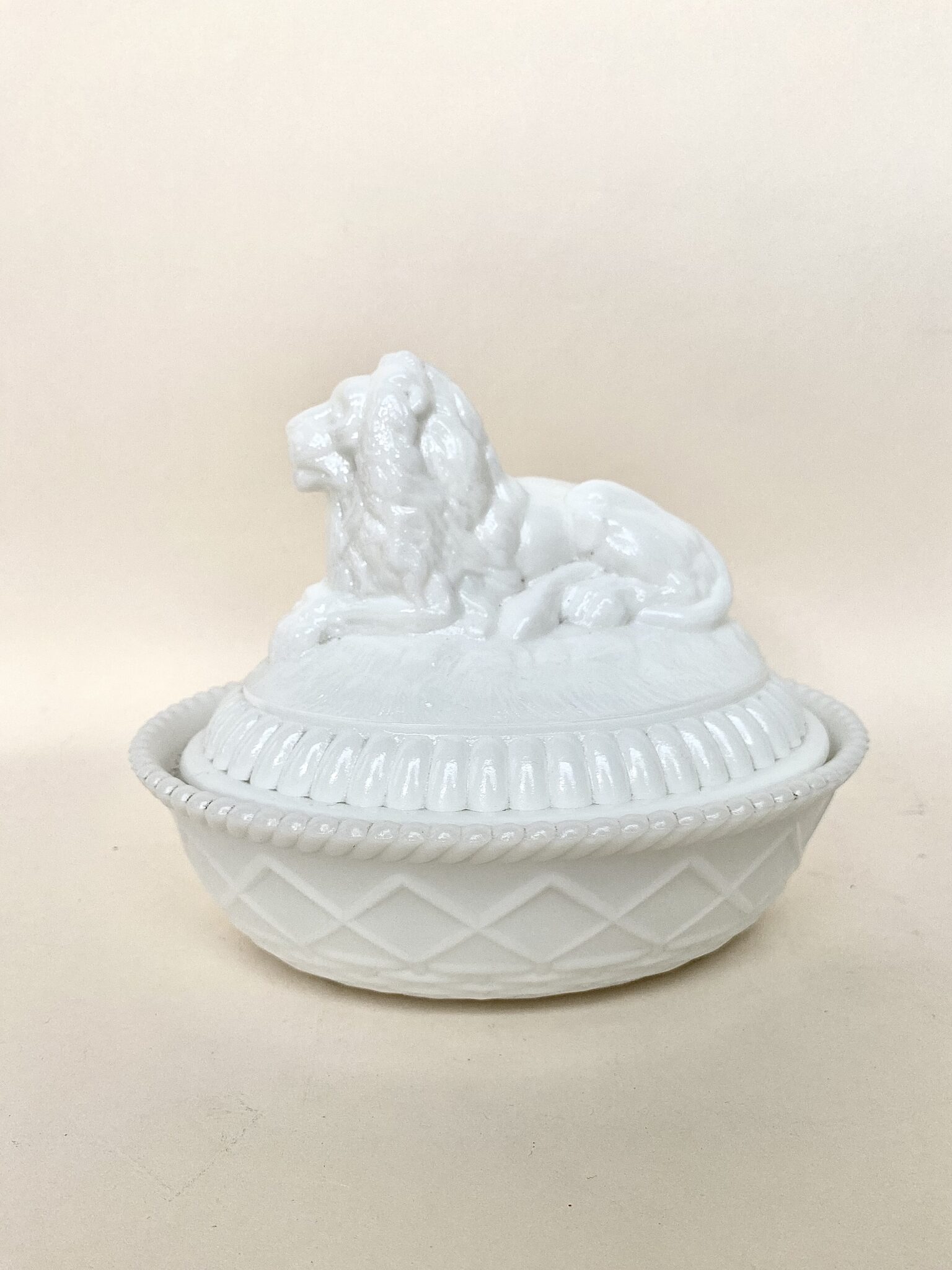 Vintage Westmoreland milk glass lion covered dish/bowl. Westmorland is known for their high quality milk glass. This piece was made between the 1920s-1950s. It measures 7 1/2″ wide by 6″, and is 6″ high with the top on.