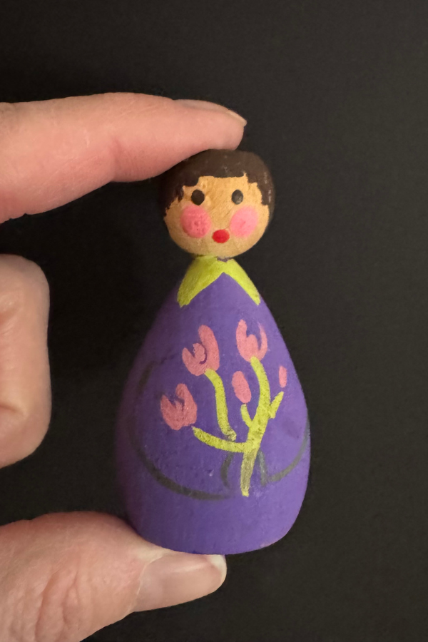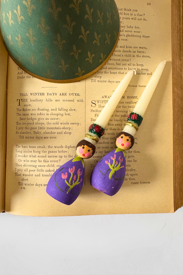 Miniature Danish wooden peg doll candle holders with Lucia-style candles. Made by Holline. 2.5” tall. Candles are 4” tall. Shipping is included but only within the contiguous US