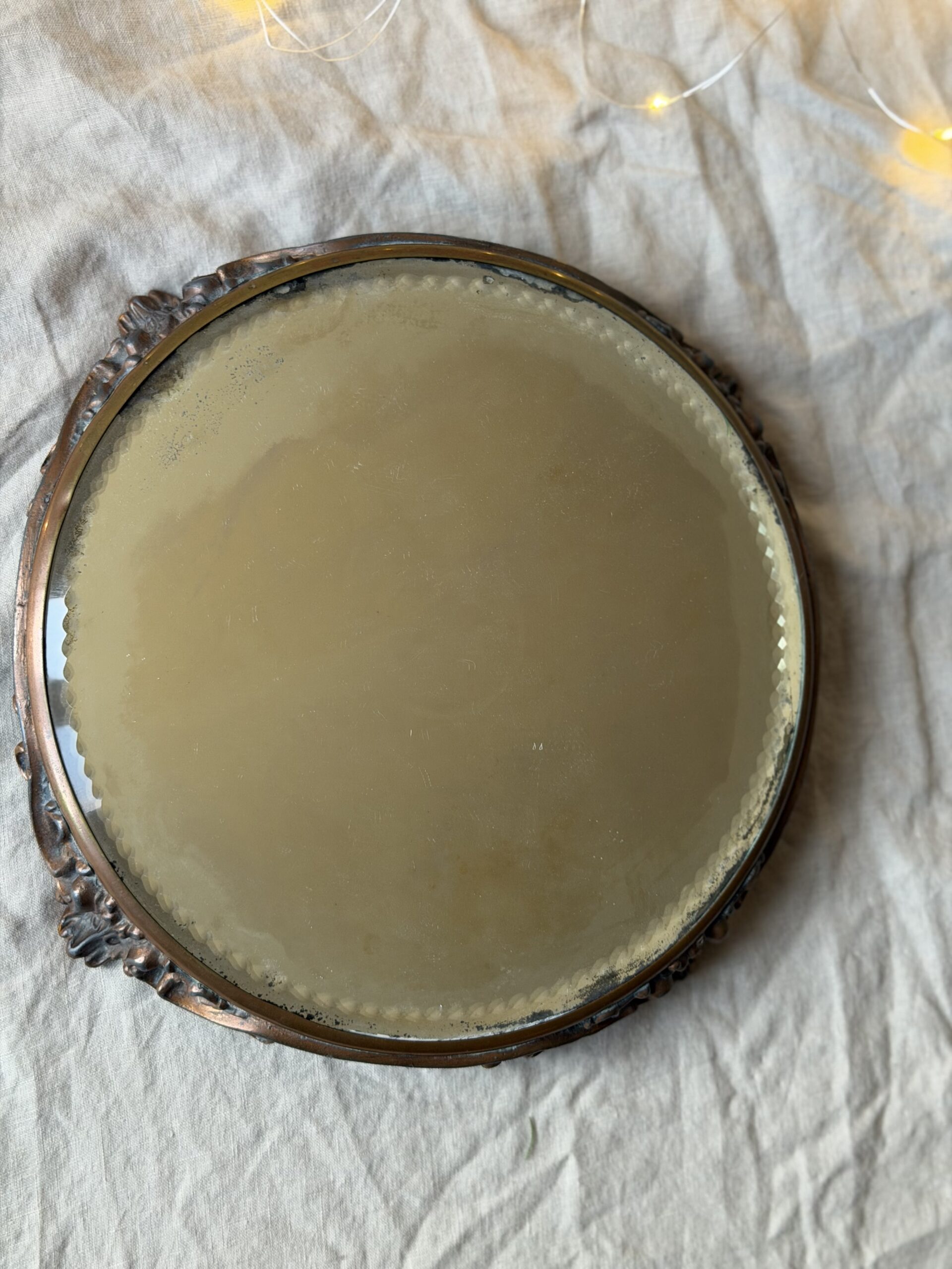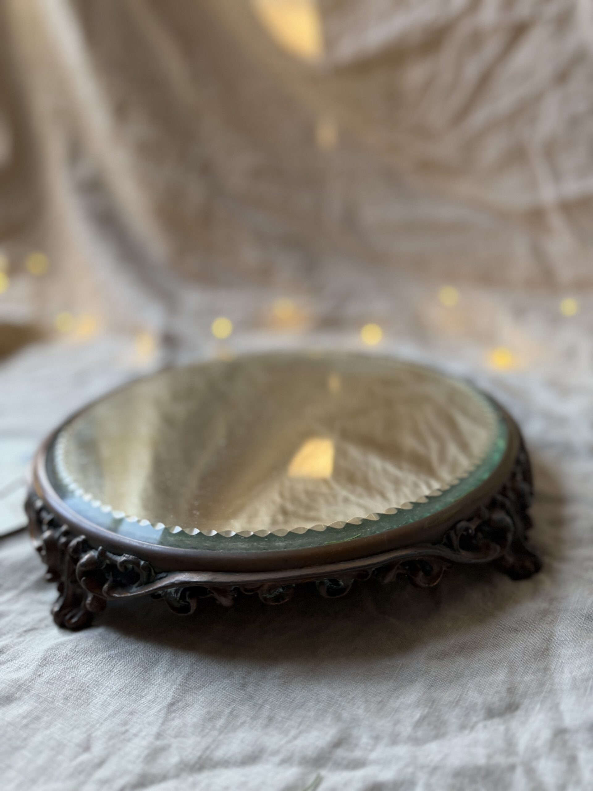 Gracefully aged with a gorgeous time-worn patina, this beveled glass mirror elevates the ordinary. Its scalloped edge catches the light softly creating a poetic atmosphere.