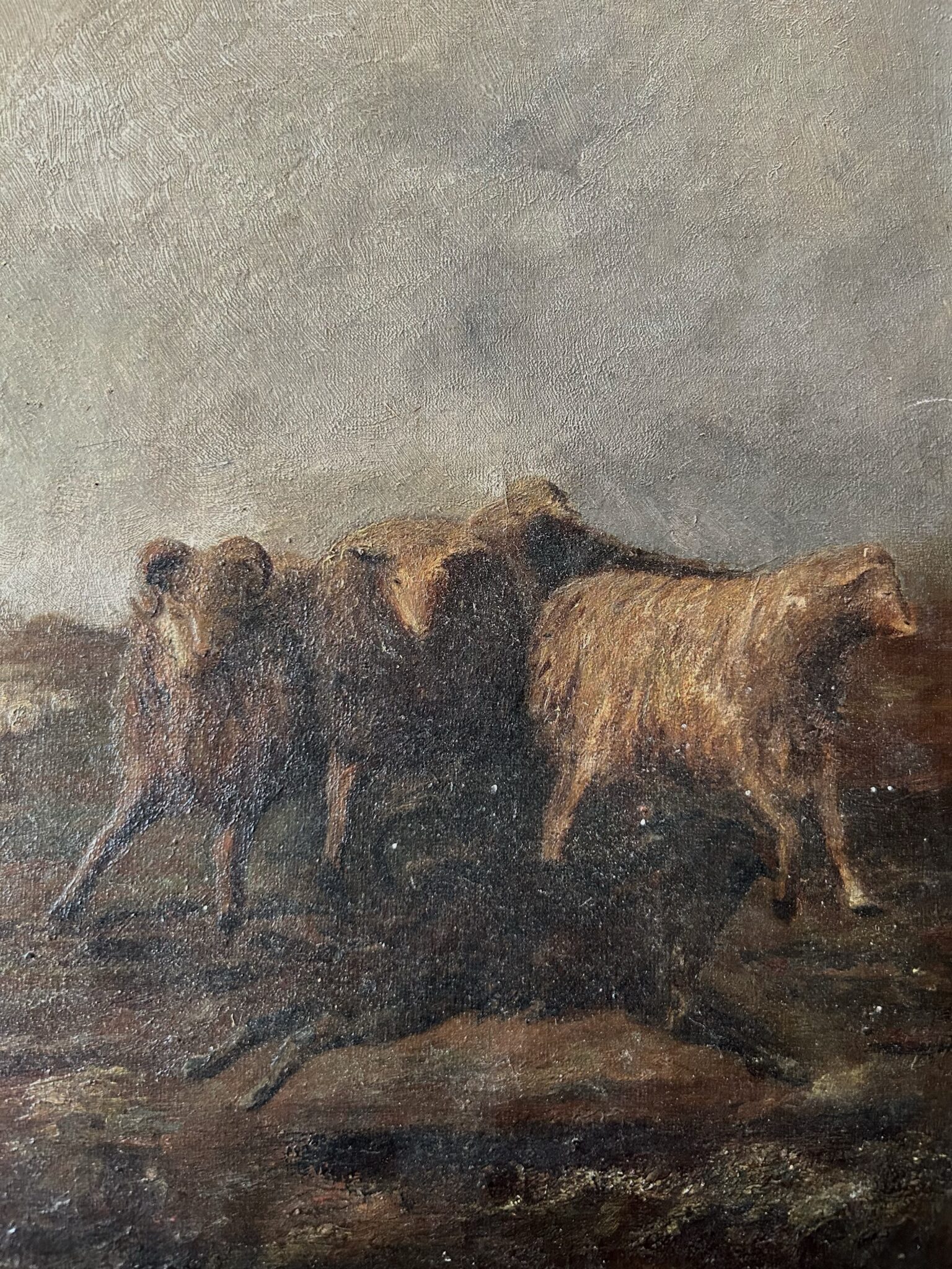 A depiction of sheep grazing beneath the brooding skies of a bygone era. This piece has been skillfully crafted with a captivating interplay of light and darkness, evoking both a sense of solemnity and awe.