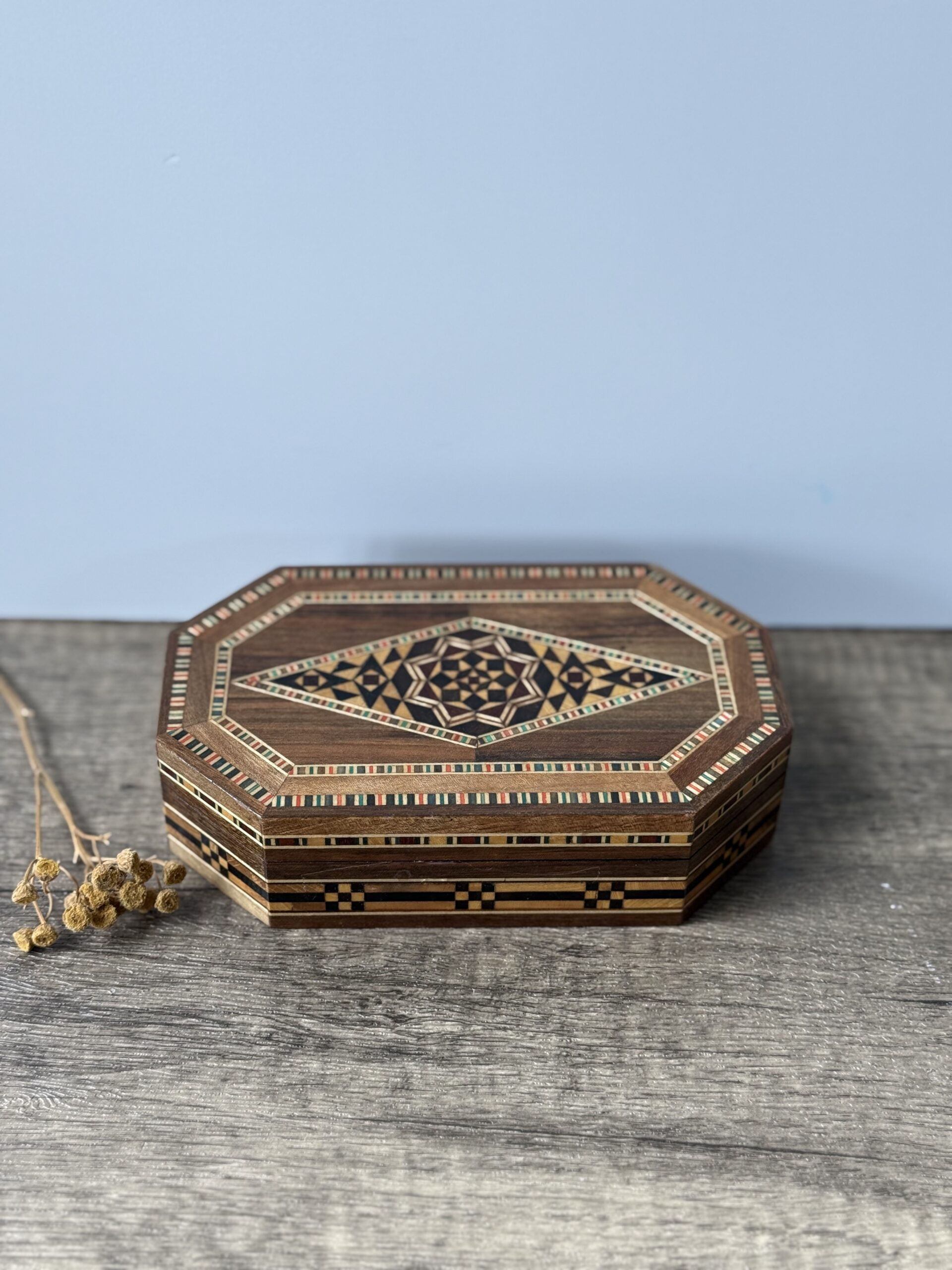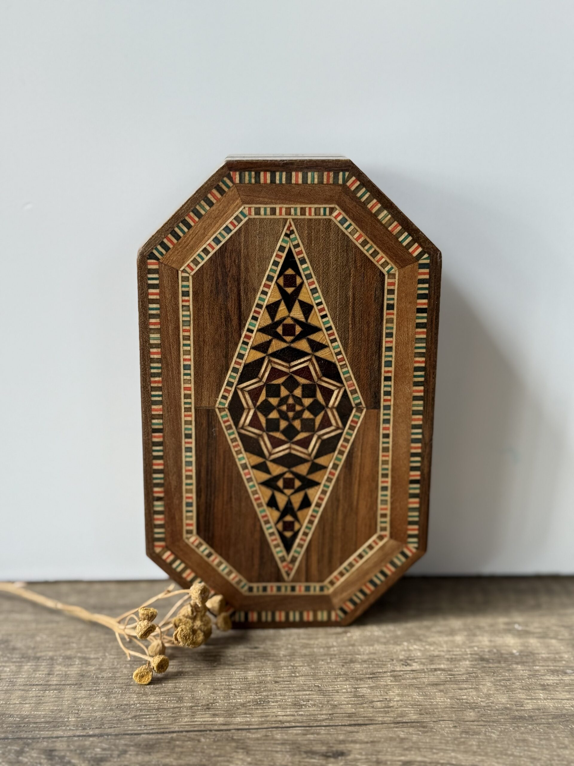 Beautiful mosaic inlay wood box is perfect for holding your trinkets or jewelry. Also would be great just as decor because of how beautiful it is!