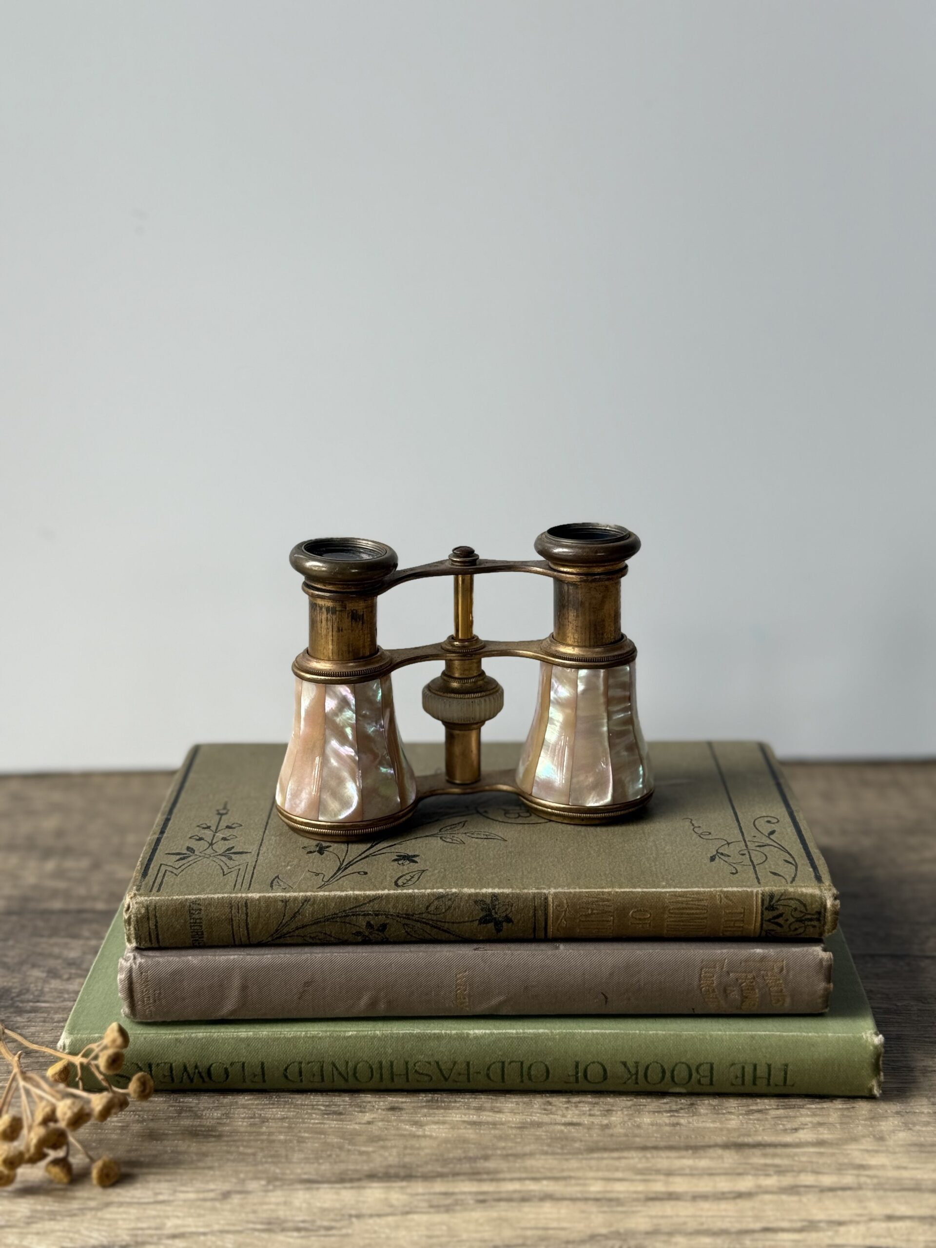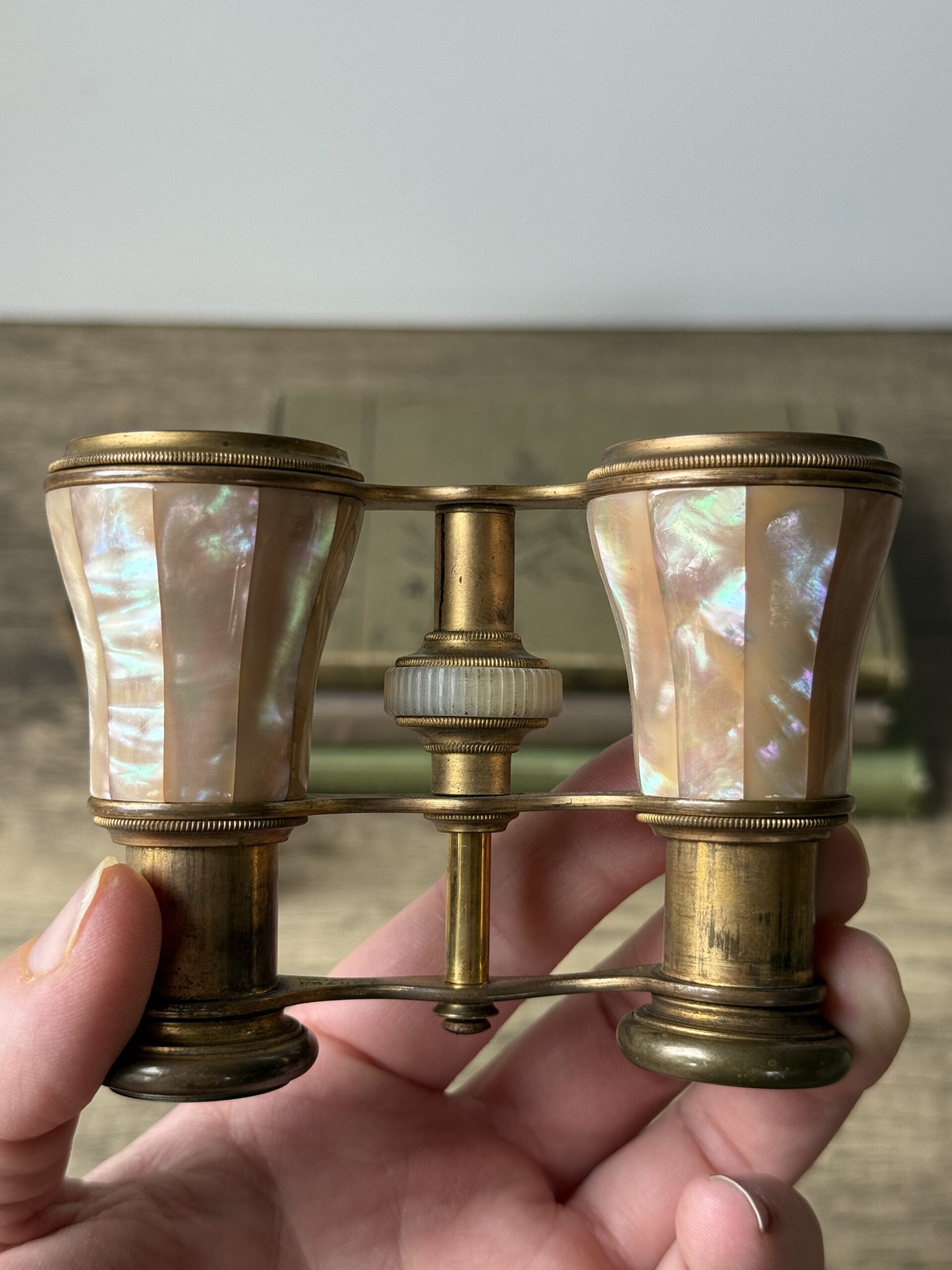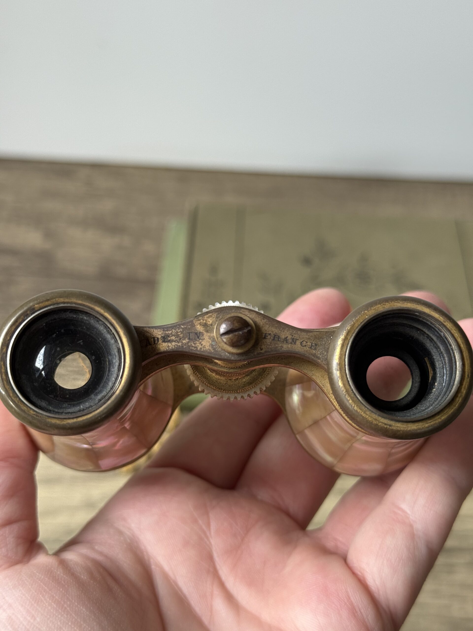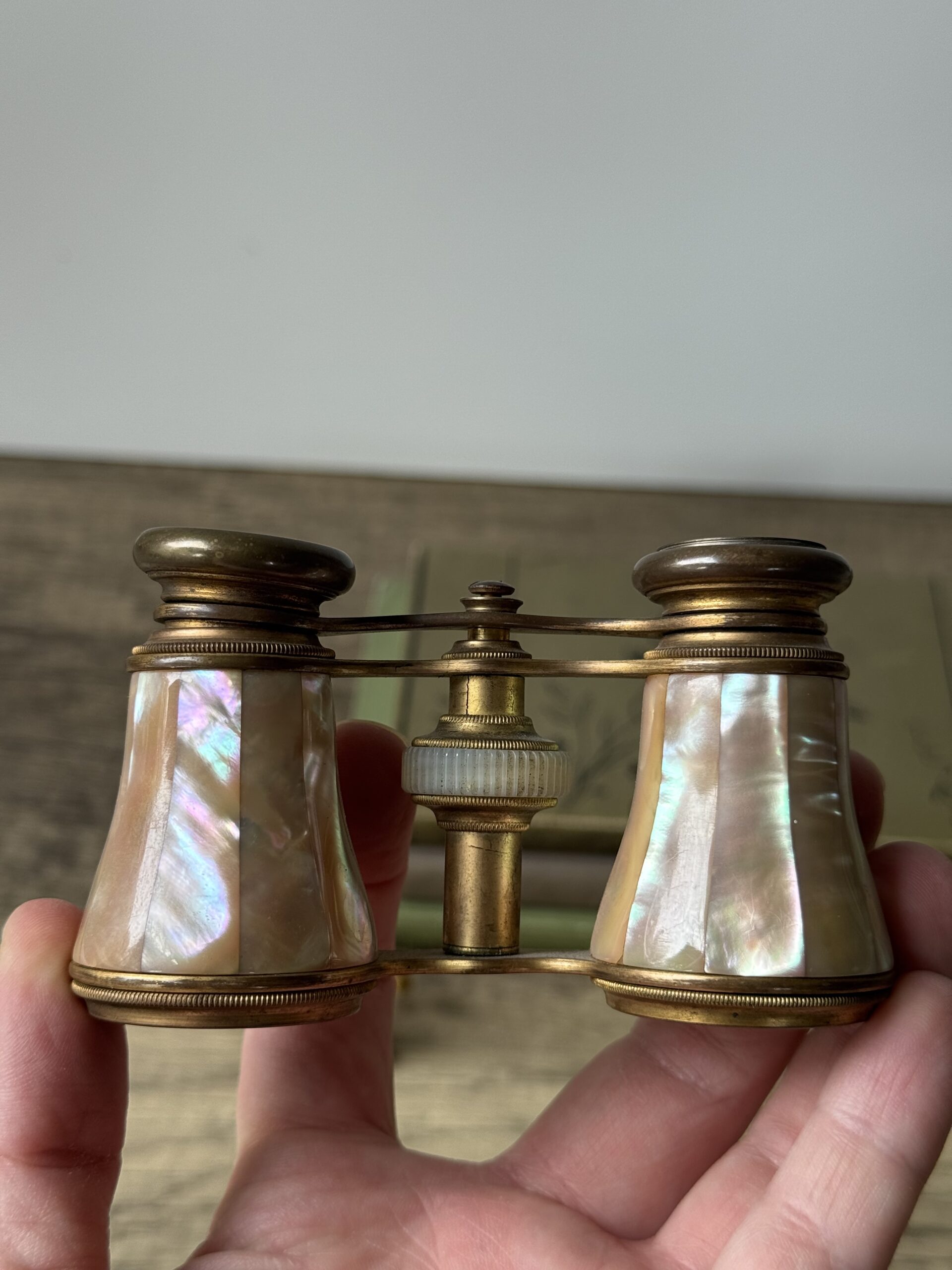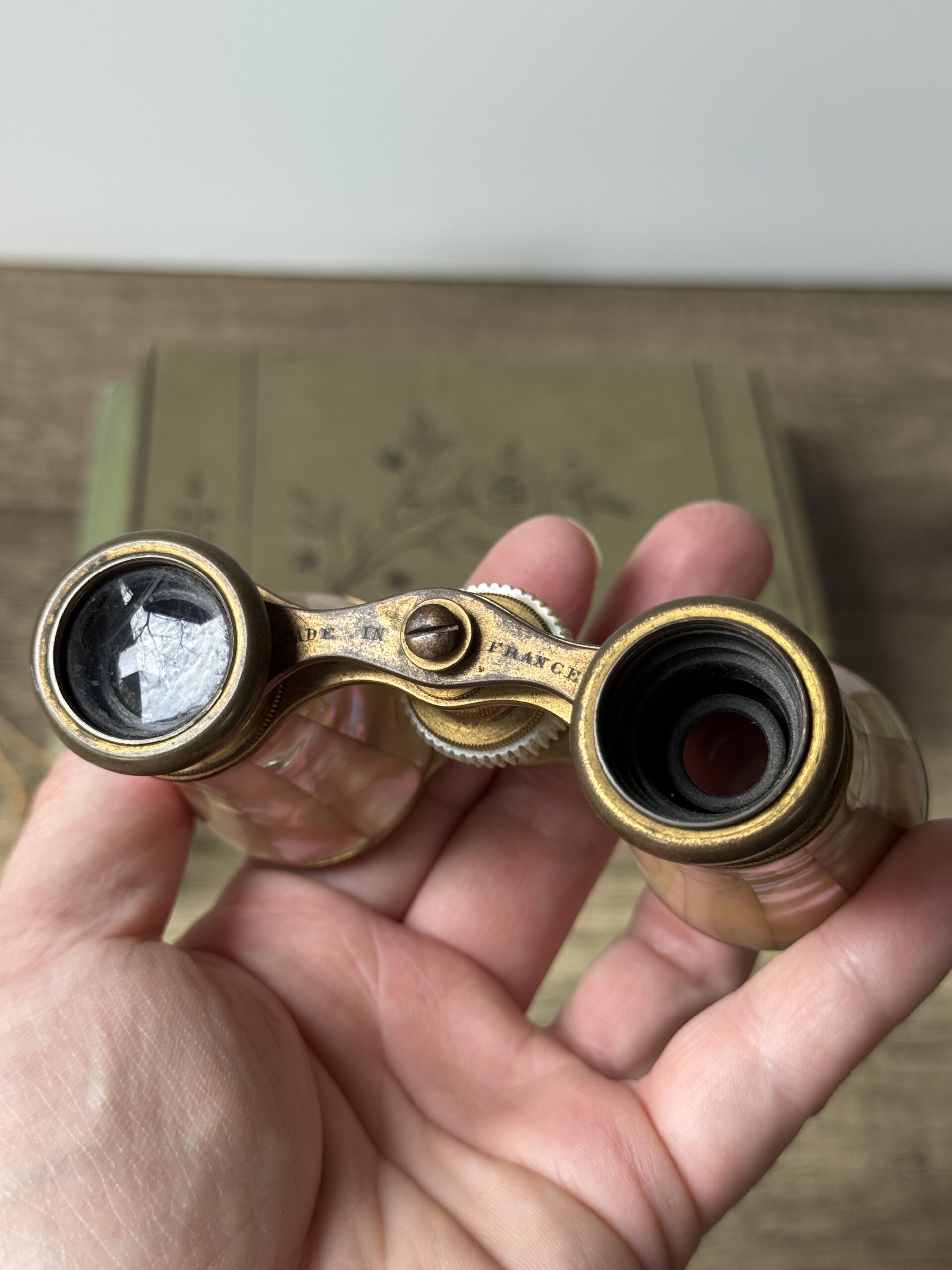 Beautiful mother of pearl opera glasses. They are a brass color. Made in France. One side is missing a glass (show in photo 4) All mother of pearl pieces are in tact.