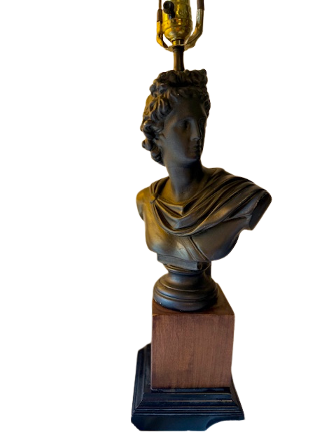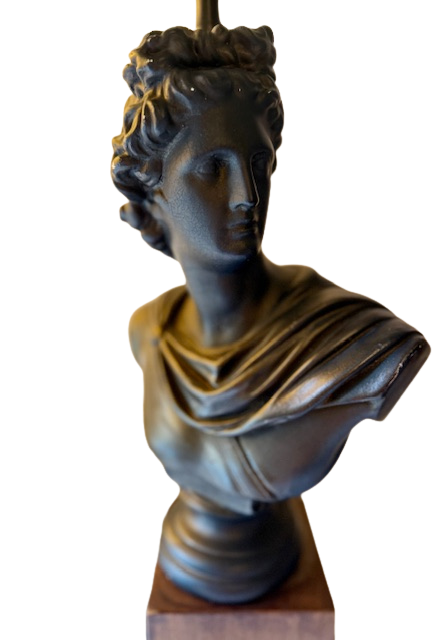 This neoclassical table lamp features a bust of a classical figure, possibly a Roman or Greek goddess or god. The lamp has a bronze finish and is mounted on a wooden base. The style is often described as Neoclassical, Hollywood Regency or Art Deco.