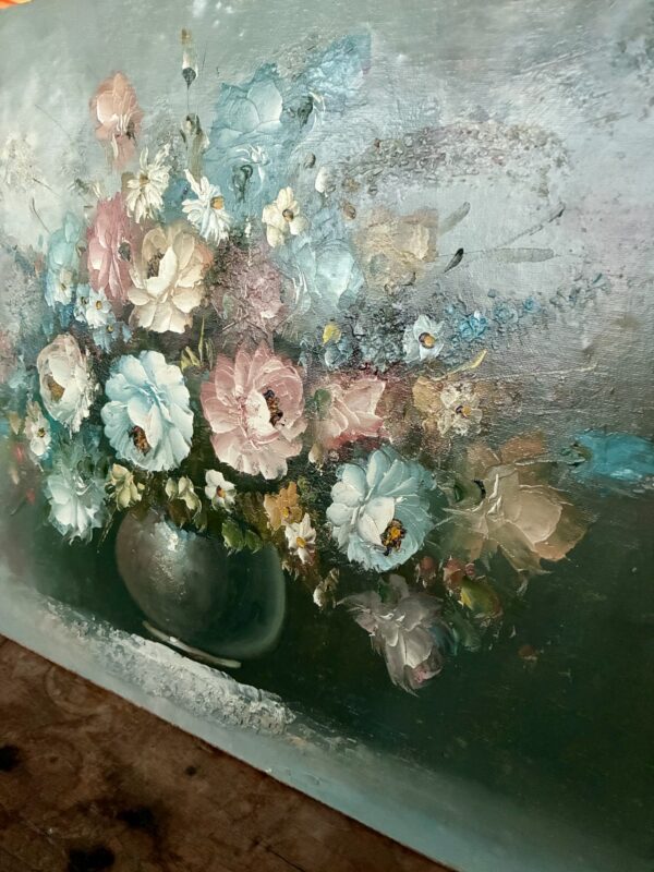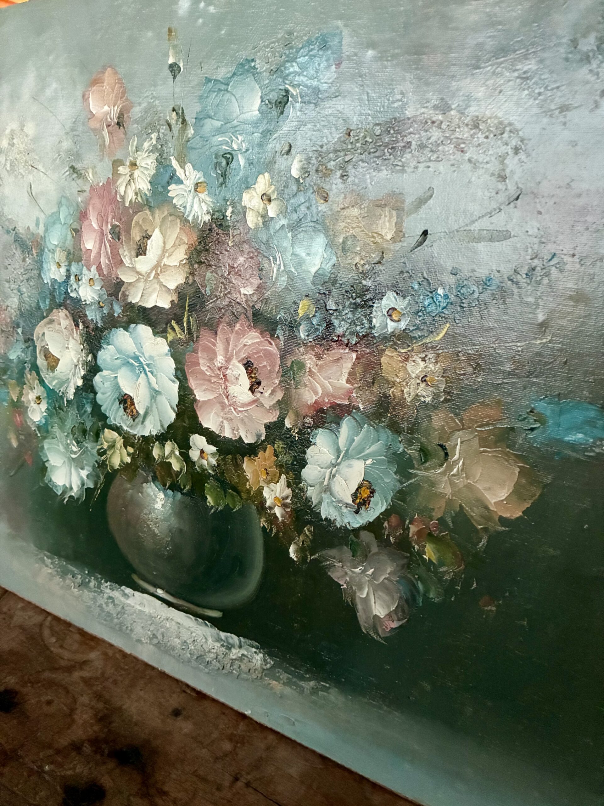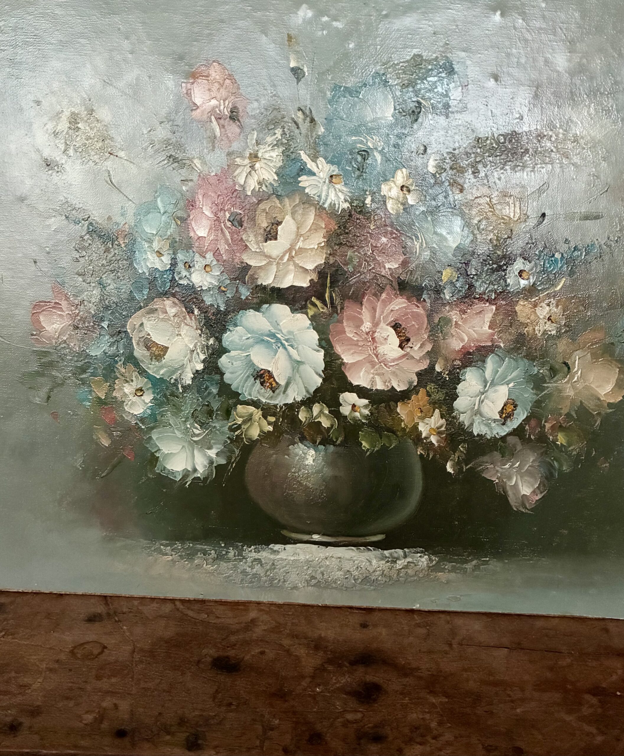 A bounty of flowers set in a vase against the back drop of a gray day. The soft palette that the artist used is a capture of delicate romance.