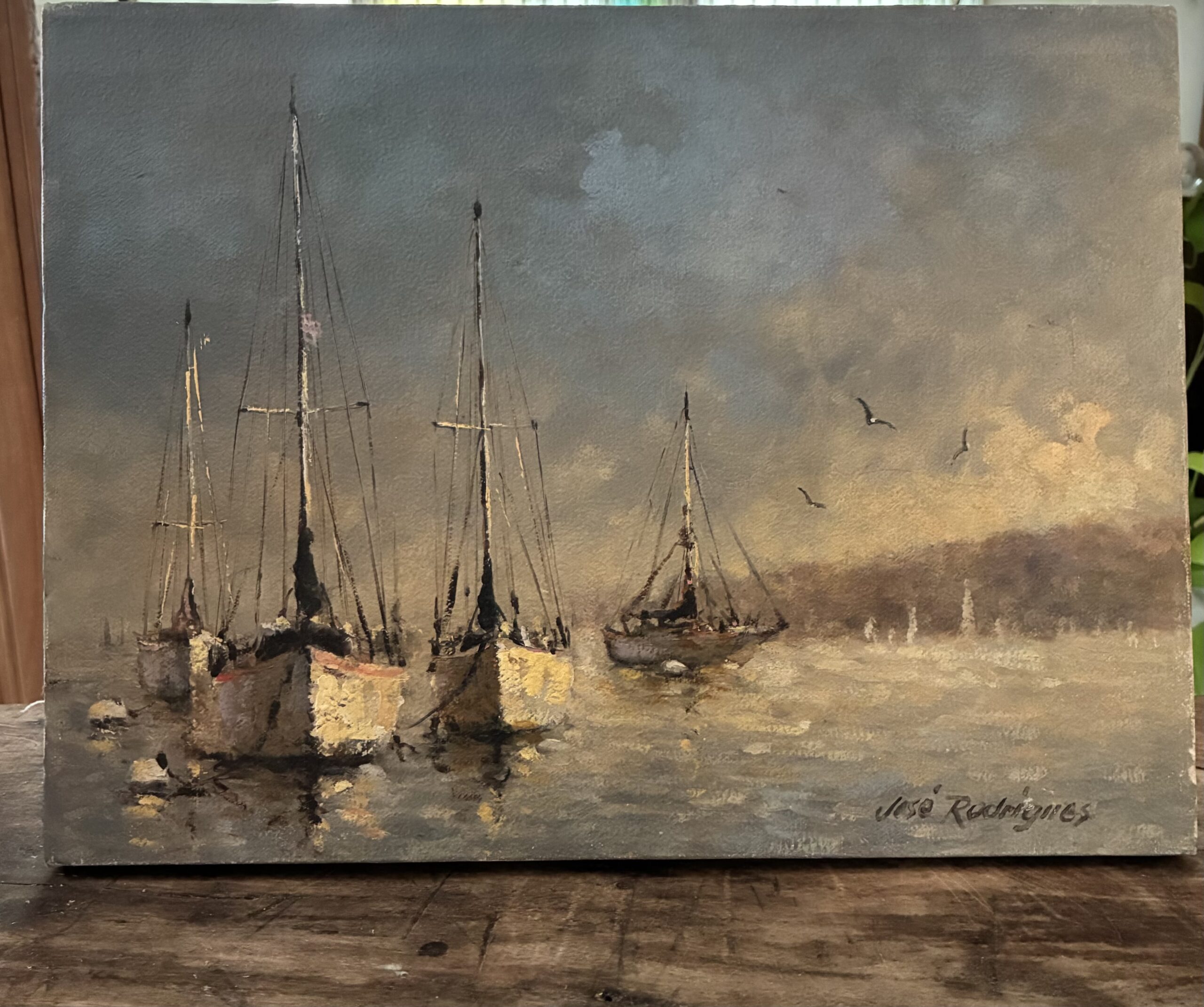 Original signed oil painting shows a moody after the storm seascape of San Diego Bay.