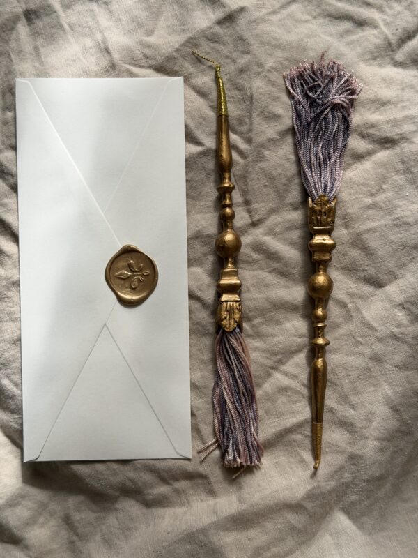 Each piece from the Winter 26 Poets’ Parlour Collection will include an artisan ornament trimmed in vintage ribbon & accompanied by a sachet of balsam and lavender. A small lagniappe, in the tradition of old-world shopkeepers who tucked a little extra into every parcel as a gesture of goodwill.