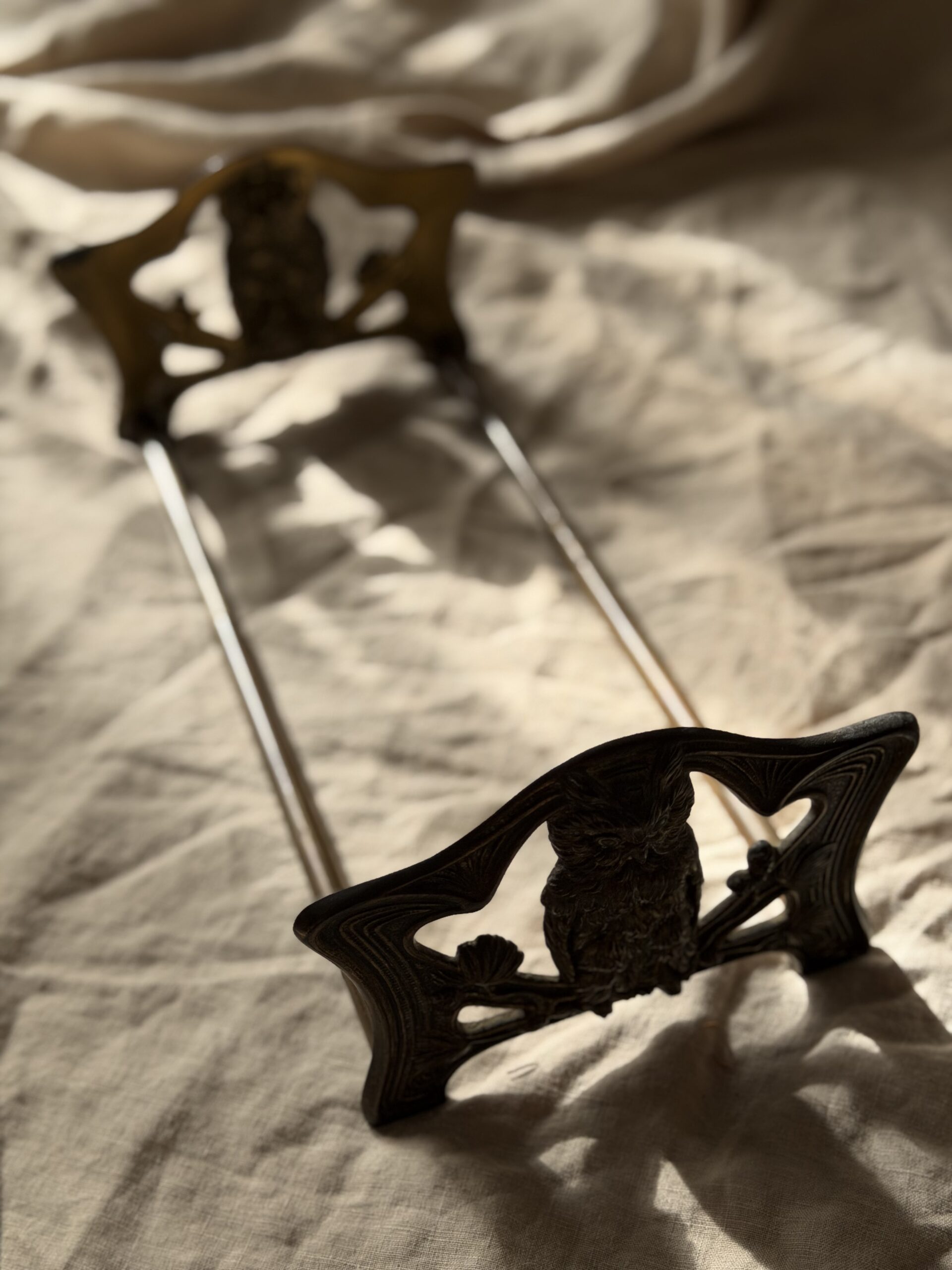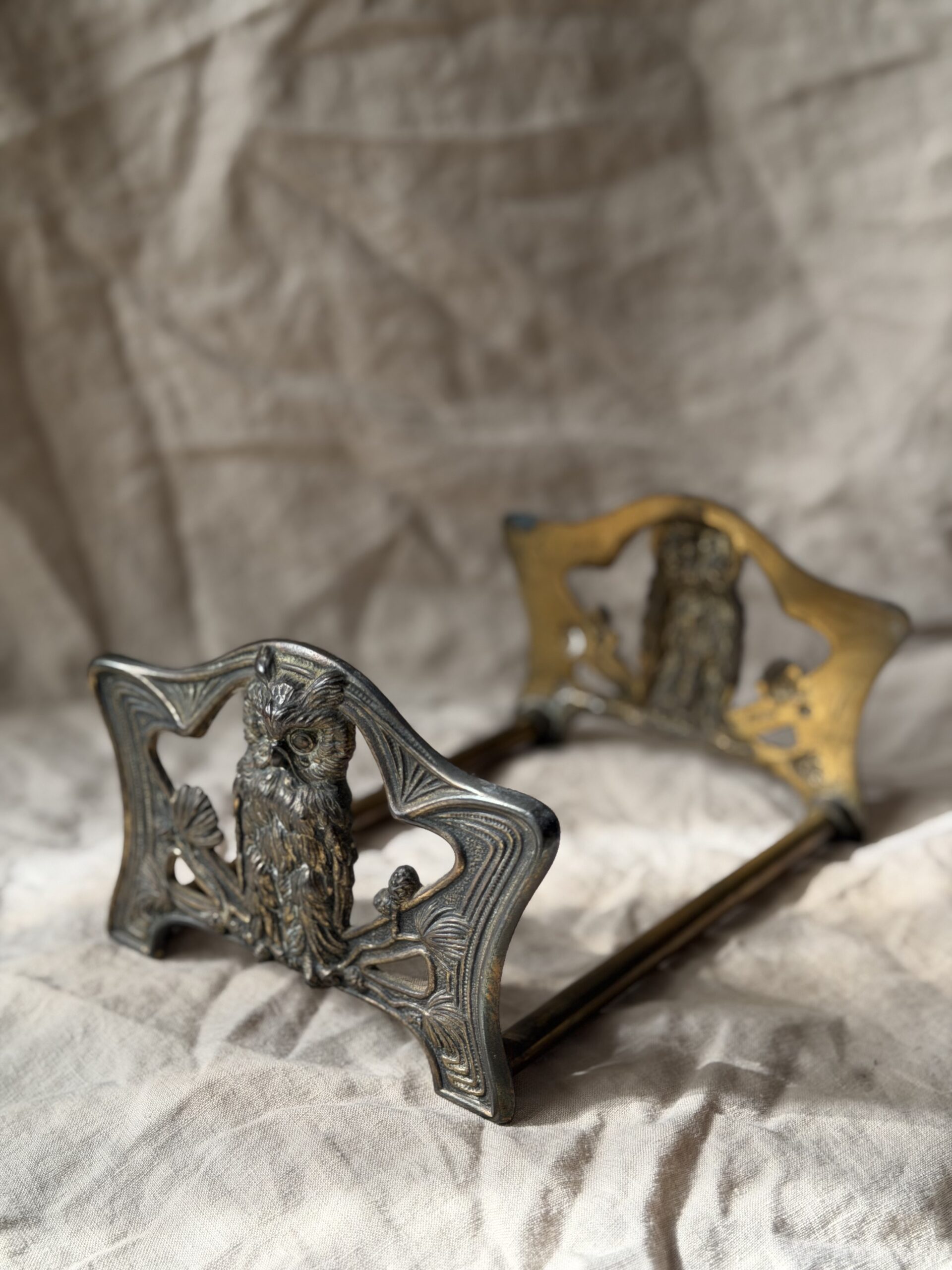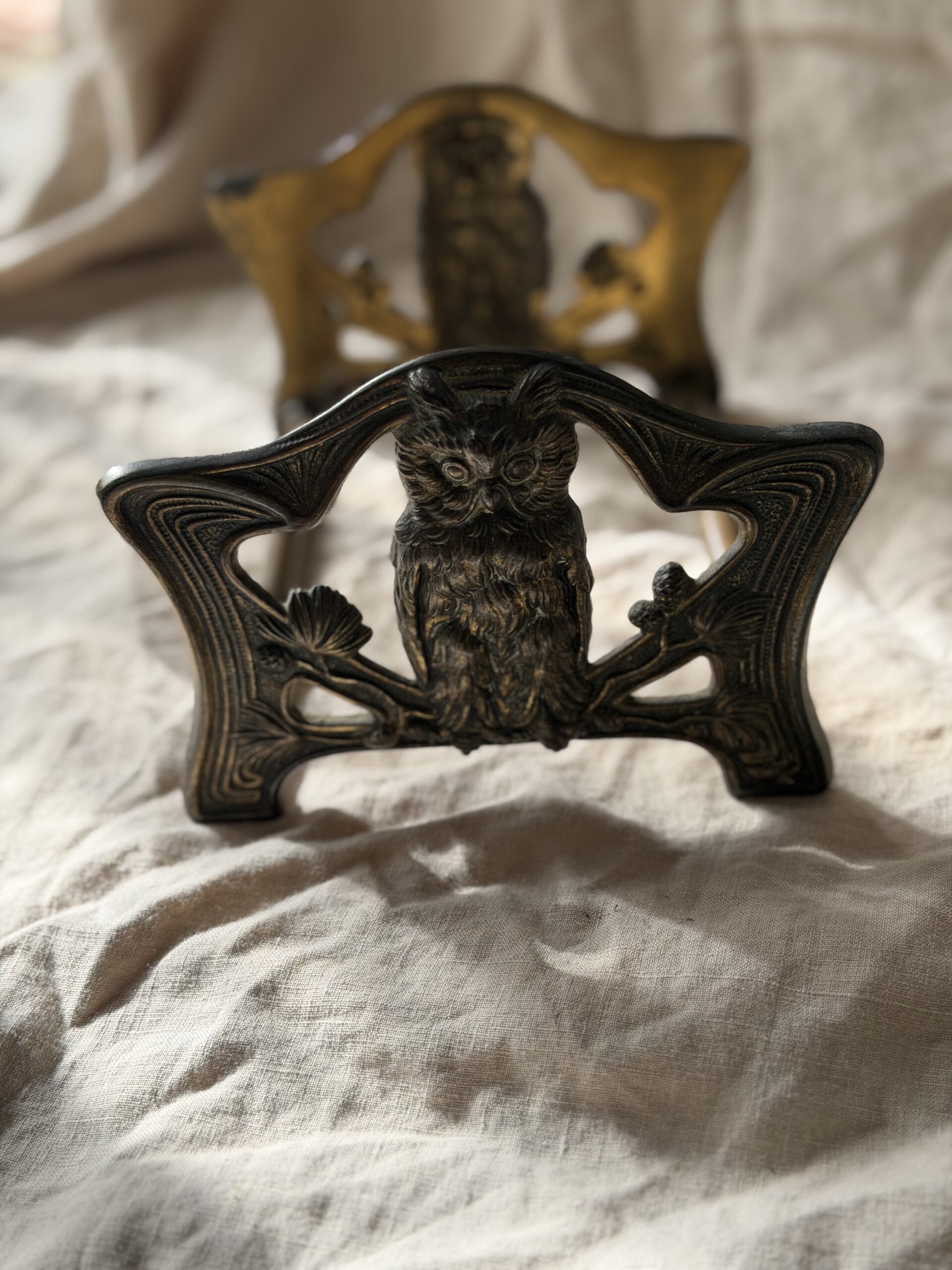 An owl framed by flowing organic curves and nature inspired motifs graces the ends of this beautiful expandable book rack. It is adorned by a time-worn patina and feels lifted from an old library lit by lamplight.