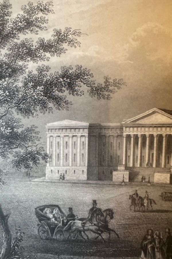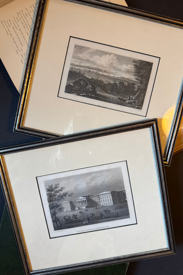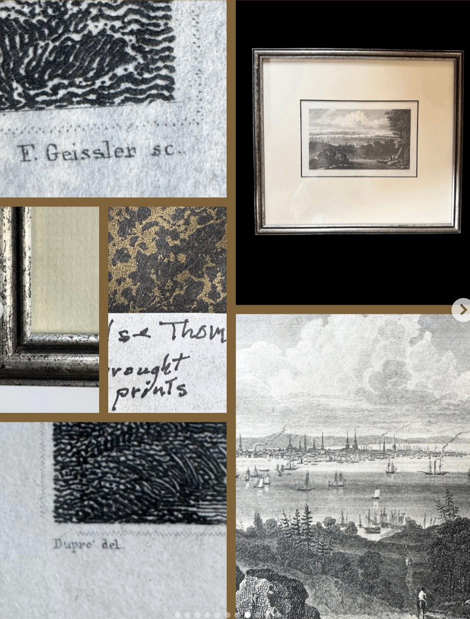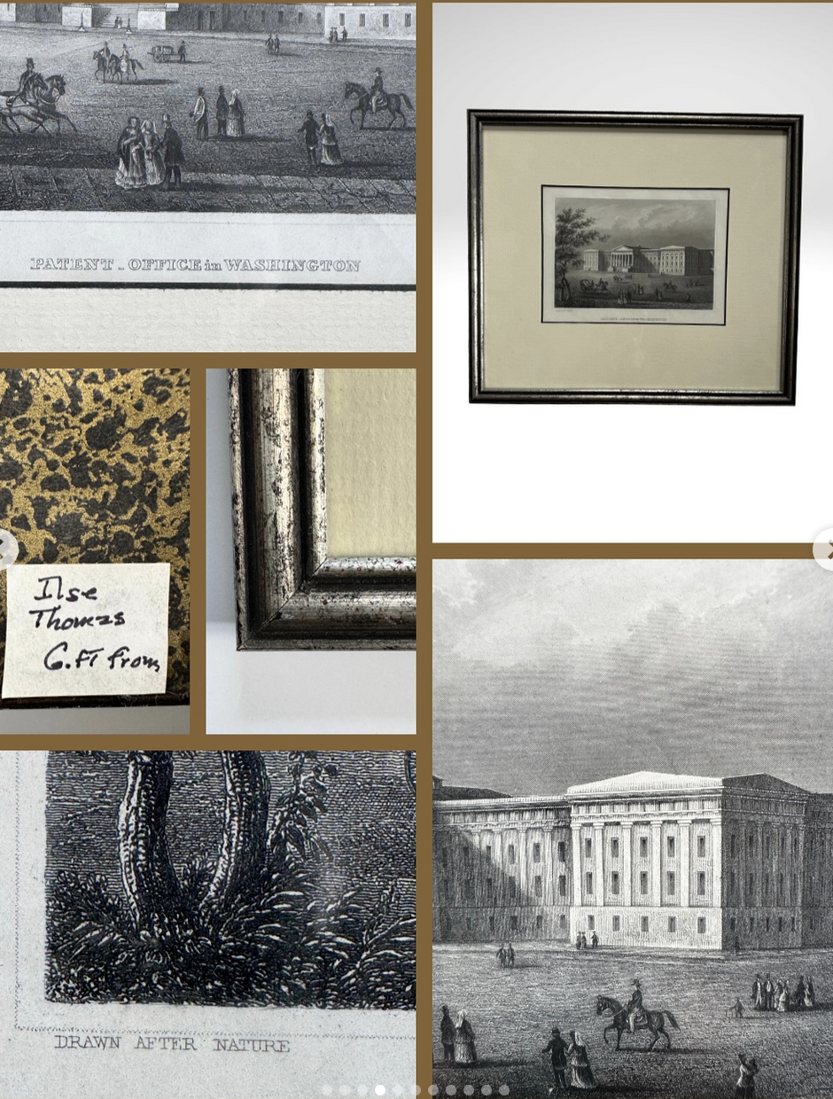 A pair of two beautiful black and white engravings: New York and Patent Office in Washington. The drawing “New York” was created by French landscape artist, Jules Dupré, and engraved by Friedrich Geissler, a skilled printmaker. Although a little more difficult to research, I believe the steel cut engraving of the “Patent Office in Washington” is from The Scenery of the United States, printed by D. Appleton and Co. Both are mounted under a cream colored mat with a black bevel and in a silver tone “antiqued” wooden frame. Decorative mottled gold and black backing paper and a frame shop foil sticker on the back. Each has wire and they are ready to hang. Measures 11 x 12.5 inches with a horizontal orientation. Such a beautifully classic look at a great price! Shipping is included in the price, but only within the contiguous US