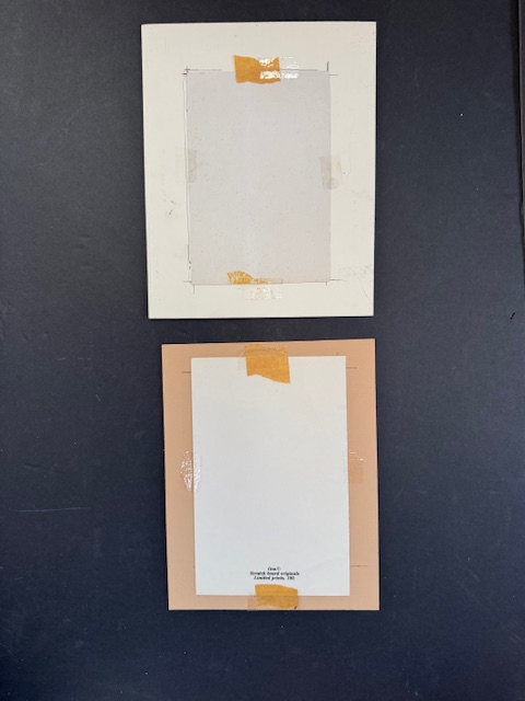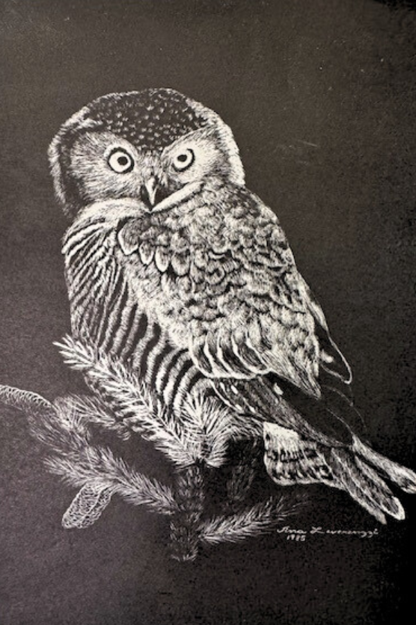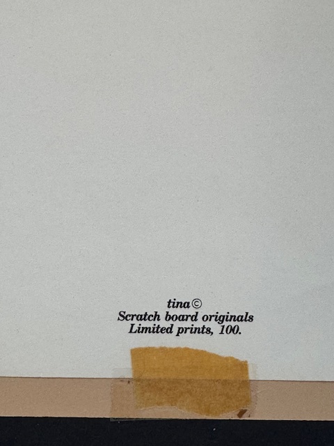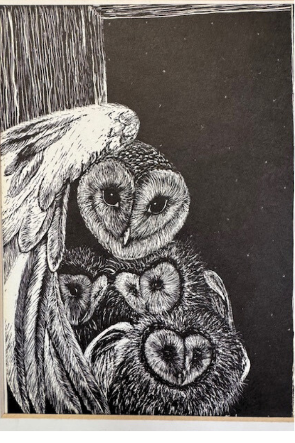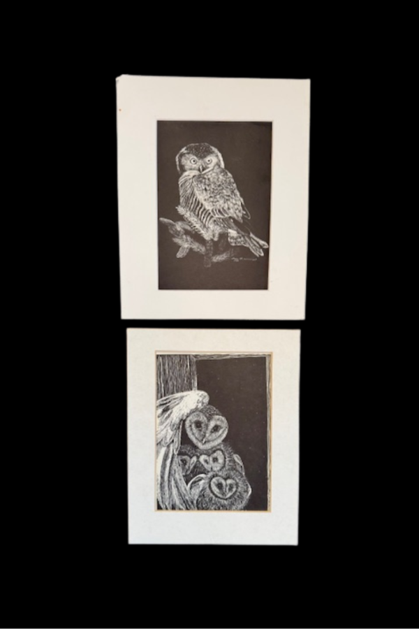 A pair of ink scratch board owl prints taped to white mats. The mats are worn and would probably be best replaced. One marked with artist studio. So cute framed for Halloween or year round. Each measures roughly 5 x 7 and 5.5 x 8.5 inches (prints only, not mats) Shipping is included but only within the contiguous US.