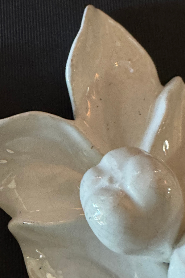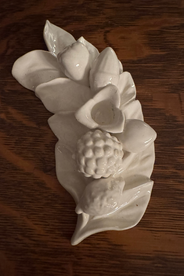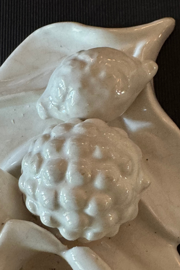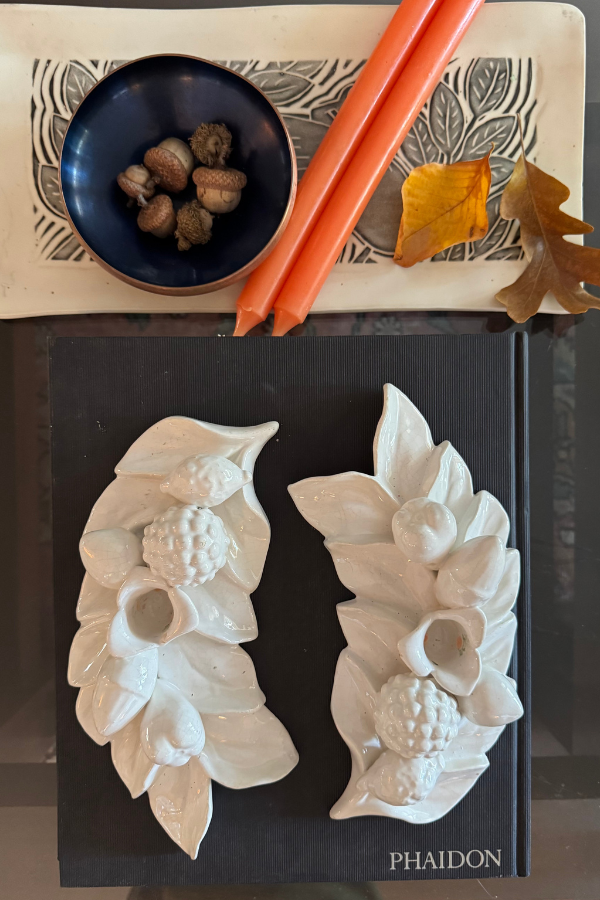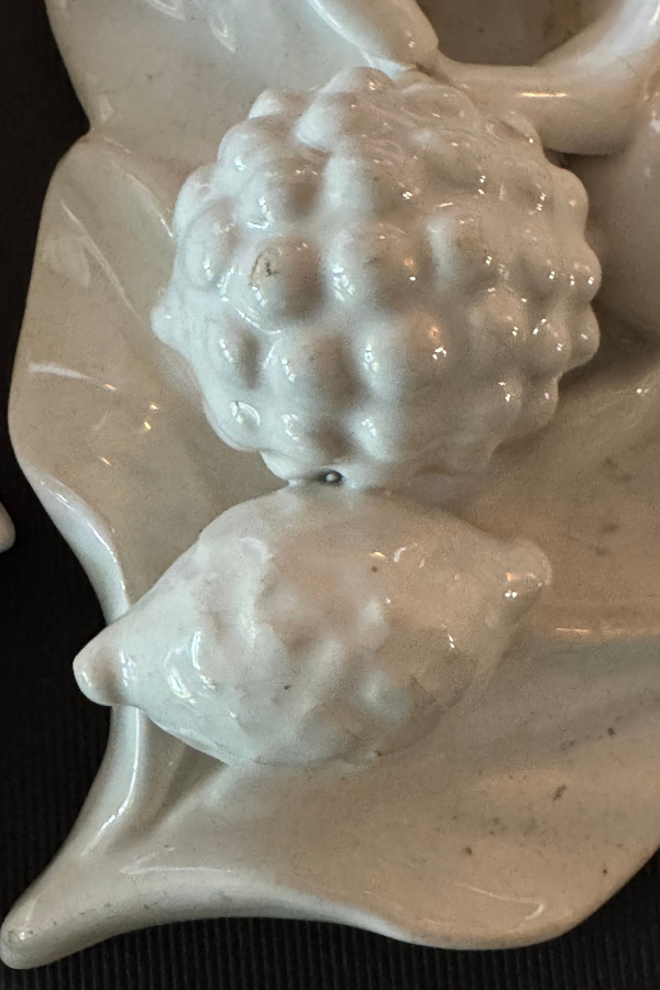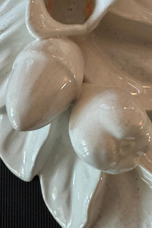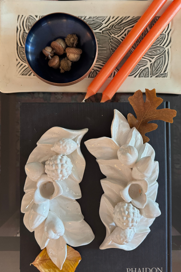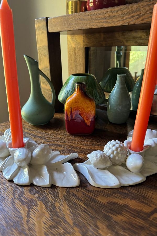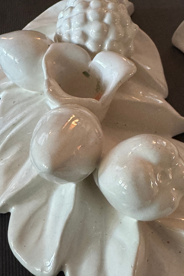 Beautiful pair of white ceramic candle holders with leaves,acorns, fruit design. The pair is not marked. Look to be in good vintage condition. Take a standard taper. Beautiful as part of your tablescape or a gorgeous table accent. Pair with ironstone, white china, and add the colors of the season. Shipping is included with this listing but only within the contiguous US