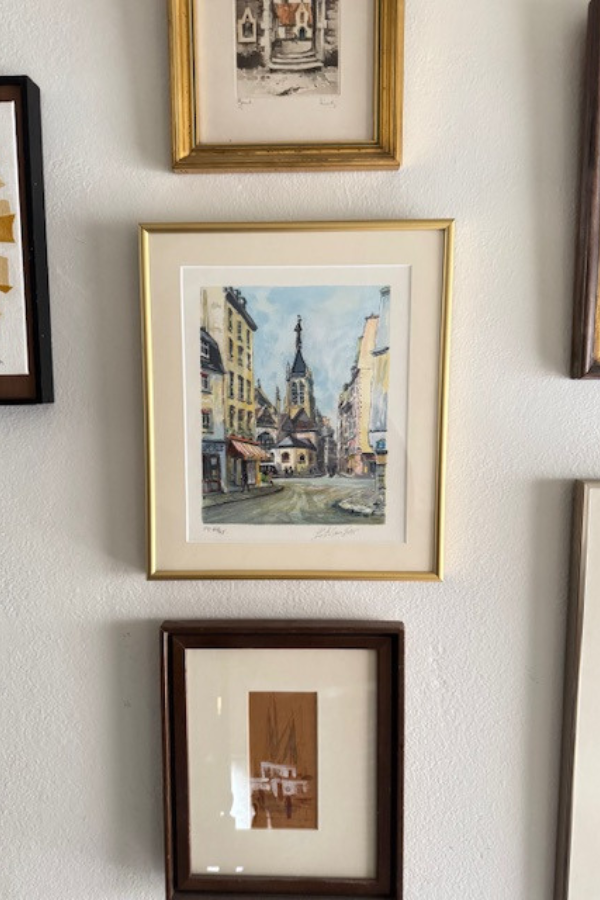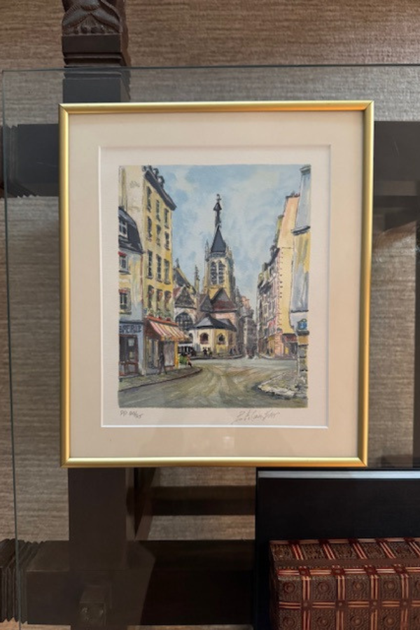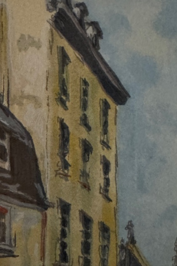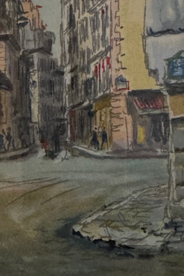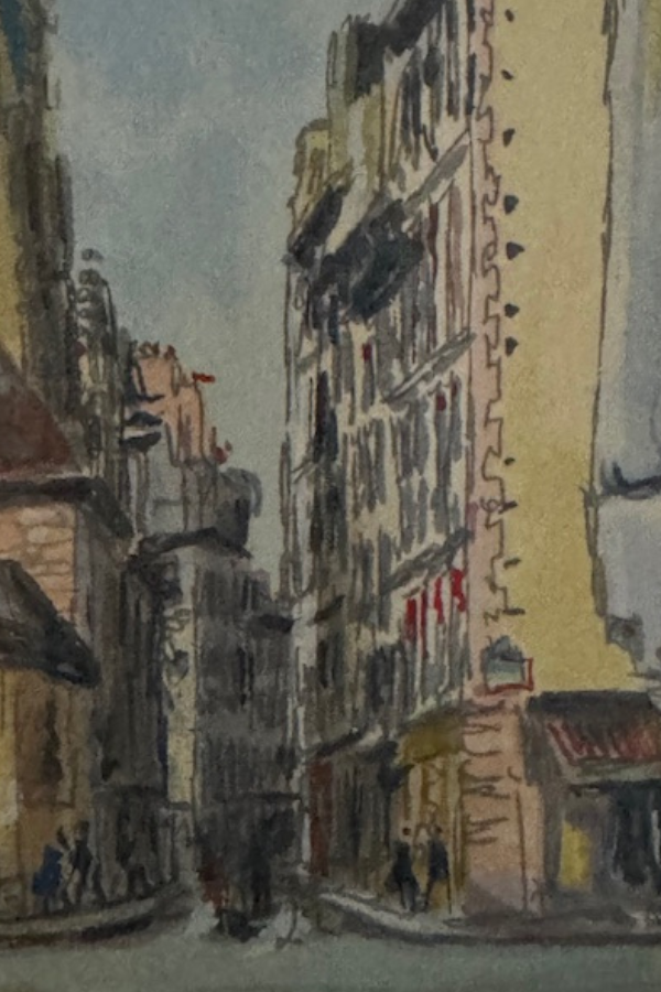 Watercolor of Parisian cityscape by French artist Pierre Eugène Cambier (1914-2000). This is a signed and numbered Printer’s Proof. Cambier was known for his watercolor paintings of French cityscapes, waterways, and countrysides, particularly scenes of Paris. He began publicly exhibiting his work in Paris in 1948 at the Salon des Indépendants. His work was also included in the annual Salon d’Automne exhibition from 1953 to 1960. The print is matted and inside a gold-tone metal frame with wire on the back, ready to hang. The framed print measures 12 x 14 inches. Shipping is included with this listing but only within the contiguous US.