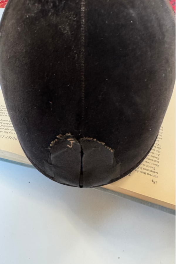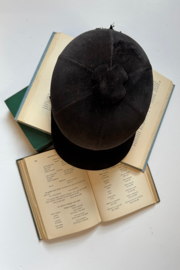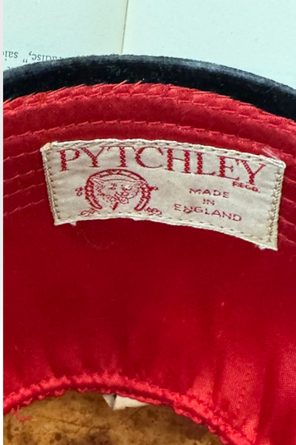 Black velvet riding hat by English manufacturer Pytchley. Burled wood (maple?) construction, red lining. Size 7 1/4. A few imperfections in velvet (age-related). Even if you don’t use this, it makes the perfect accessory for an English Country/ Ralph Lauren Style decor. I’d think about displaying it on the corner of a headboard or chair, or even adding to a gallery wall. Shipping is included, but only within the contiguous US
