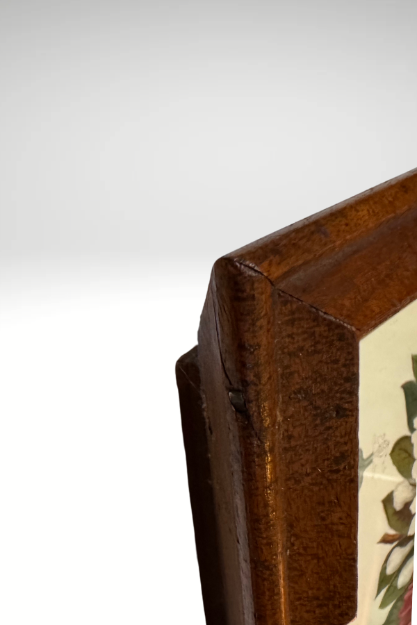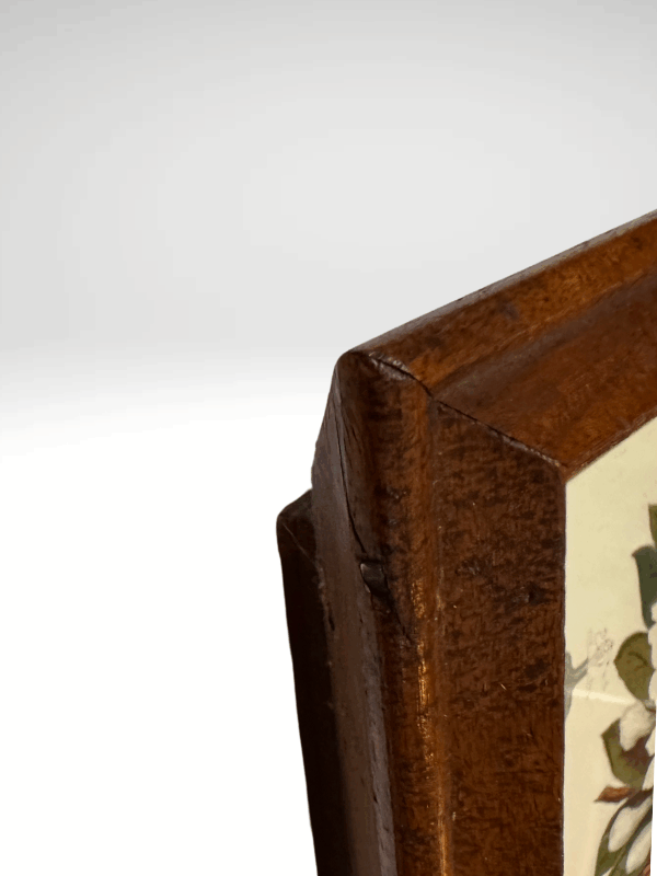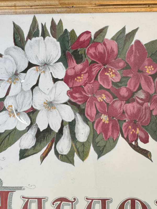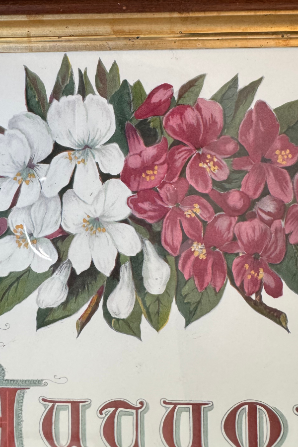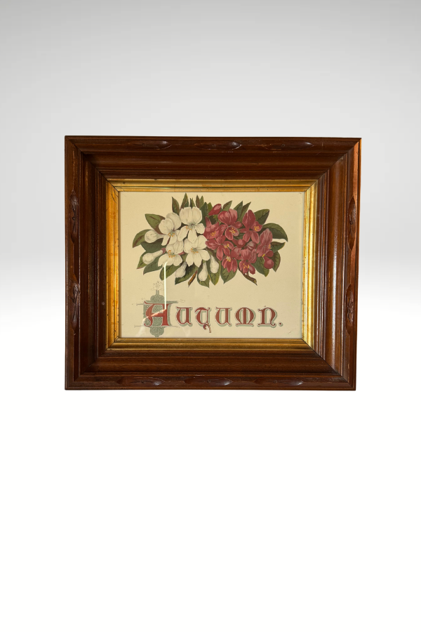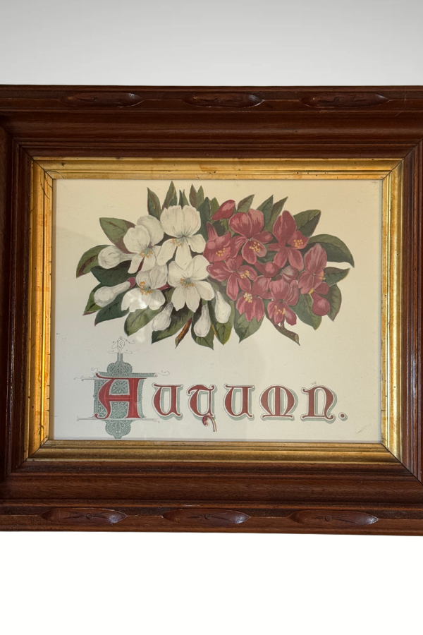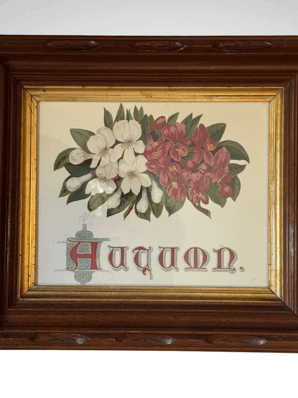Beautiful framed print featuring Victorian floral spray with each Autumn underneath. Lovely font. The print is set in a gorgeous, and unique, antique wooden frame. The framed print measures 14.25 x 12.25 inches