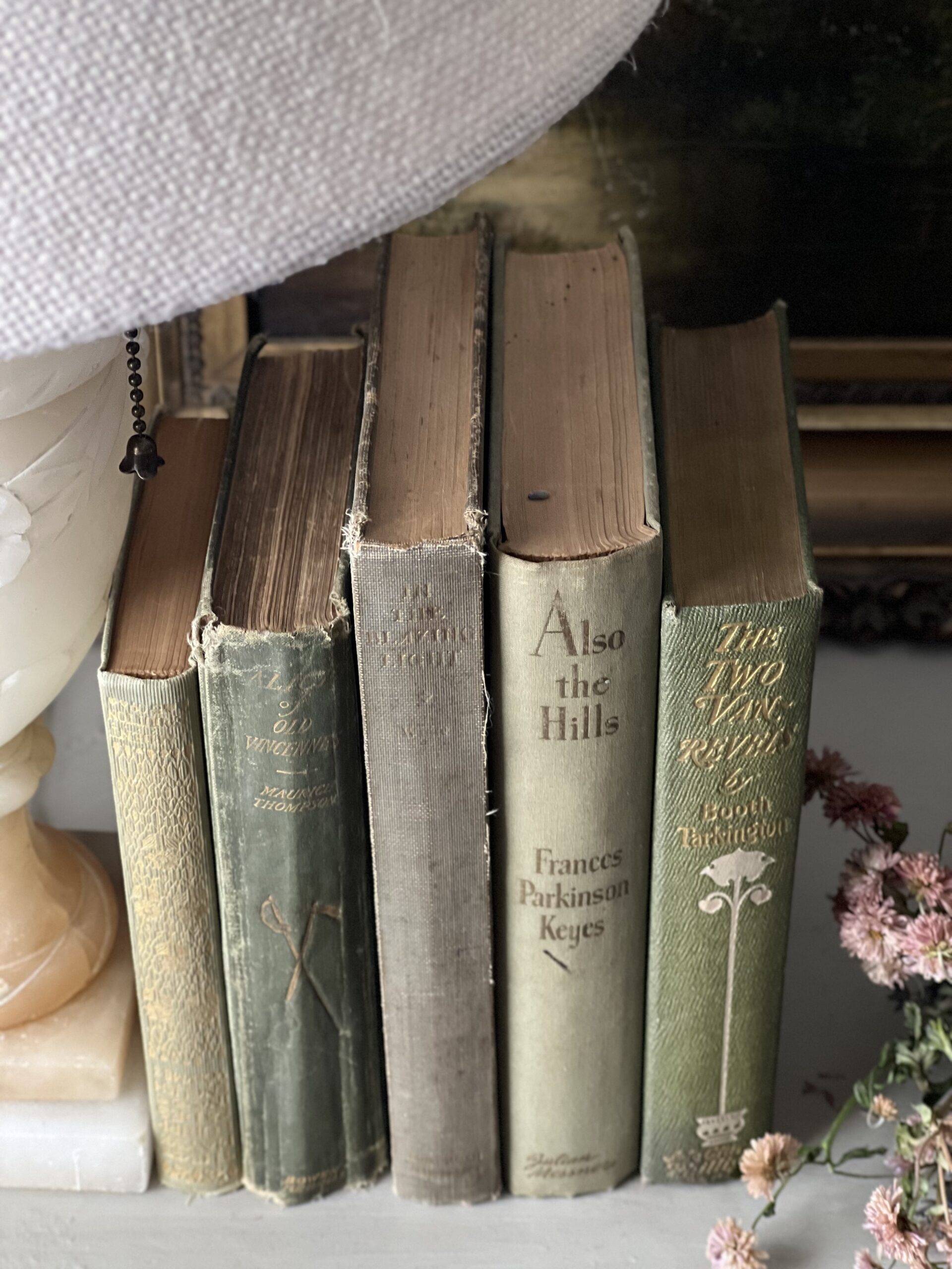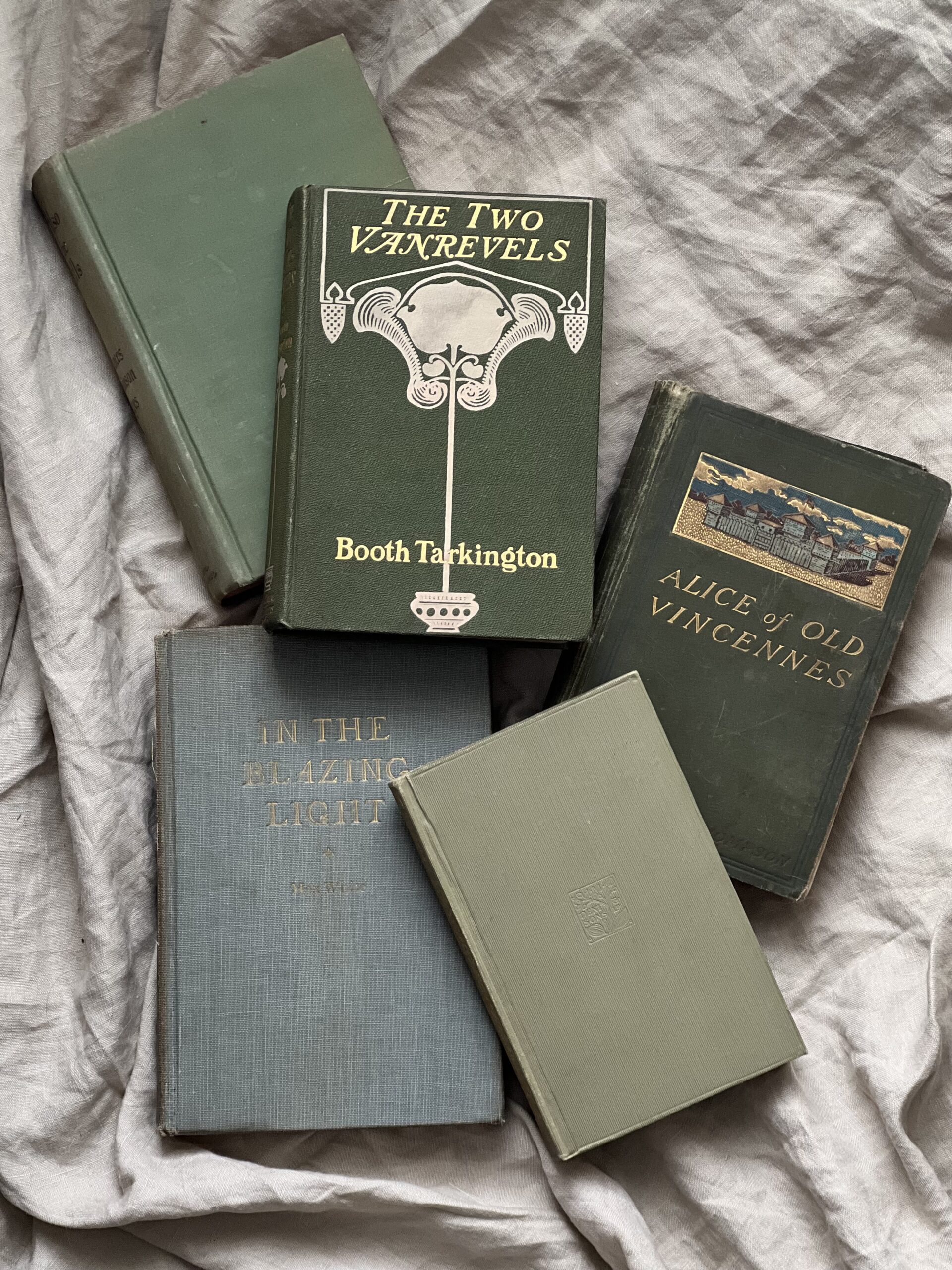 Beautiful collection of five vintage and antique books in varied shades of green. Lovely gold and cream detailing. Books are in good to moderate vintage condition with some staining, writing, library stickers, and possibly torn pages.